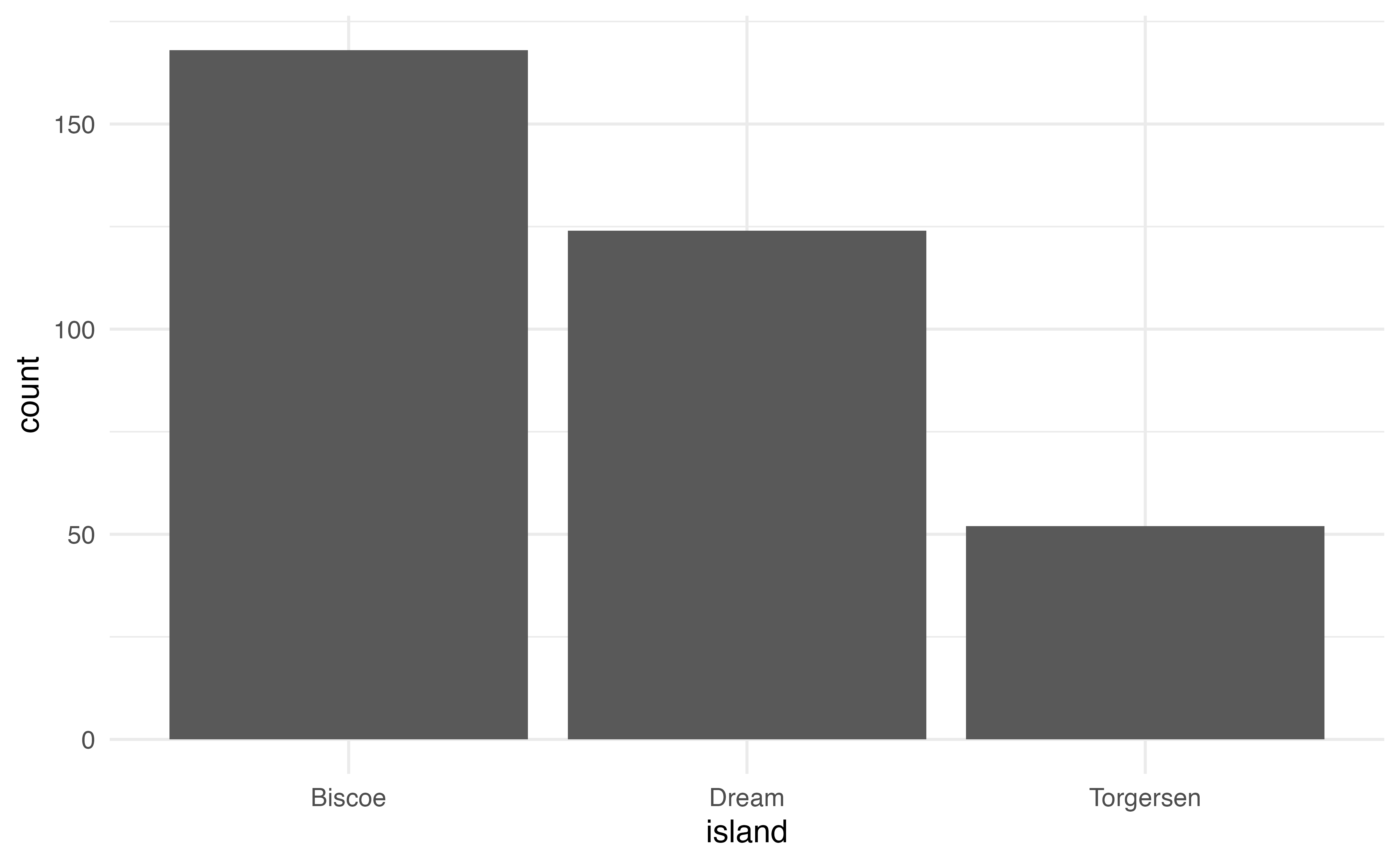 geom_density()A common plot for the distribution of a single categorical variable is a bar graph. Below are the code and output of a bar graph of the distribution of island.