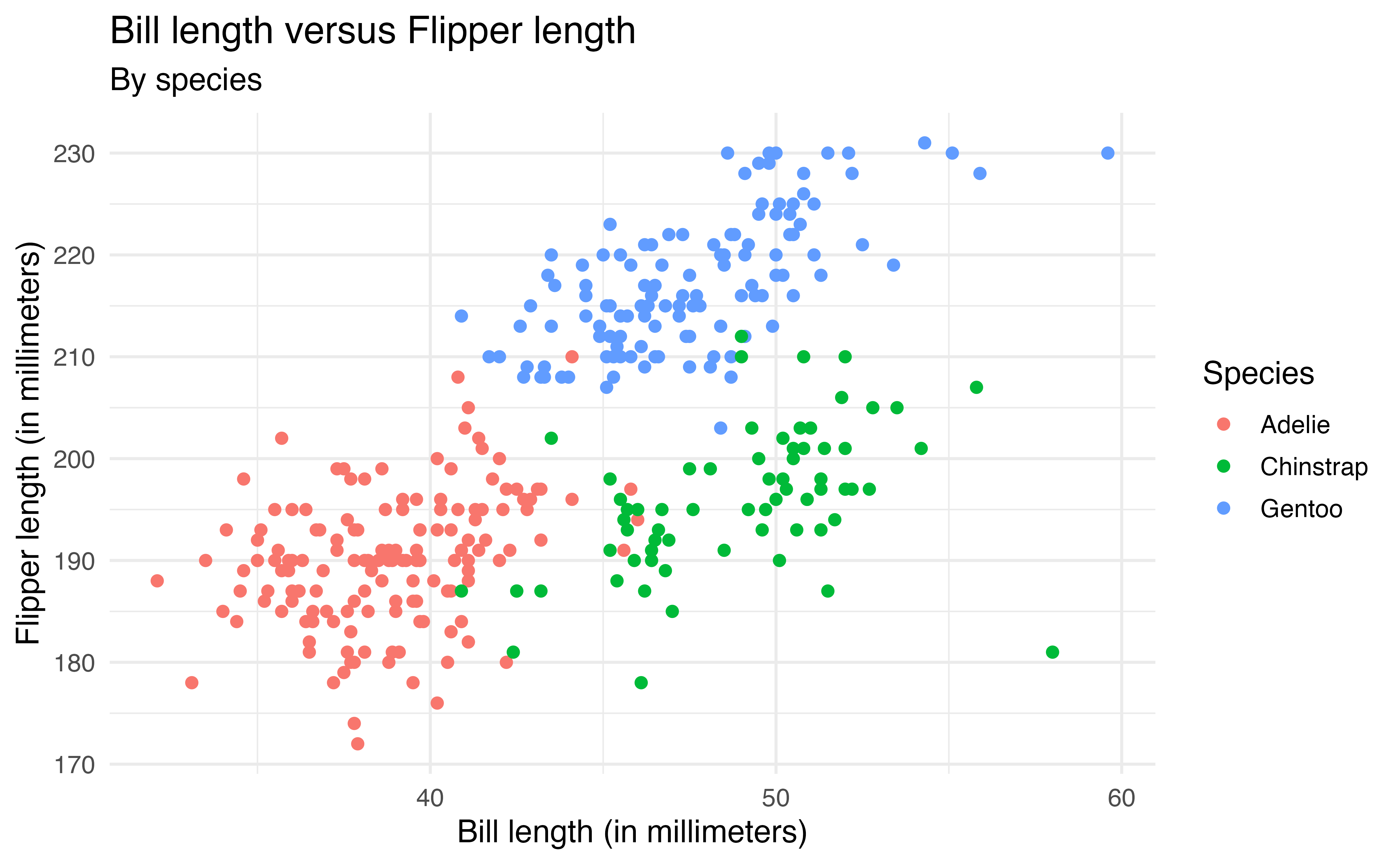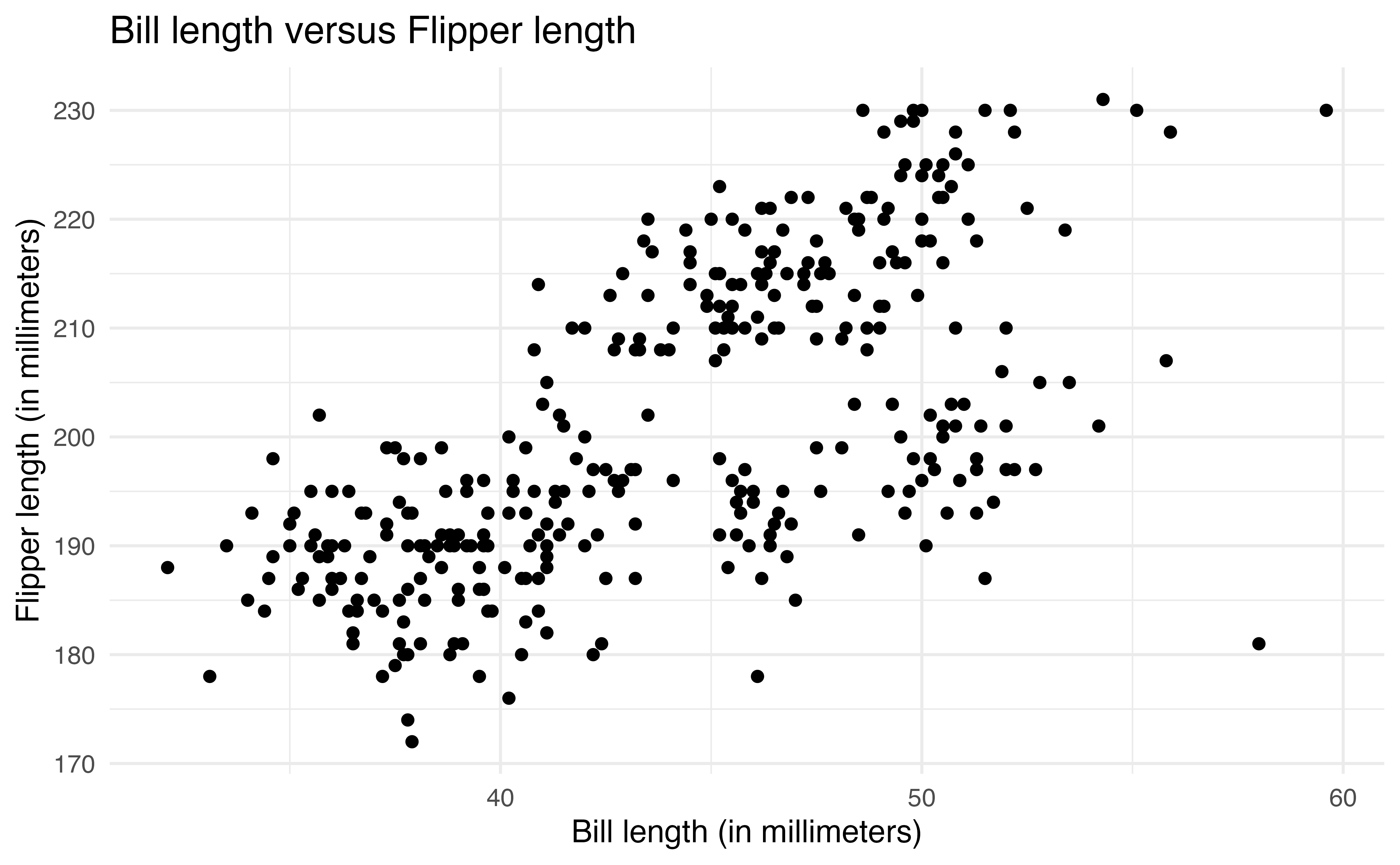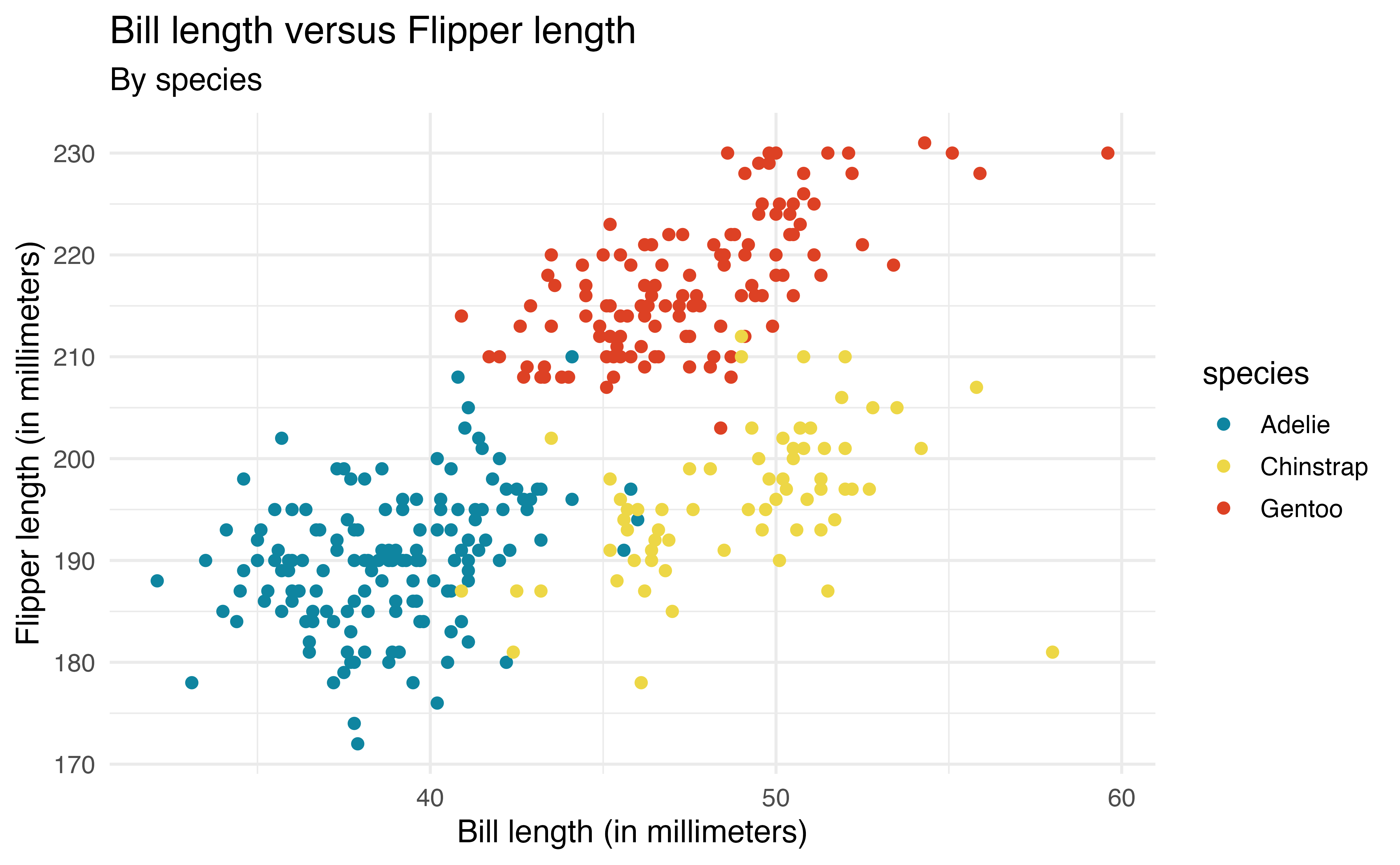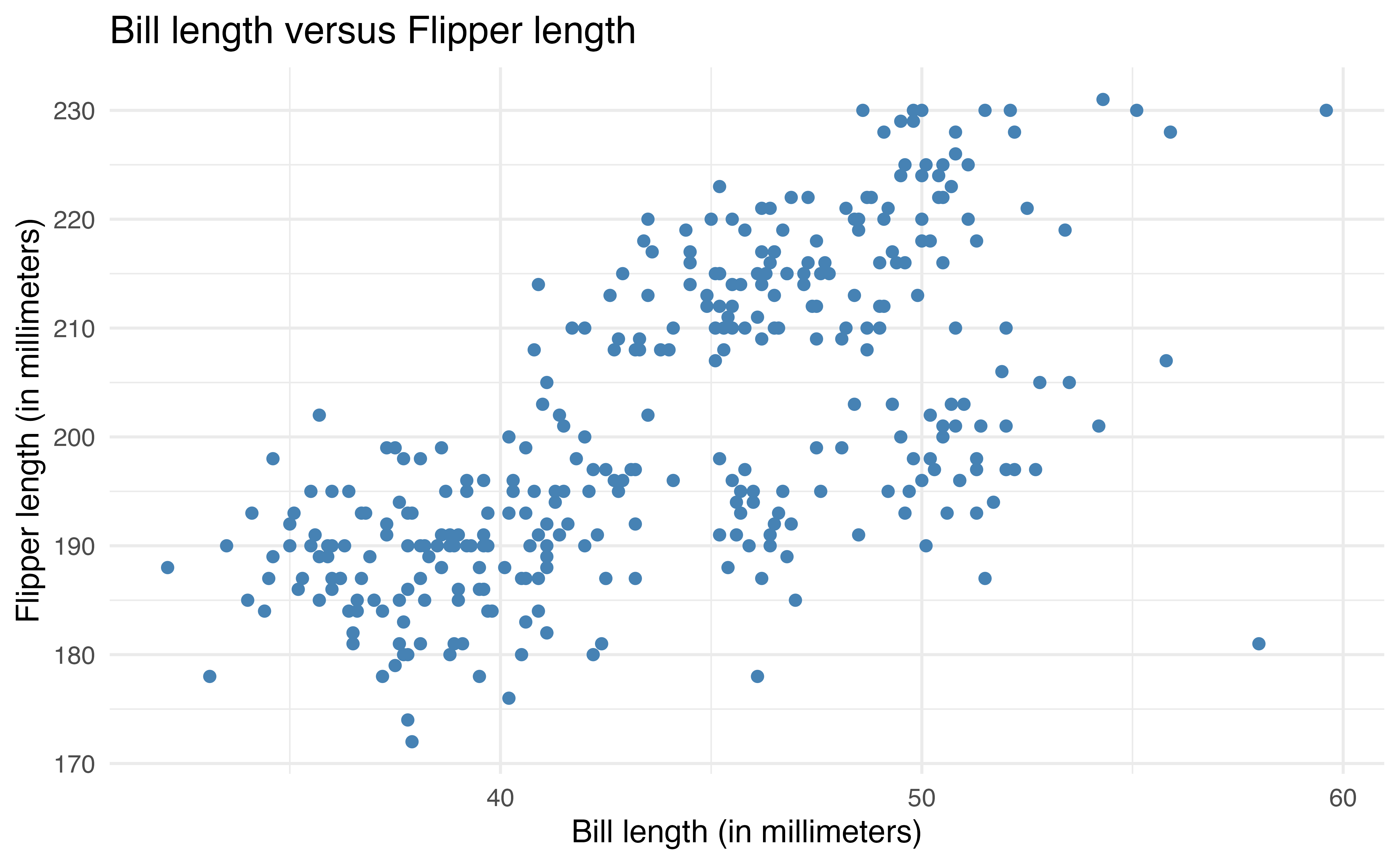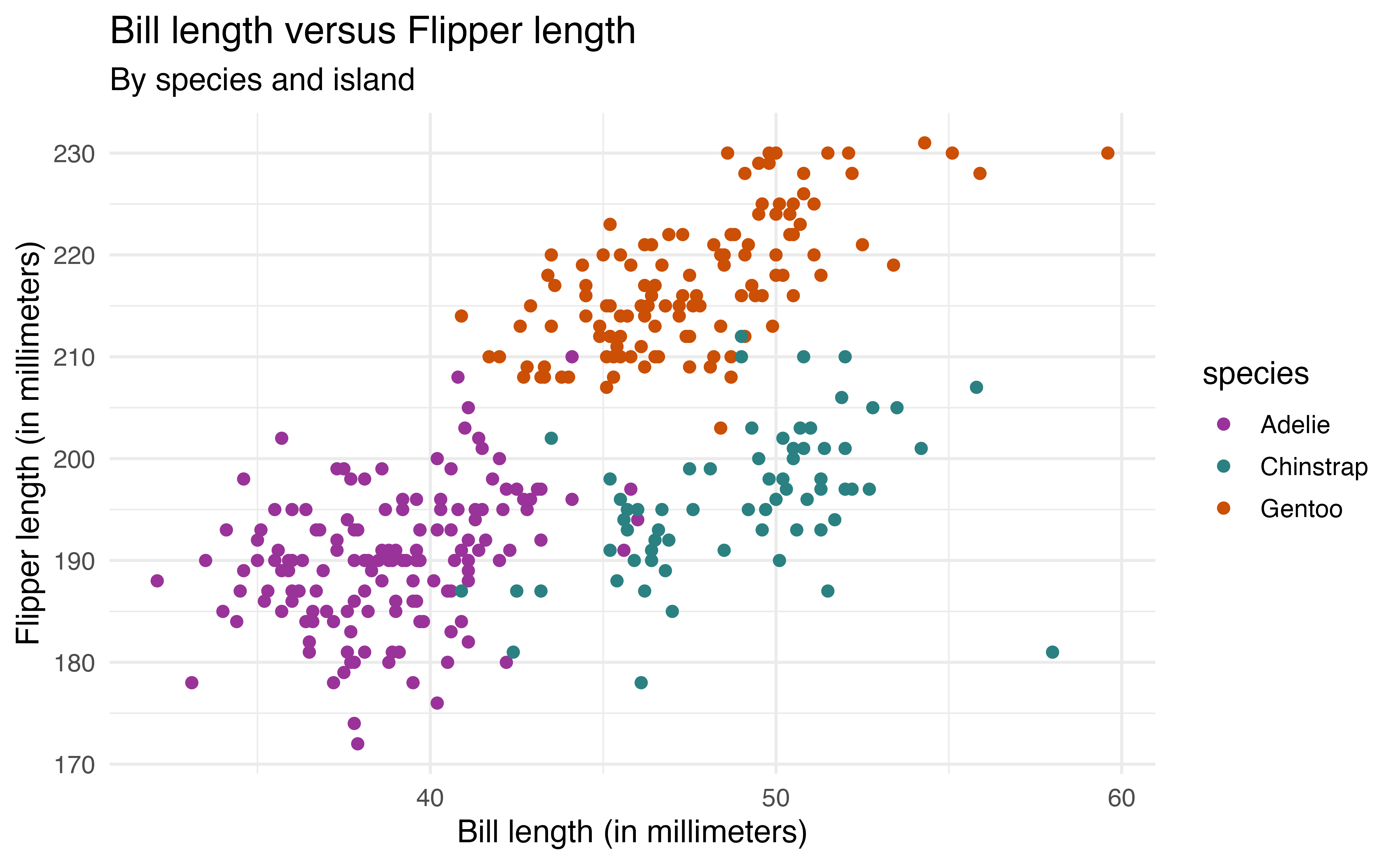title = "Bill length versus Flipper length ")2.6.2.1 Aesthetics