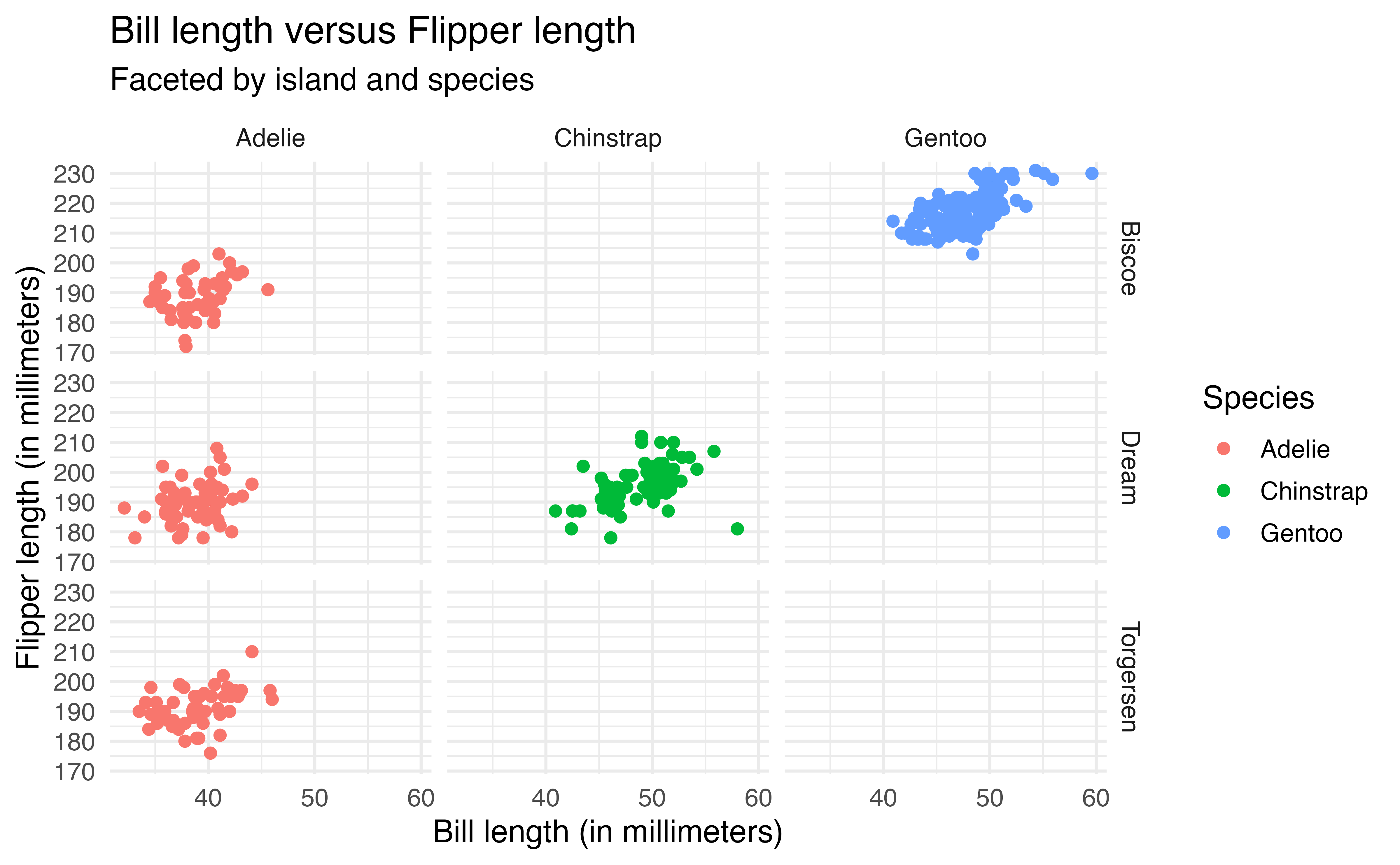 cols = vars(species))Note that facet_grid() creates a plot for every possible combination of the variables. The empty plots indicate combinations of island and species that do not exist in the data.