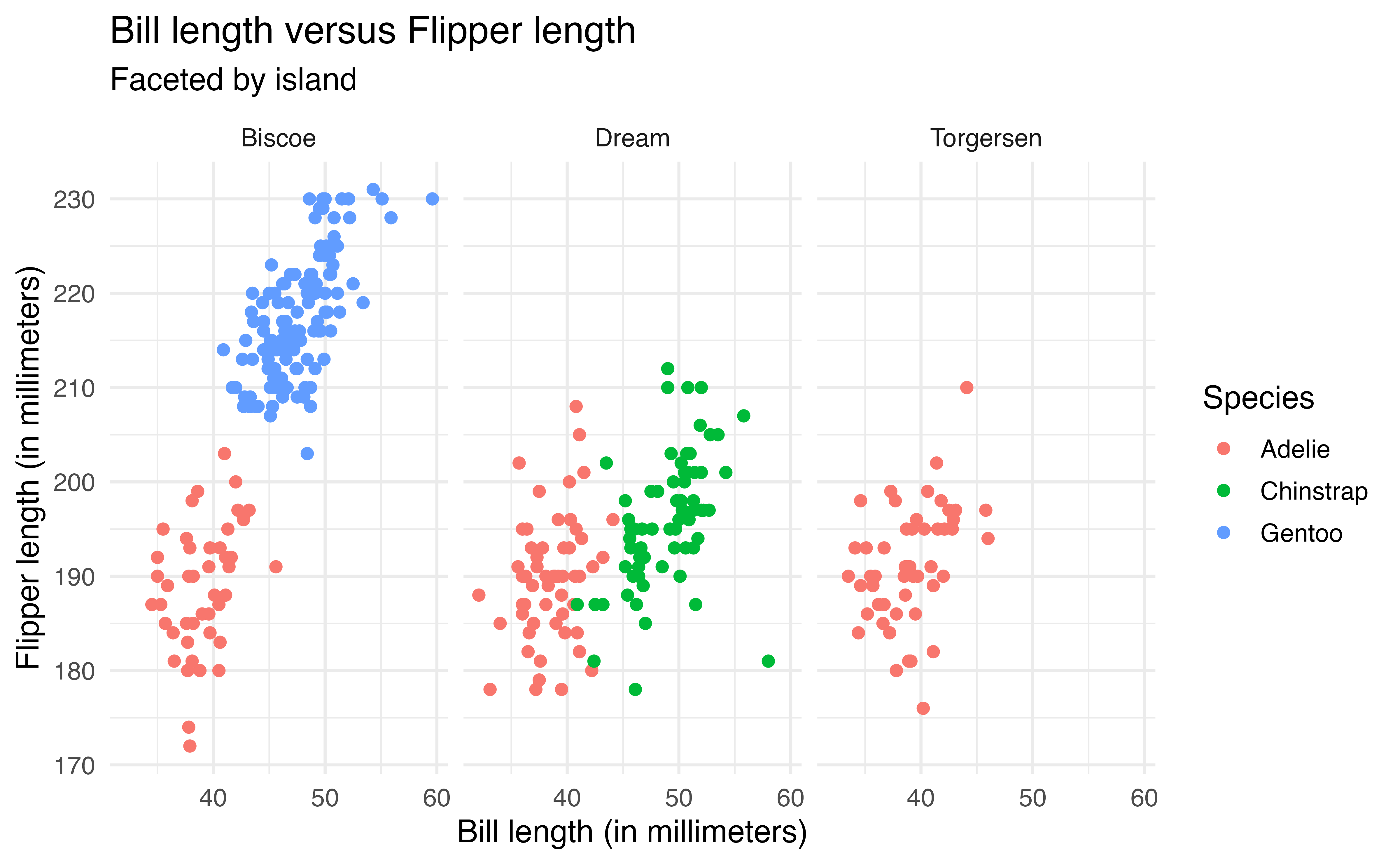 facet_wrap(vars(island))Because there is a lot of overlap across islands, the faceted plot makes it easier to see the relationship within each island and identify which species are on each island.