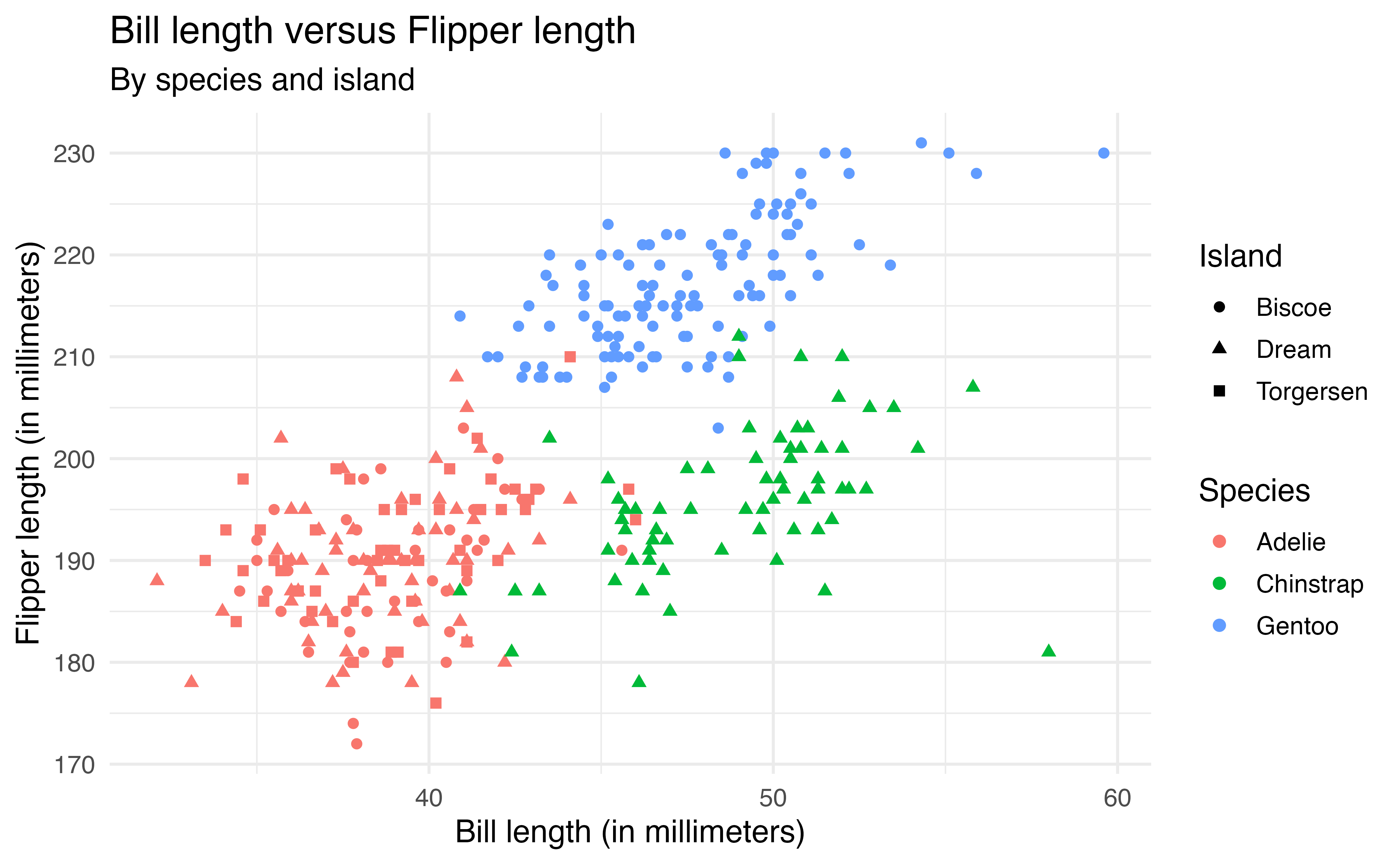 title = "Bill length versus Flipper length ")The second way to apply aesthetics is to map them to specific variables. This adds makes the visualization engaging and adds additional information about the data. This is useful in data analysis when we want to make comparisons across subgroups of data.