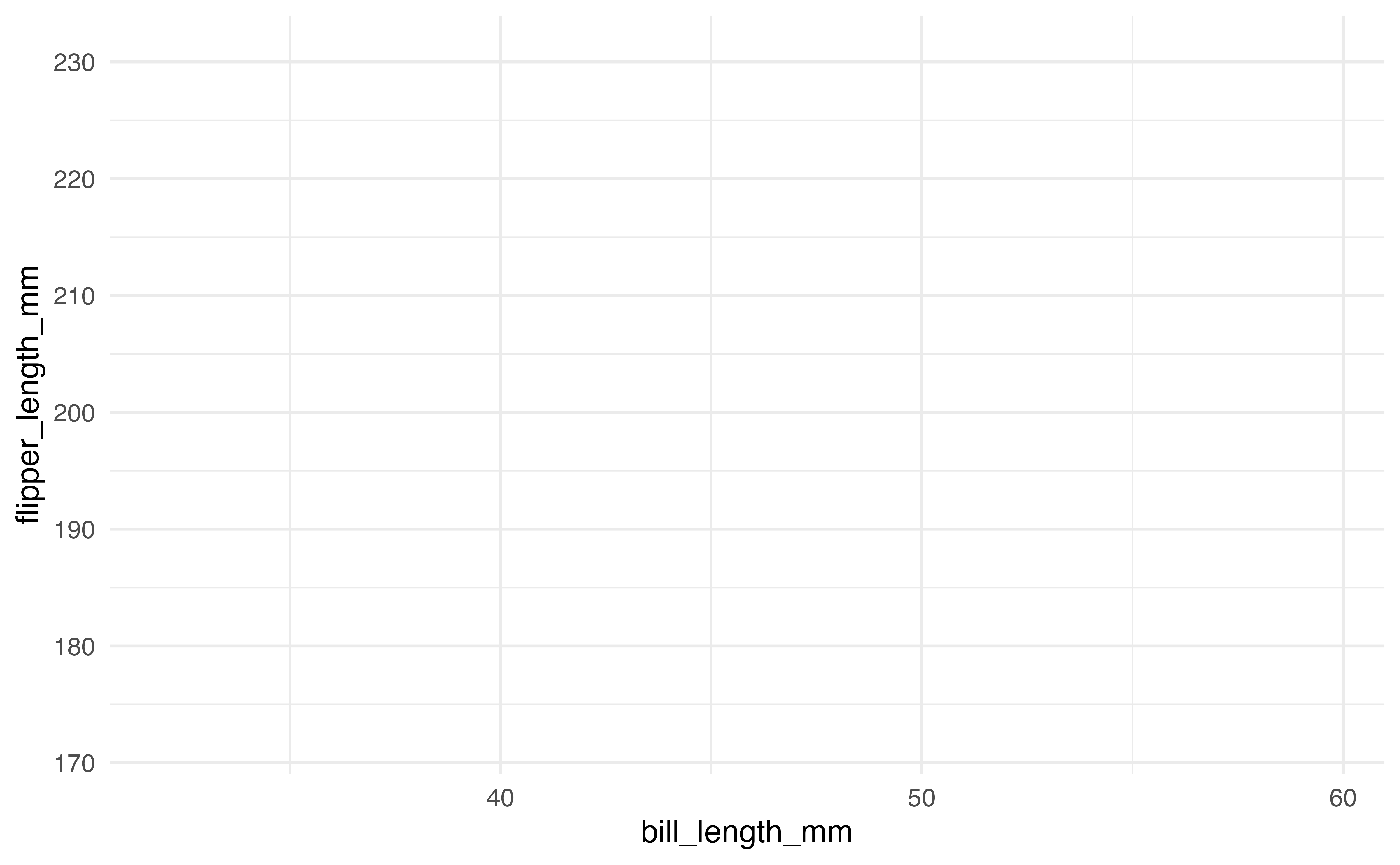 Let’s map the aesthetics such bill_length_mm is on the x-axis and flipper_length_mm is on the y-axis.