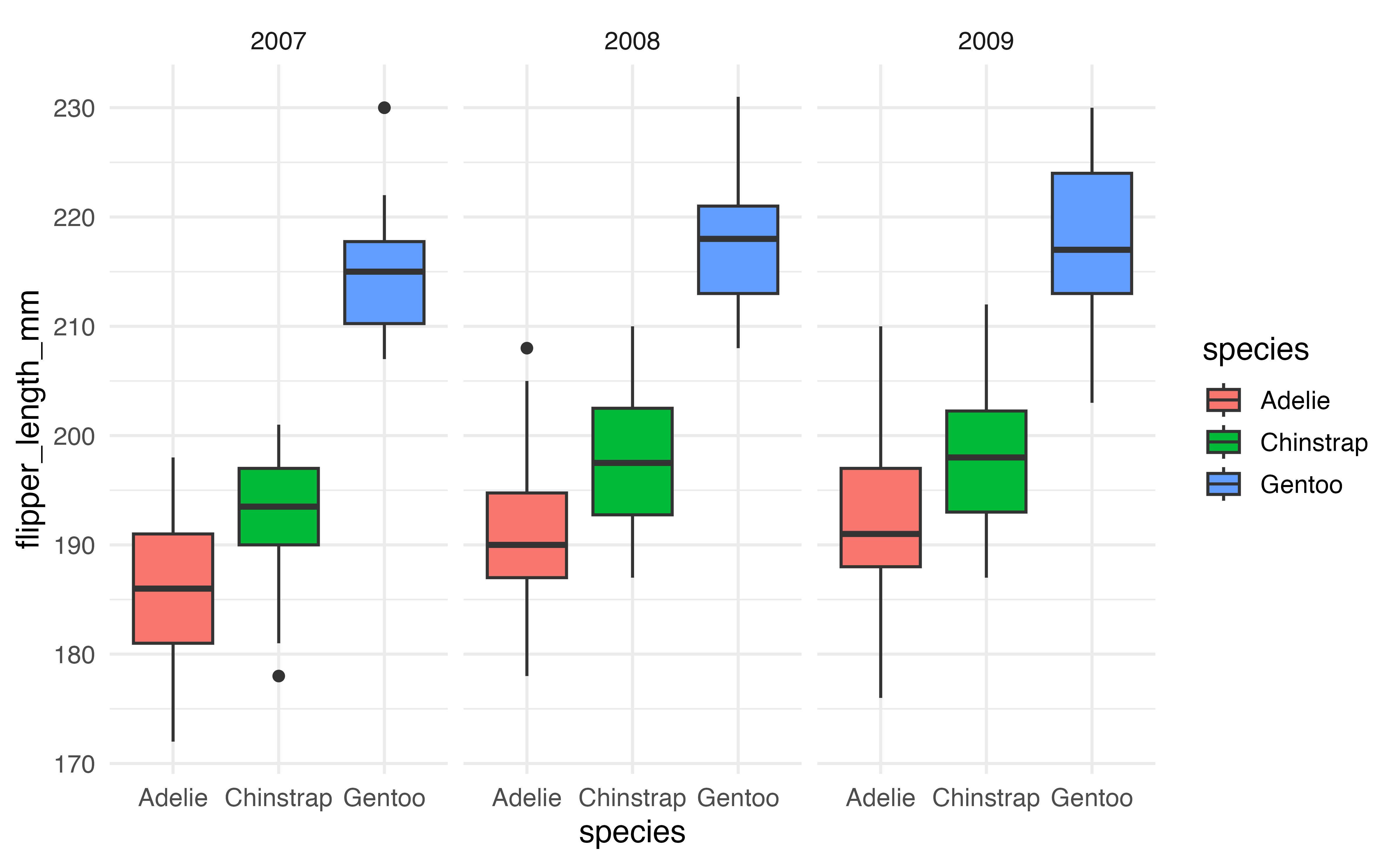 ggplot(data = penguins, aes(x = species, y = flipper_length_mm, fill = species)) + geom_boxplot() + facet_wrap(vars(year))↩︎In fact, this book was written using Quarto in RStudio!↩︎