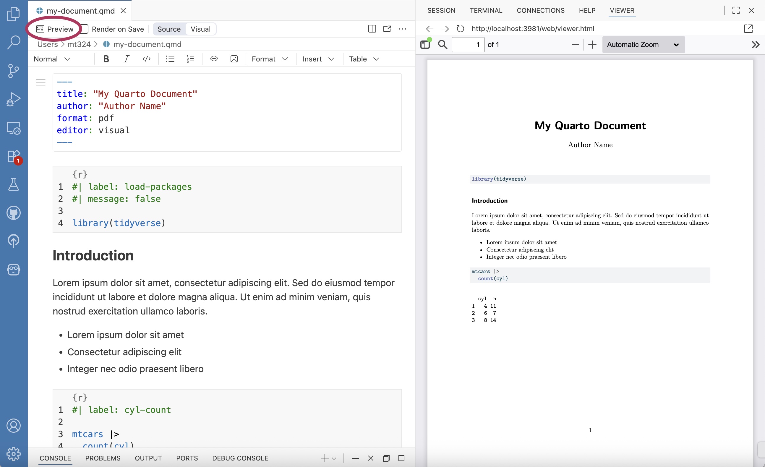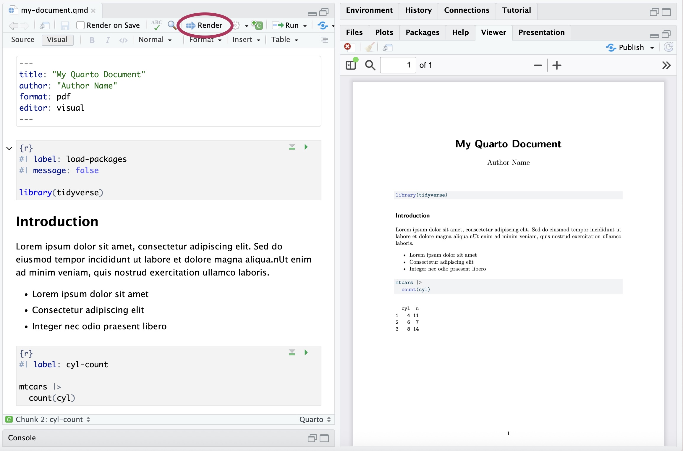Throughout the analysis workflow, we regularly render the Quarto document to see the updated results and narrative. Documents are rendered by clicking the “Render” button in RStudio (Figure 2.17 (a)) and the “Preview” button in Positron (Figure 2.17 (b)). We also see the resulting PDFs in the Viewer pane of each IDE. When a document is rendered, all code and narrative are executed sequentially from beginning to end. Therefore, all necessary code must be in the Quarto document to render properly; code in the console is not executed when a document is rendered.