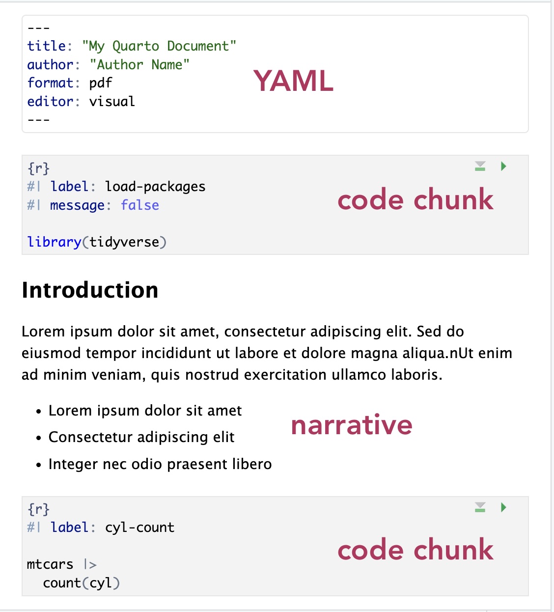 Figure 2.16 is an example of a Quarto (.qmd) document. All code, output, and narrative are in a single document, and the resulting output updates as changes are made to the document. This eliminates the need to copy and paste results from one document to another throughout the analysis, a process that is prone to error. Let’s take a look at the parts of the Quarto document in Figure 2.16.