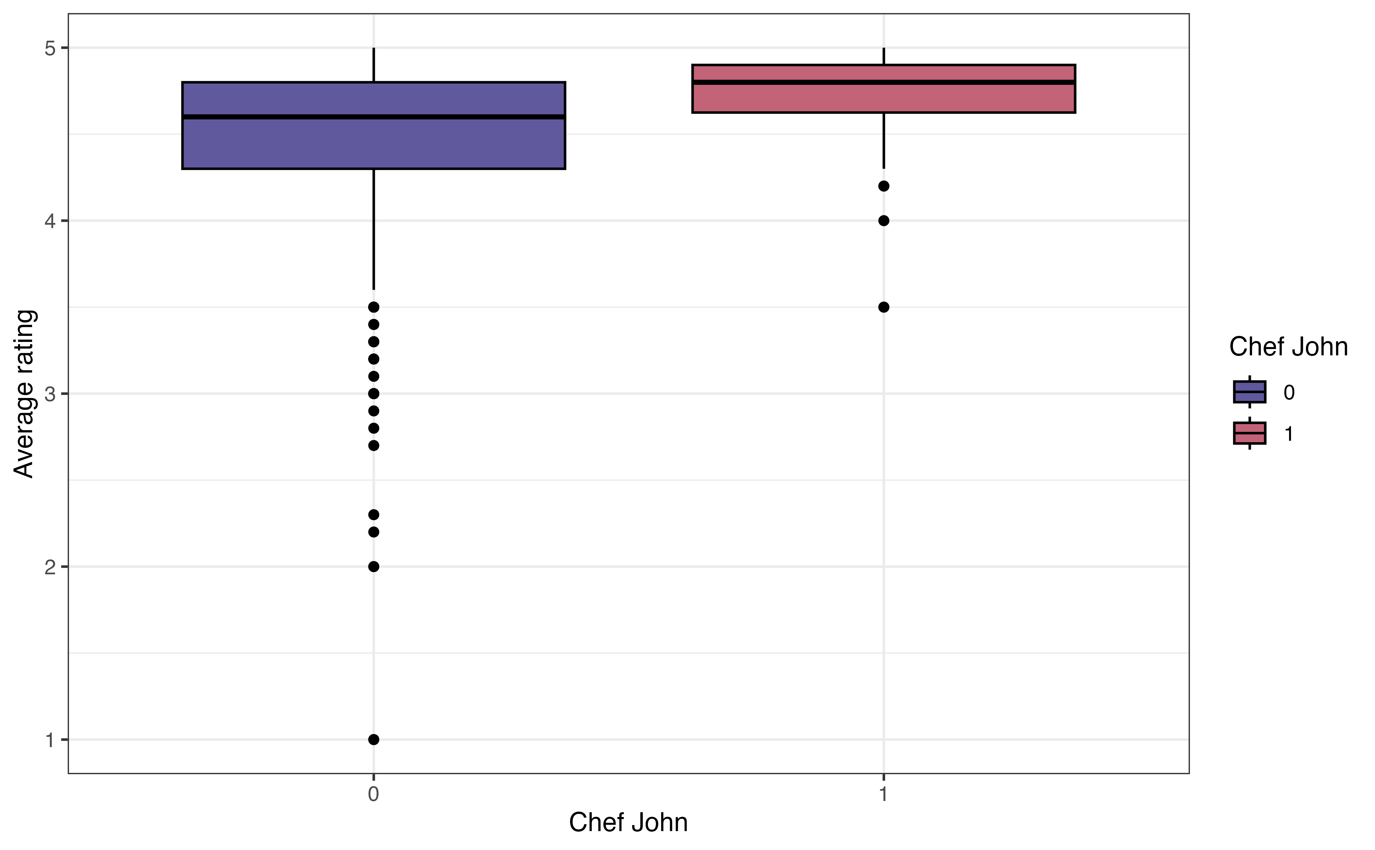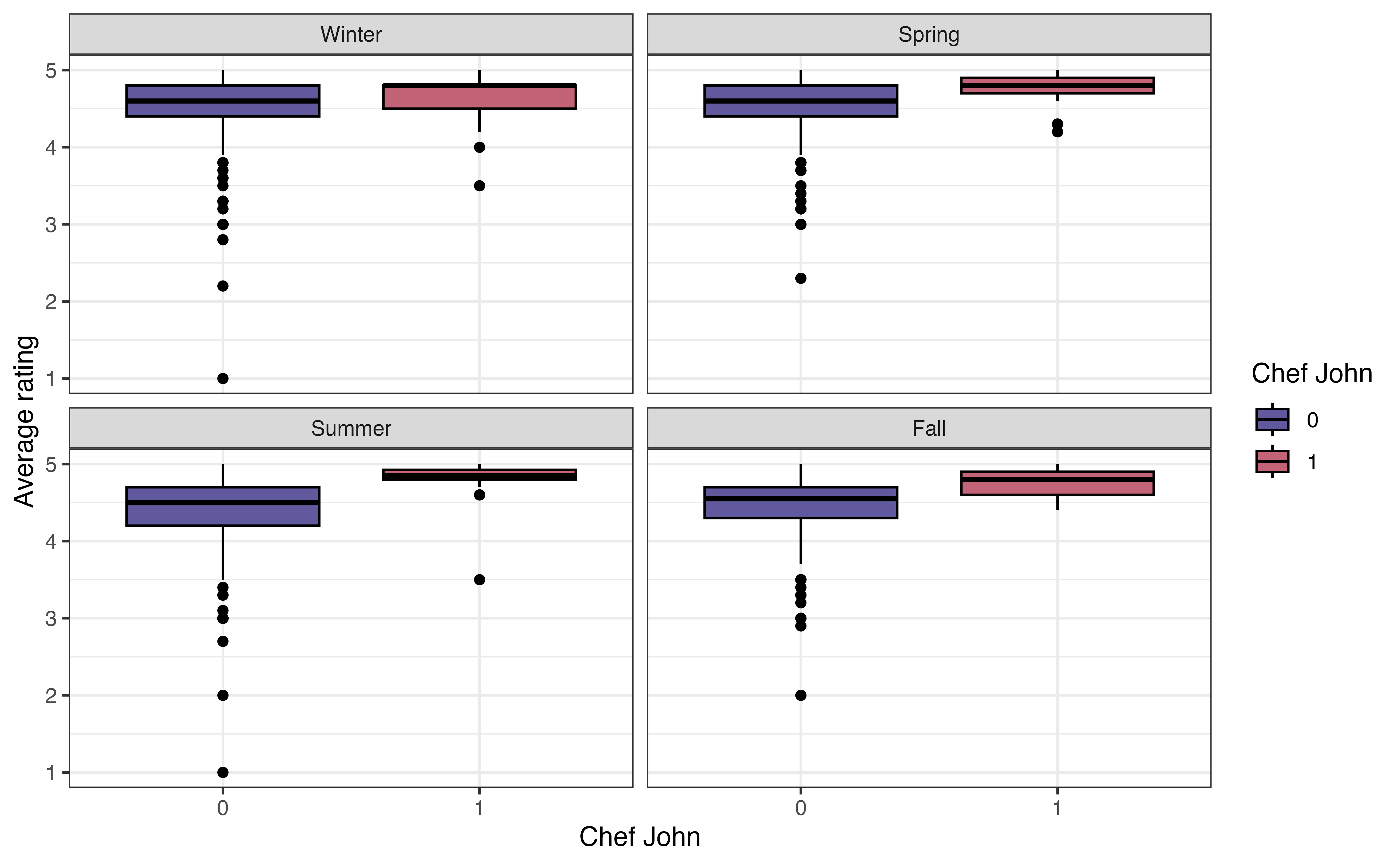 From Figure 3.23, the relationship between avg_rating and chef_john is approximately the same in each season. Within each season, the median avg_rating for recipes posted by Chef John is higher compared to those posted by other authors. Additionally, there is generally a lot of overlap in the boxes within each season. The exception is the summer, but we keep in mind the very small variability (and small sample size) of recipes posted by Chef John. Based on this EDA, the relationship between avg_rating and chef_john does not appear to differ by season.