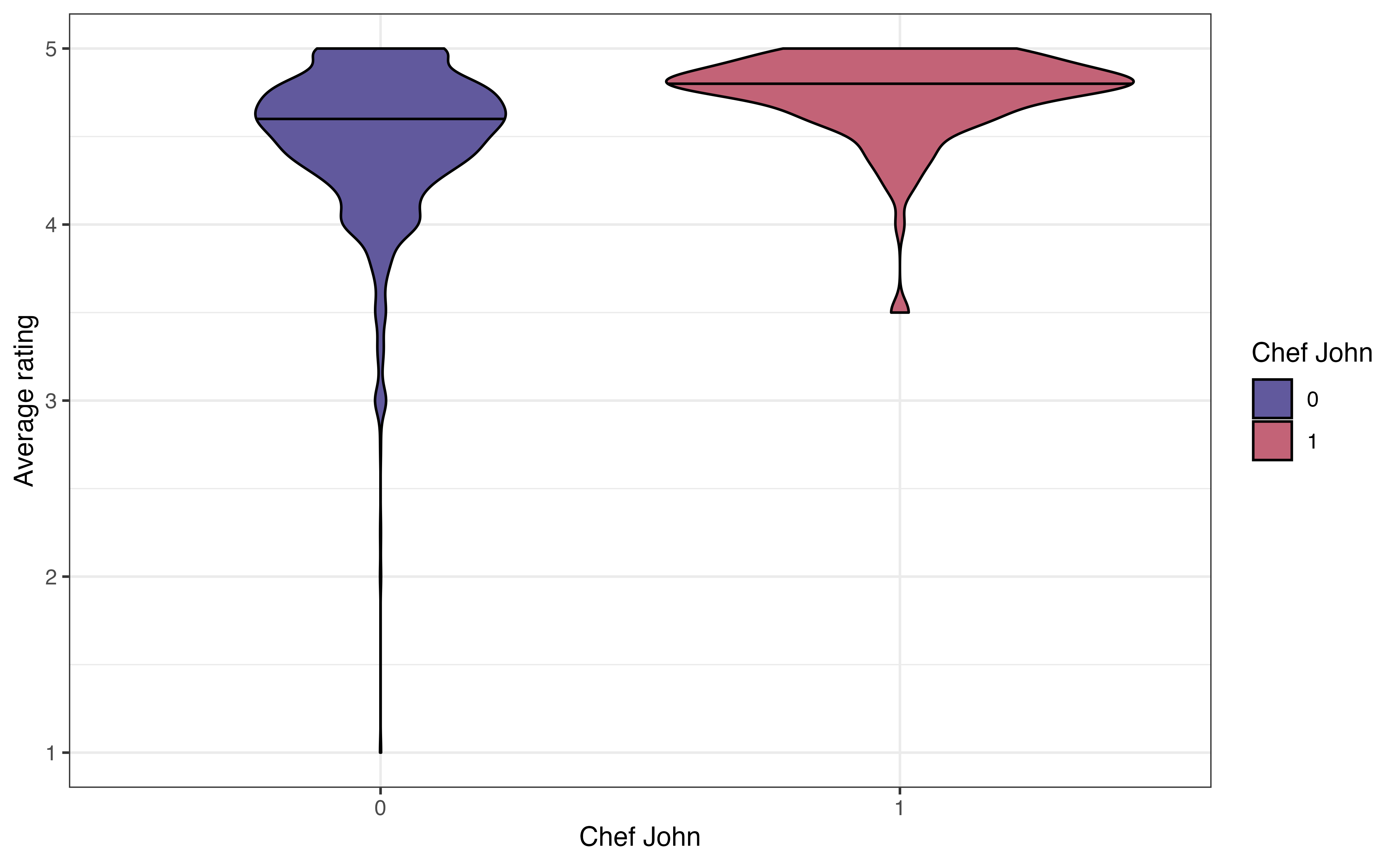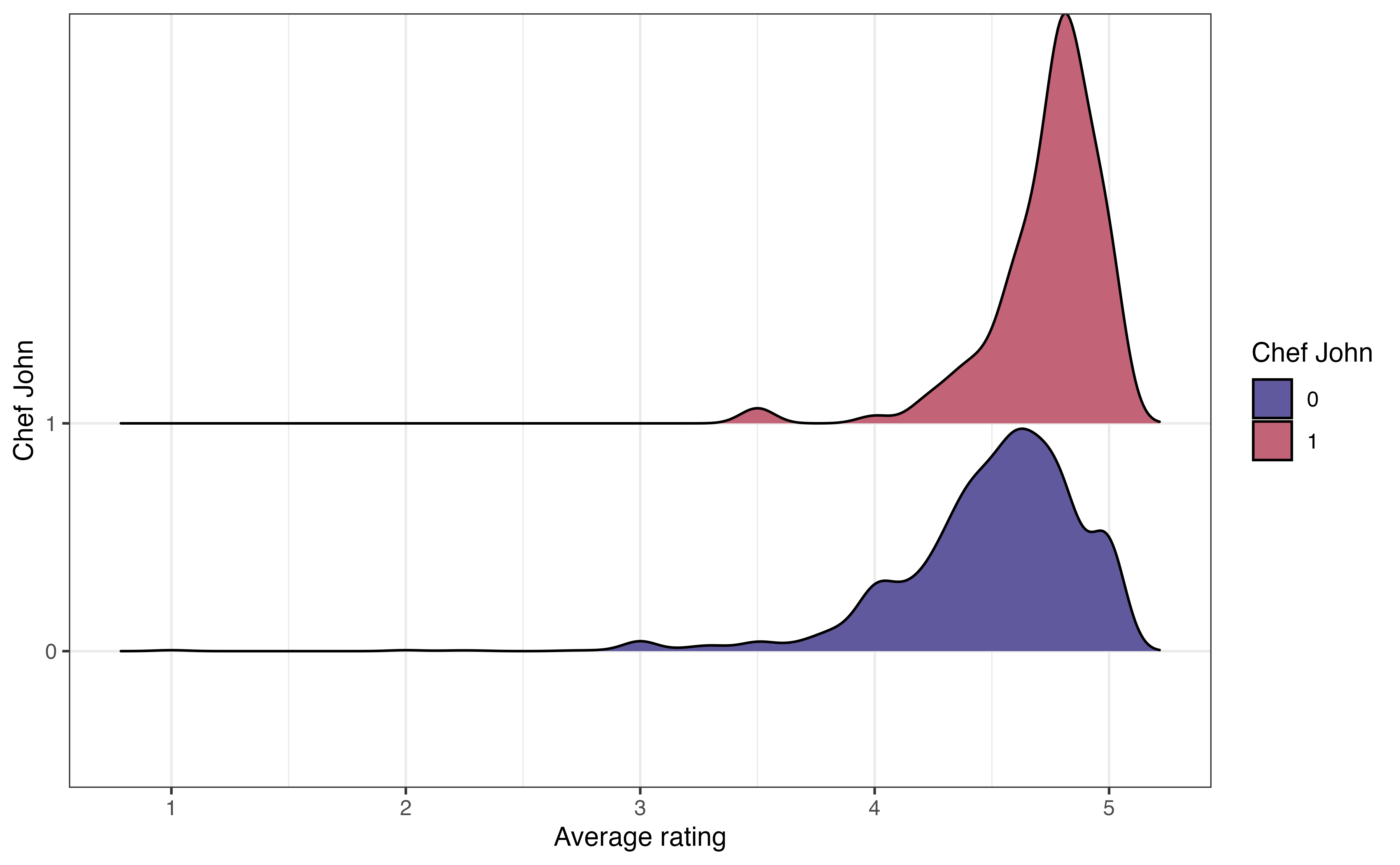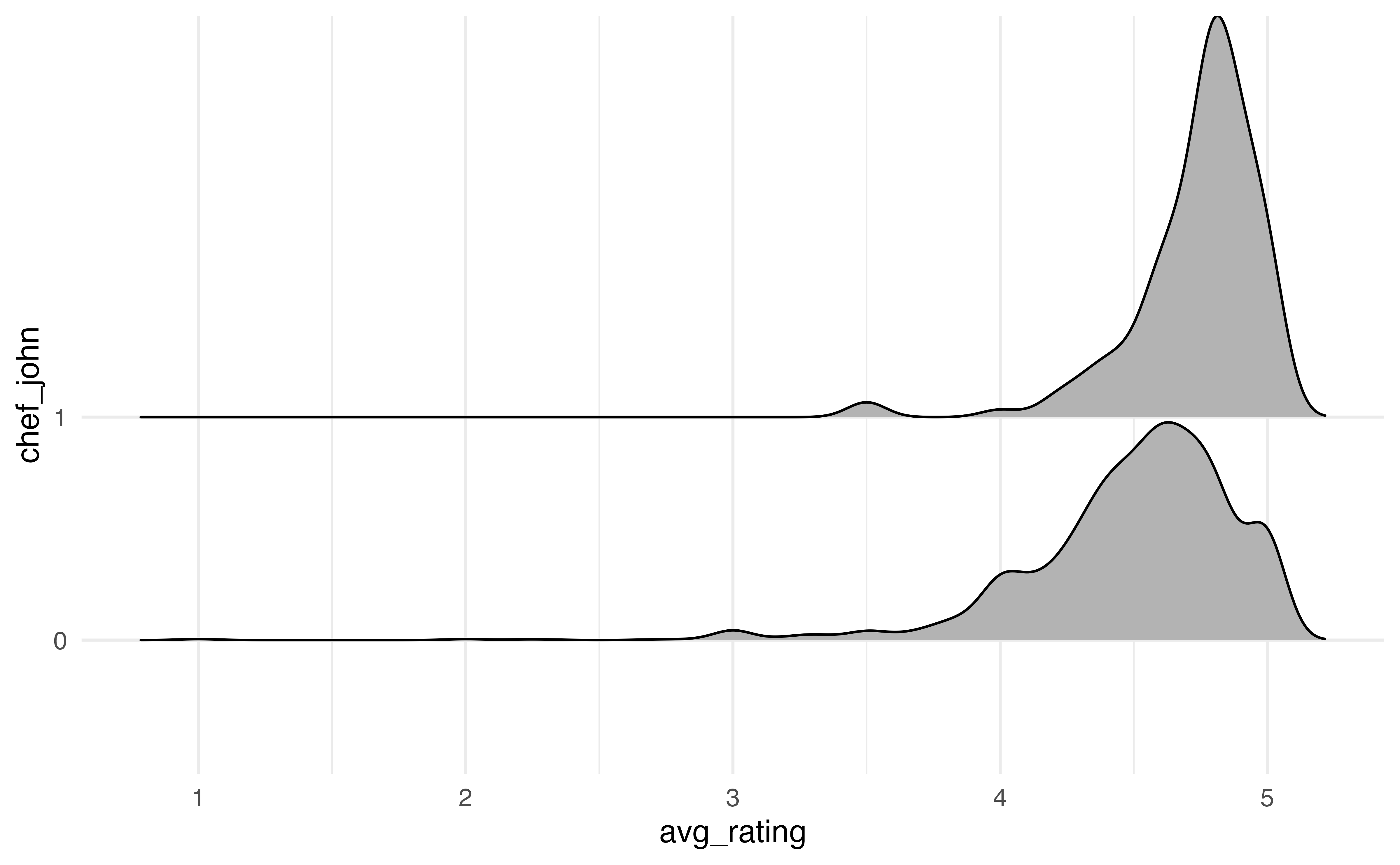 The code for the ridgeline plot of the relationship between avg_rating and chef_john is below.