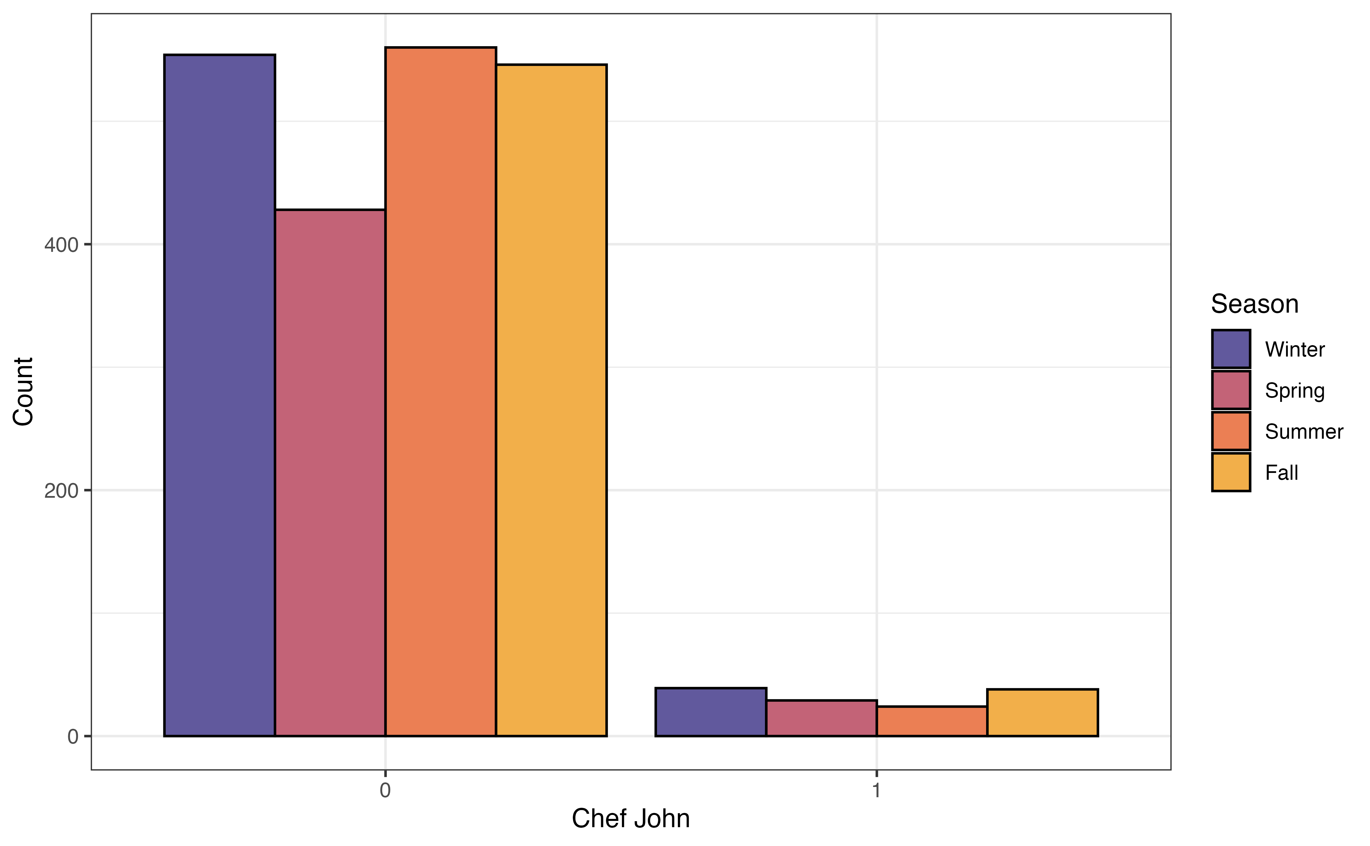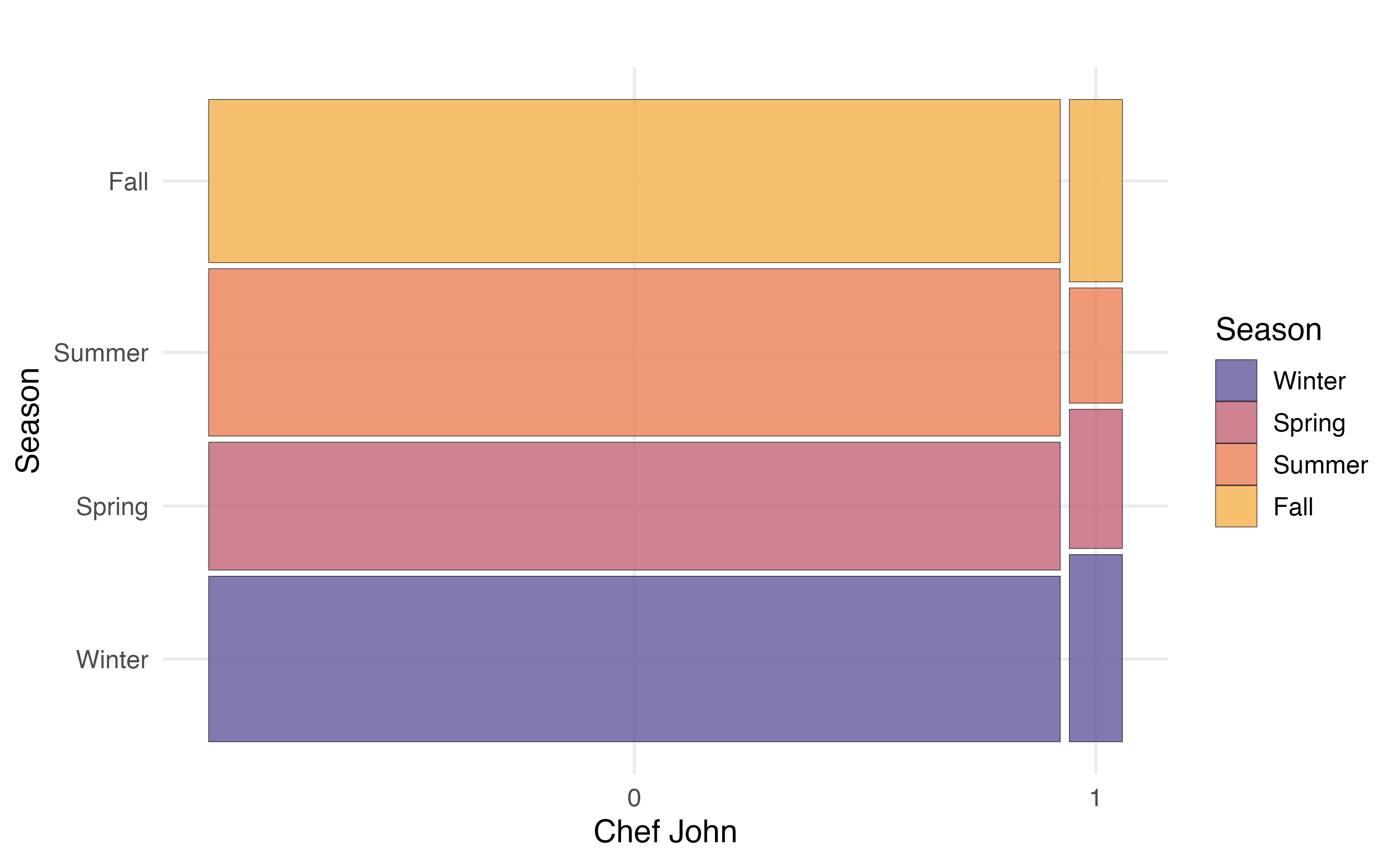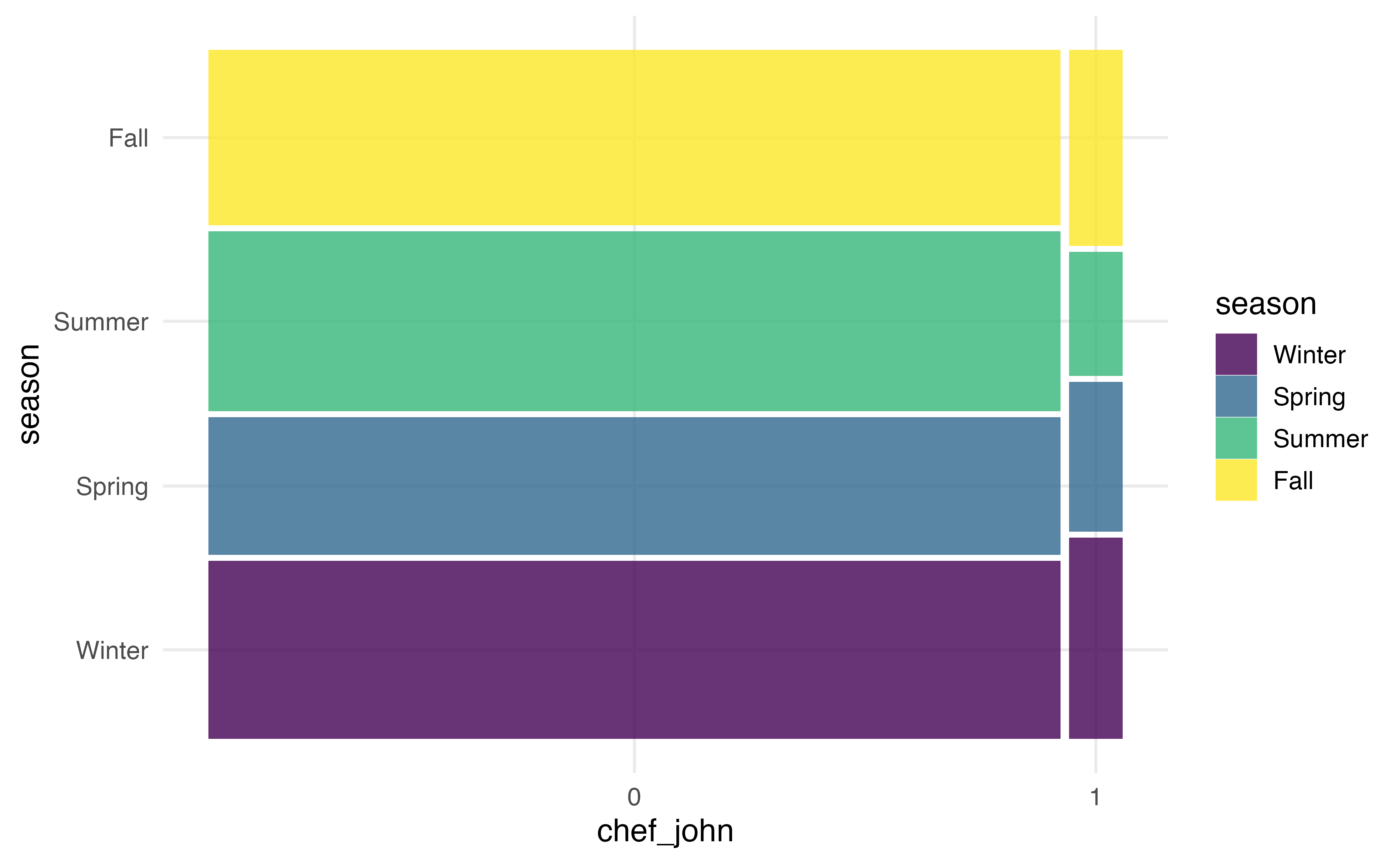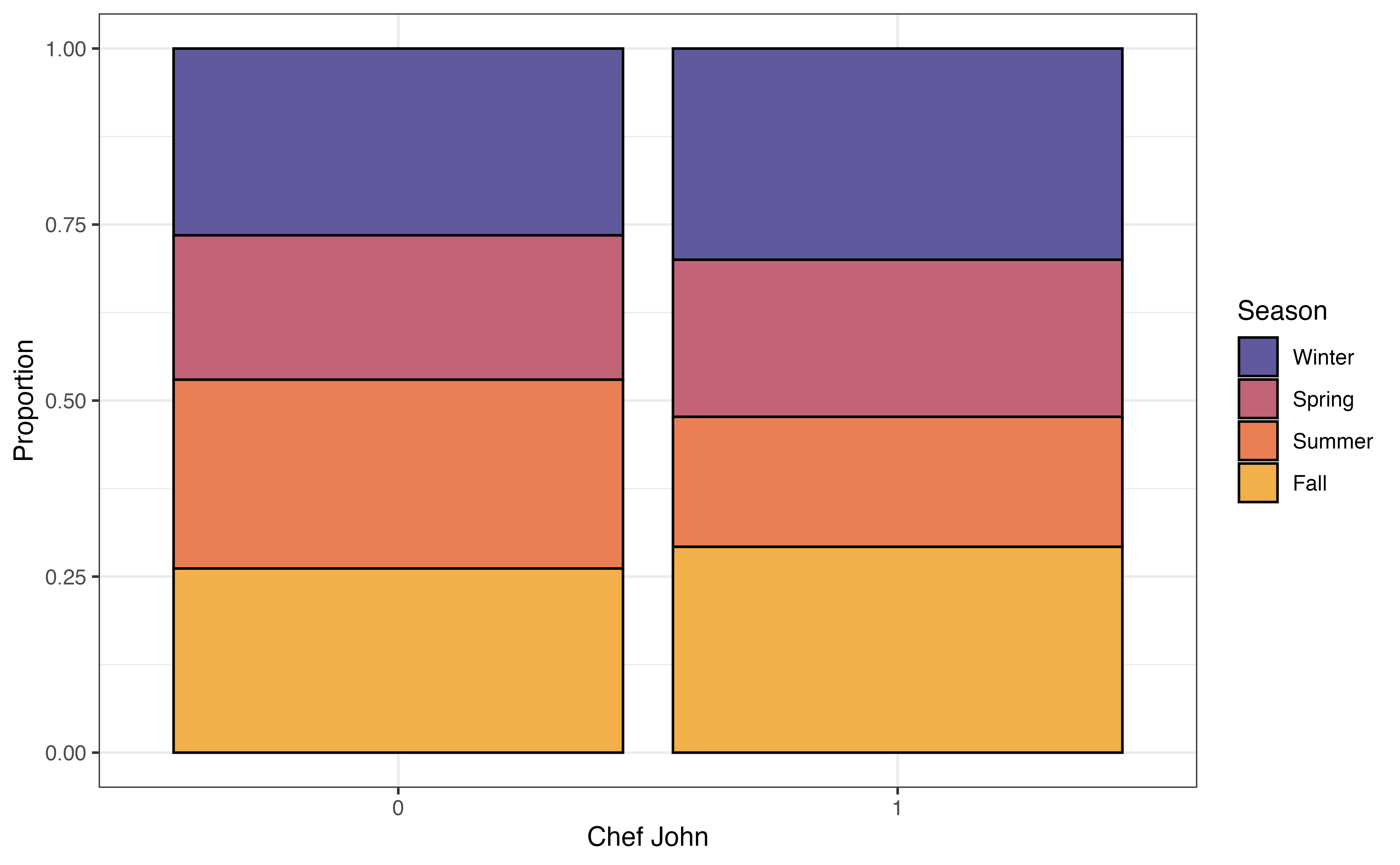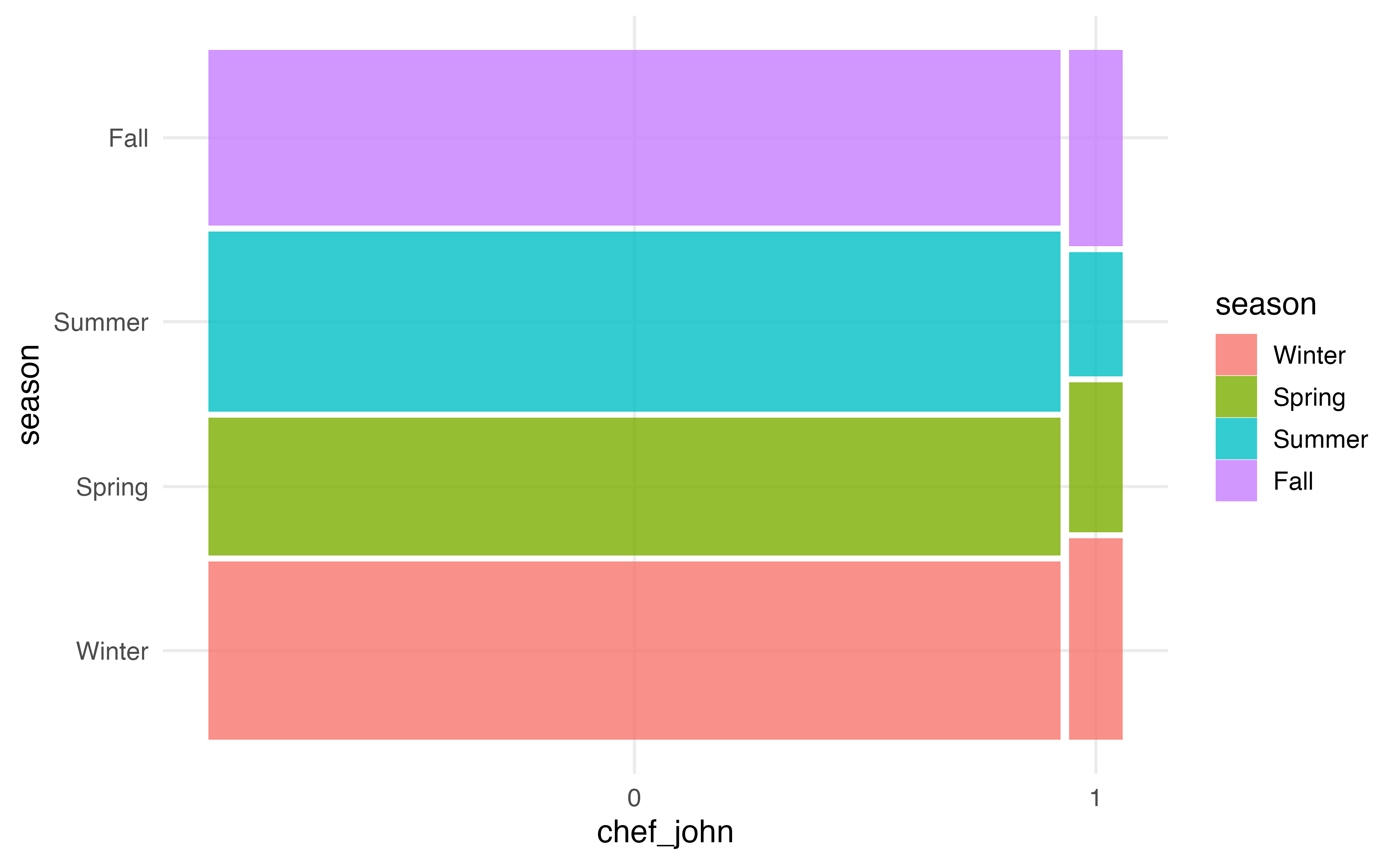 A mosaic plot has some of the advantages of both grouped bar plots and segmented bar plots. In a mosaic plots, the bars for grouping variable are filled in based on the distribution of the other variable, and the width of the bars are based on the number of observations at each level of the grouping variable. Figure 3.21 (b) shows the mosaic plot of season versus chef_john. Now we can not only see the distribution of season for recipes posted by Chef John and for recipes posted by all other authors, but we also see there are far fewer observations that take values chef_john = 1 compared to chef_john = 0.