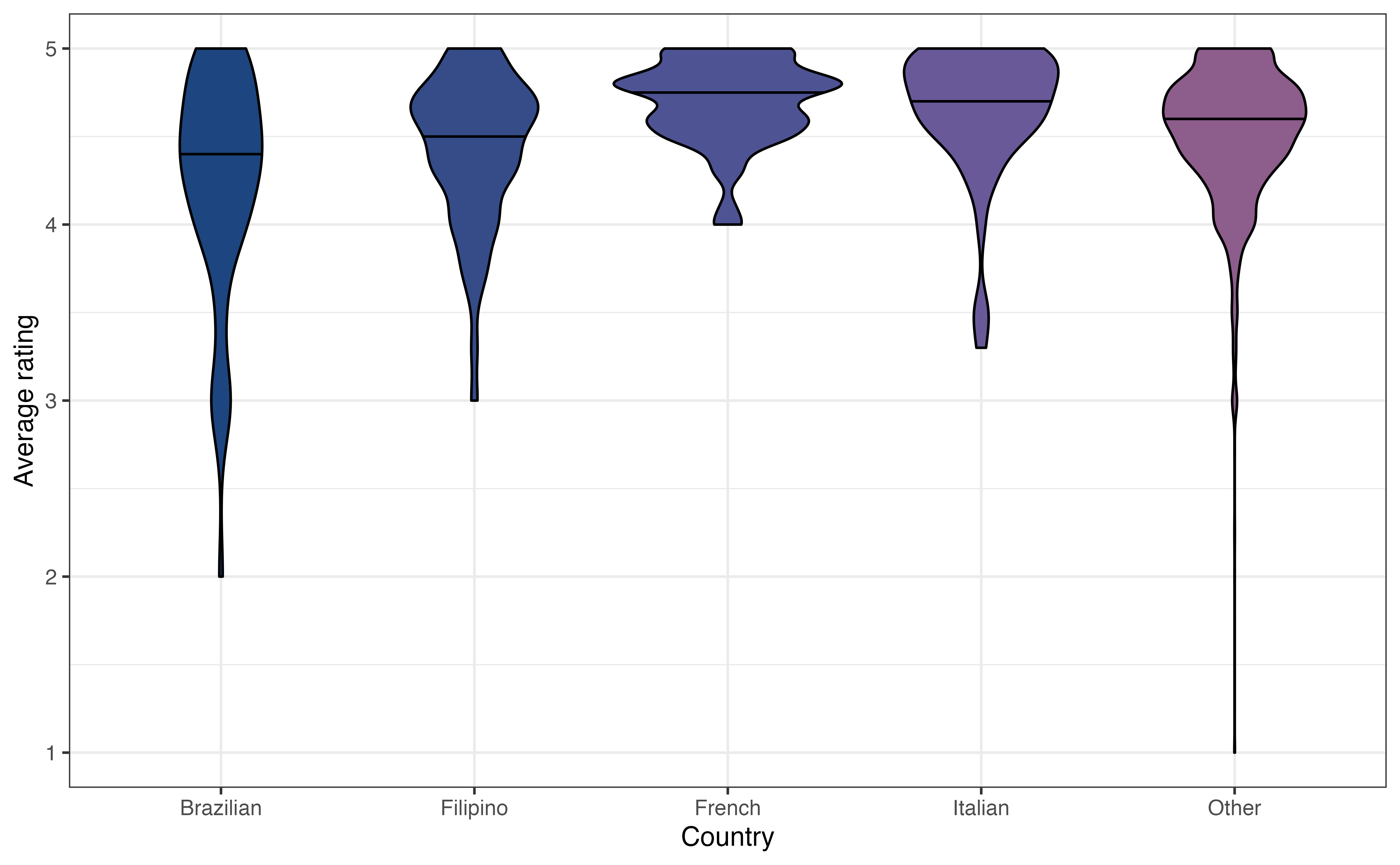 country: The country / region the cuisine is from (Brazilian,Filipino,French,Italian,Other). This is a simplified version of thecountryvariable in thecuisinesdata frame.author: User who posted the recipechef_john: Indicator of whether recipe was posted by American Chef John Mitzewich (known as Chef John), derived from the variableauthor. (1: Posted by Chef John,0: Not posted by Chef John)month: Month in which the recipe posted, derived from the variabledate_publishedin thecuisinesdata frame. (1: January,2: February,3: March, . . .,12: December).-