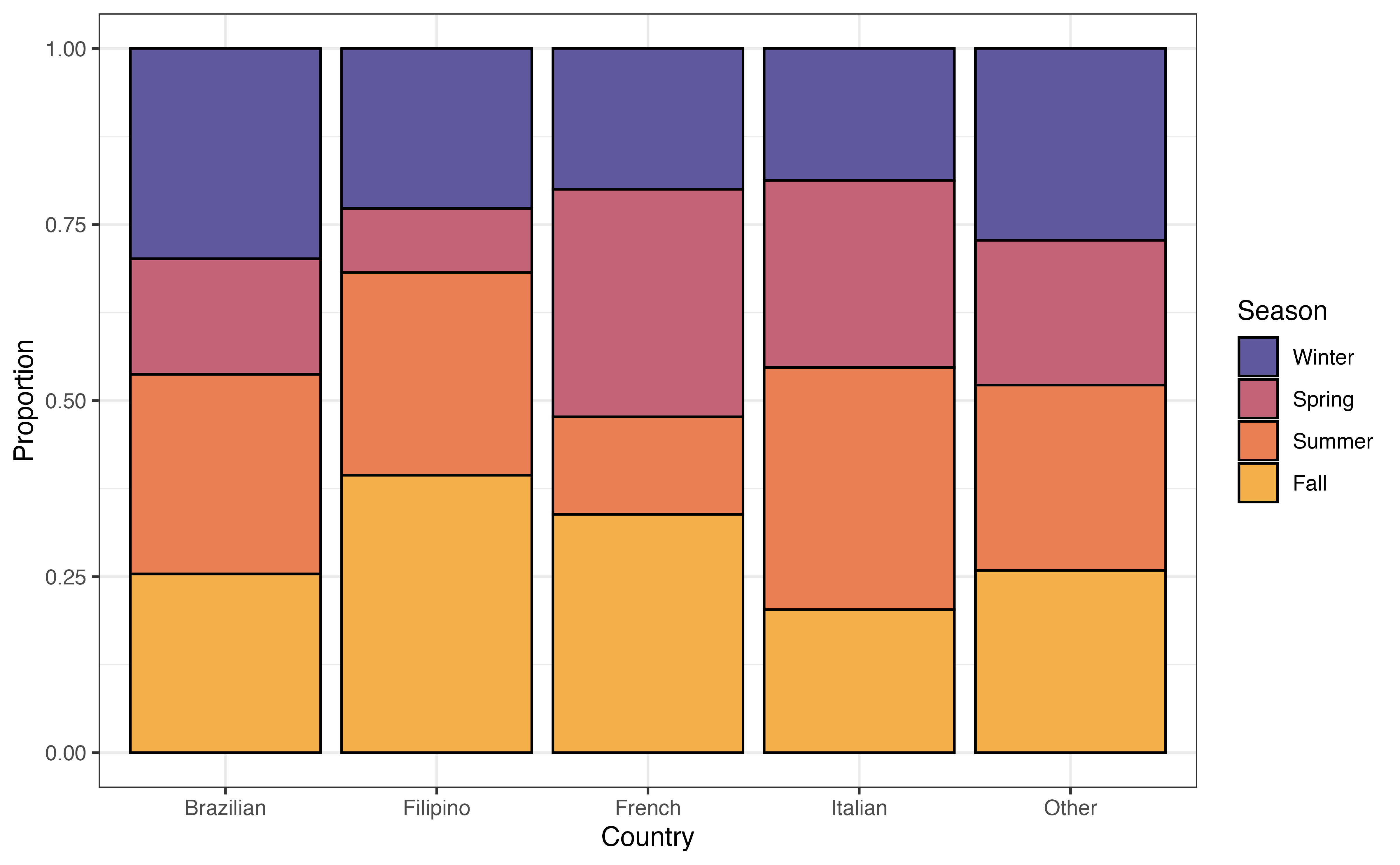 There does appear to be a relationship betweenseasonandcountry. There are differences in the distribution of season across countries.↩︎