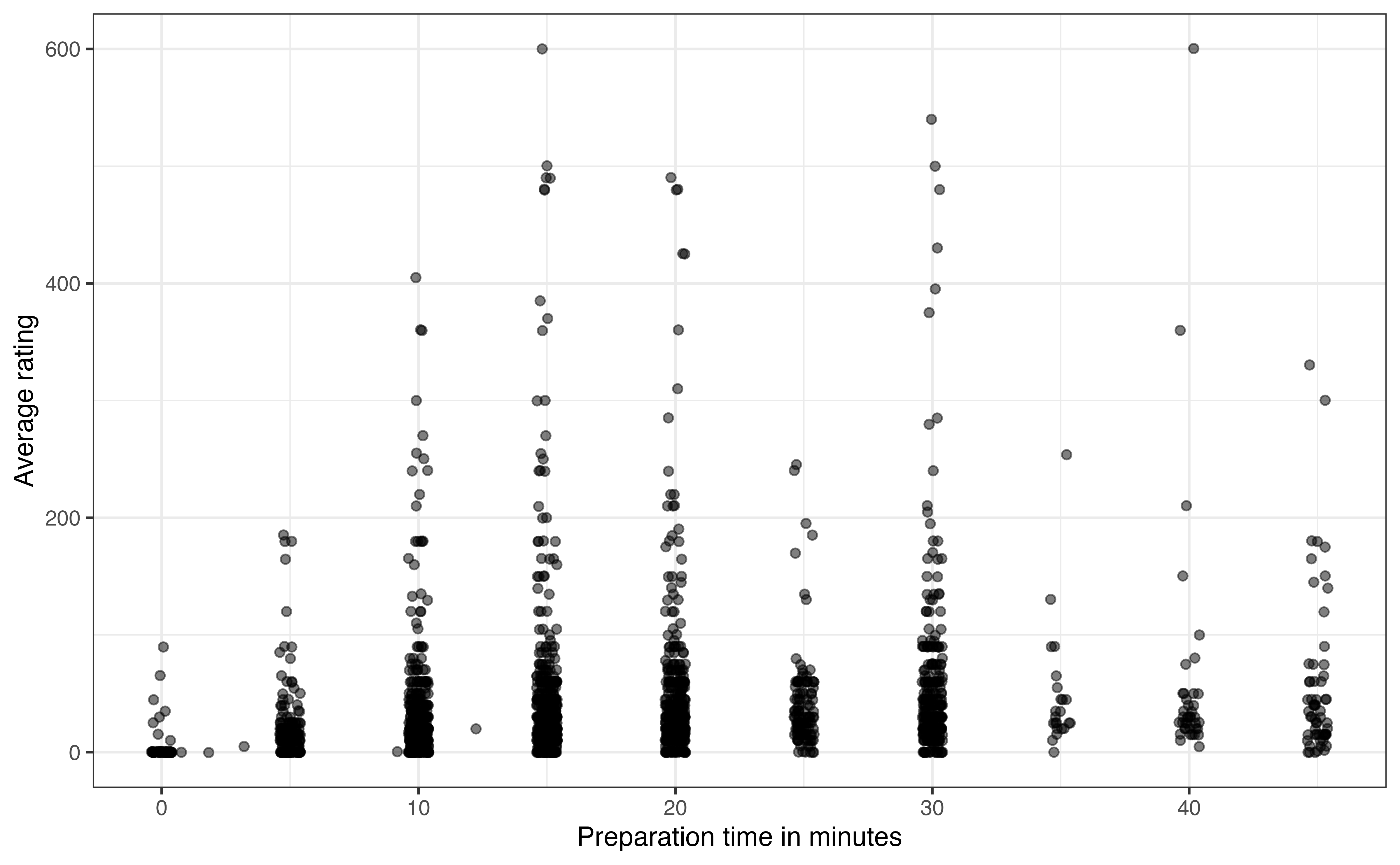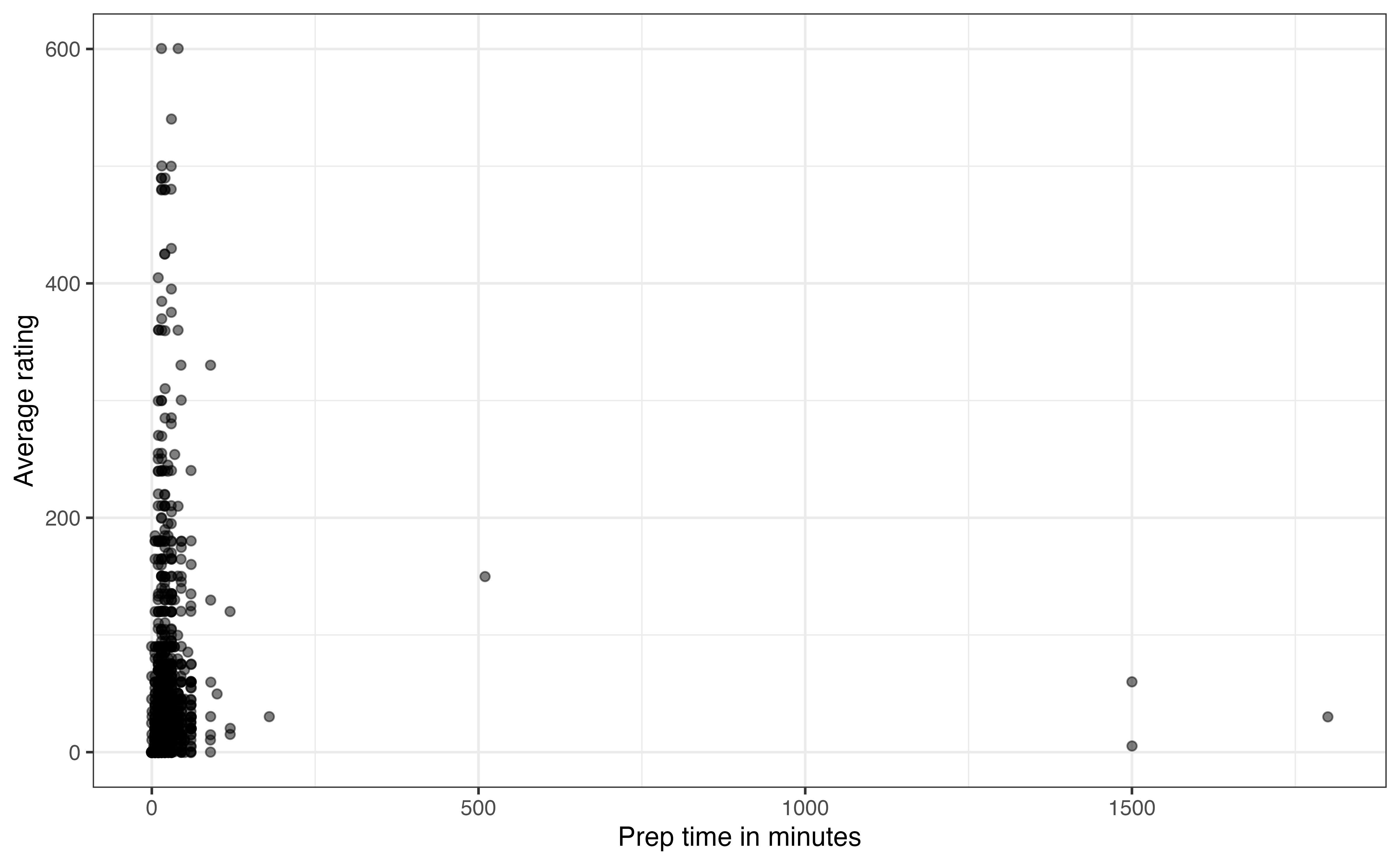 cook_timeis unimodal and right-skewed. The center is best represented by the median, of 25 minutes. The spread is best represented by the IQR, of 35 minutes (45 - 10). There are some clear outliers with cook times of about 350 minutes and greater (the max is 600).↩︎There does not appear to be a relationship between the average rating and the preparation time. There is not a clear trend on the plot.↩︎