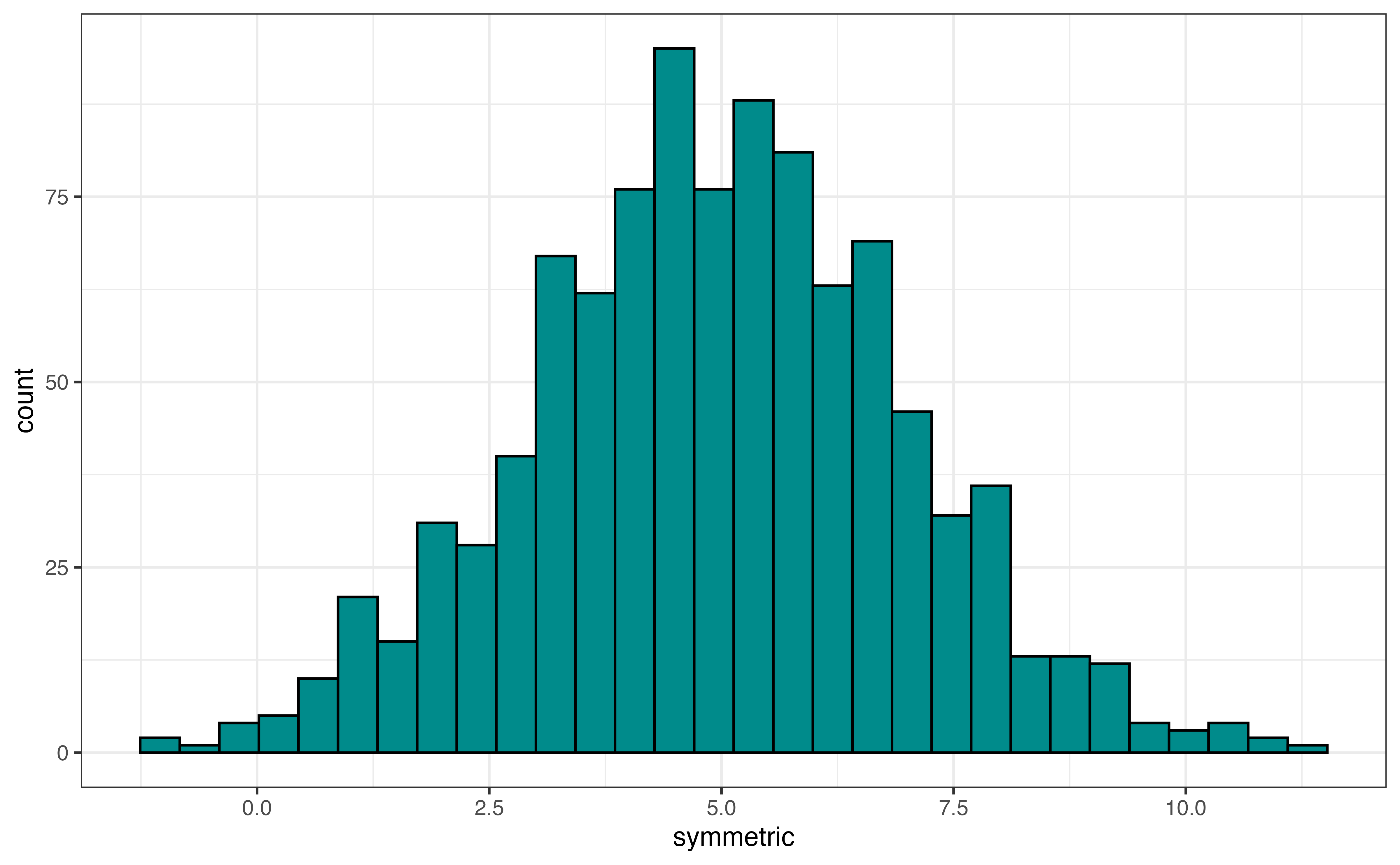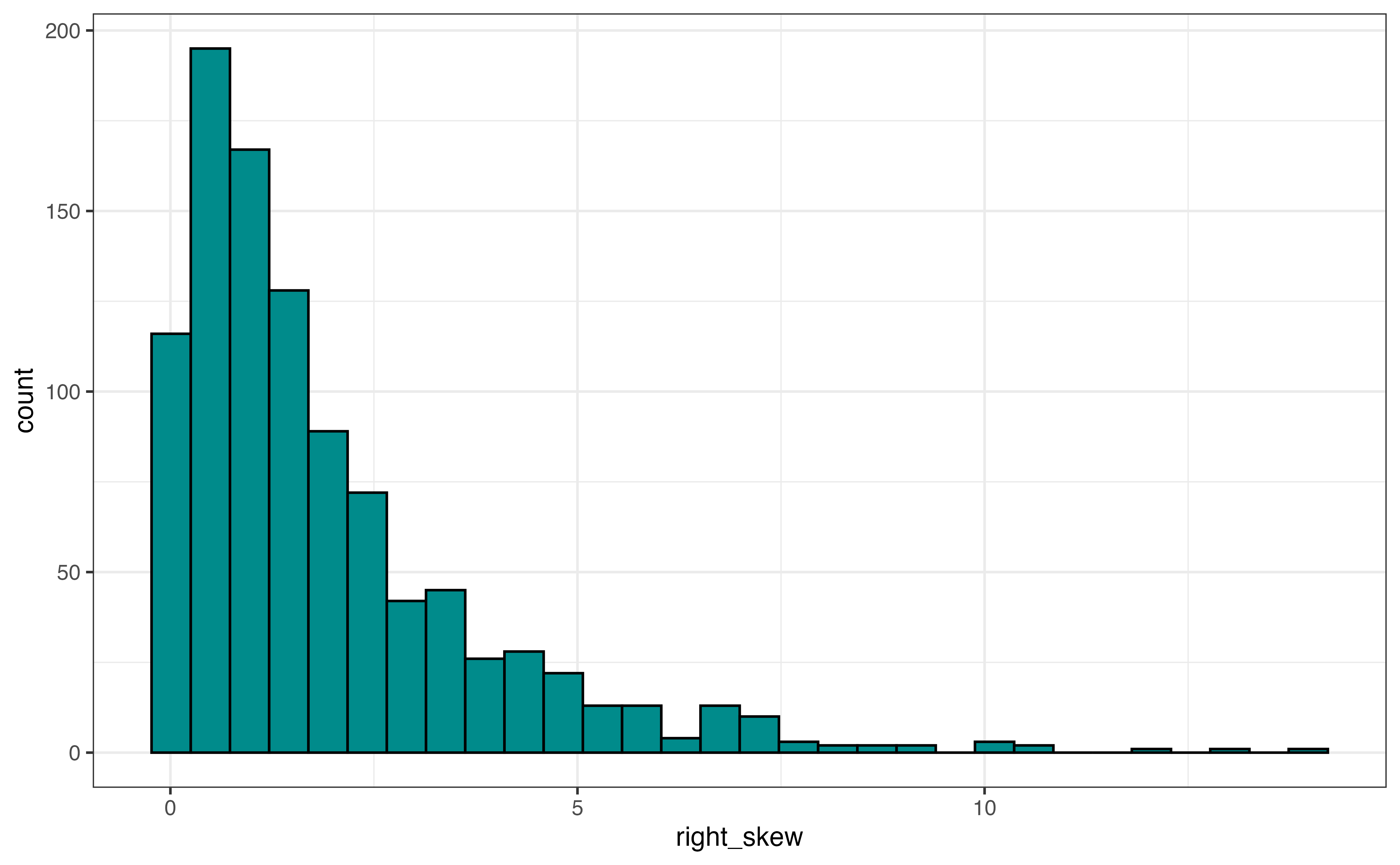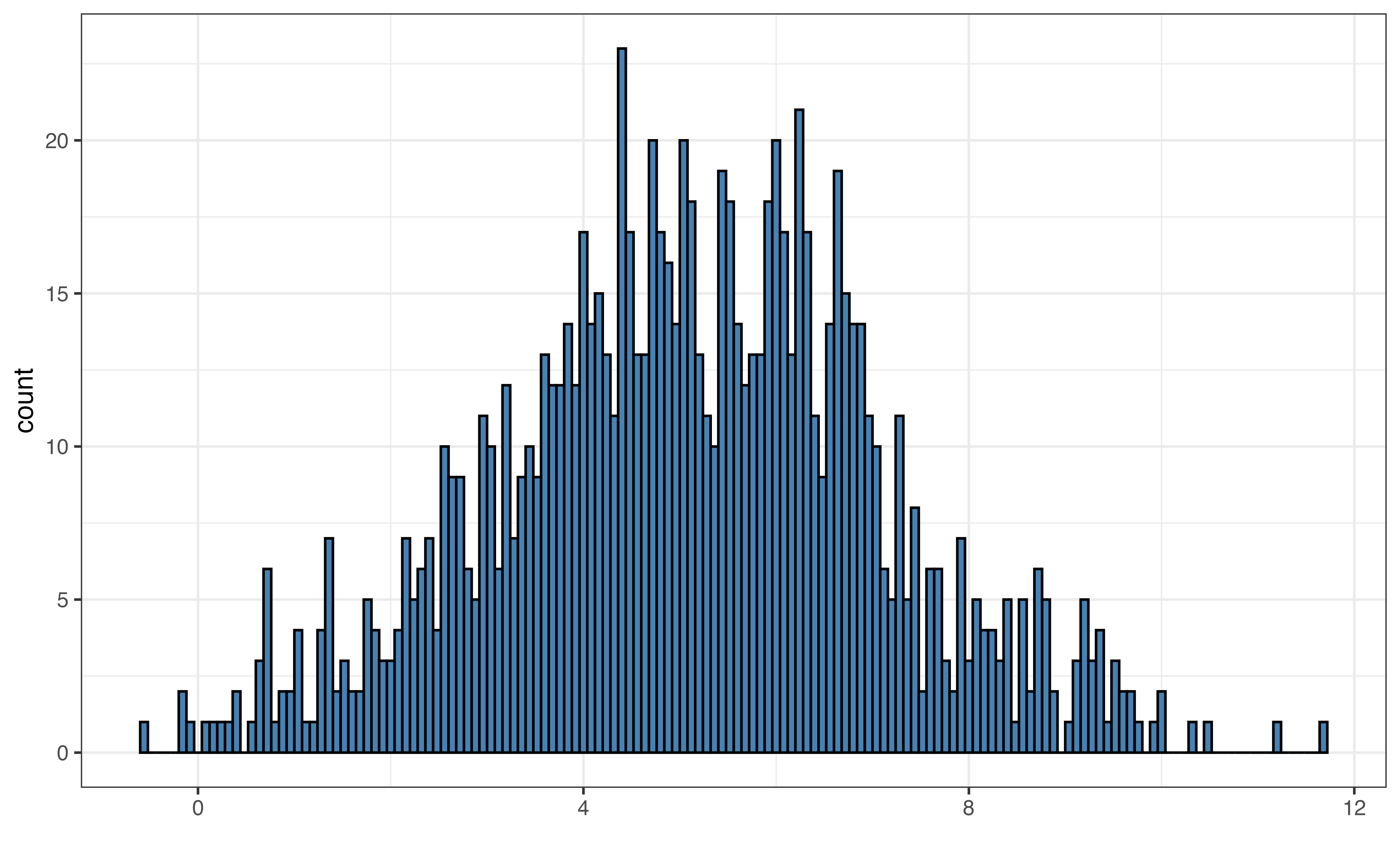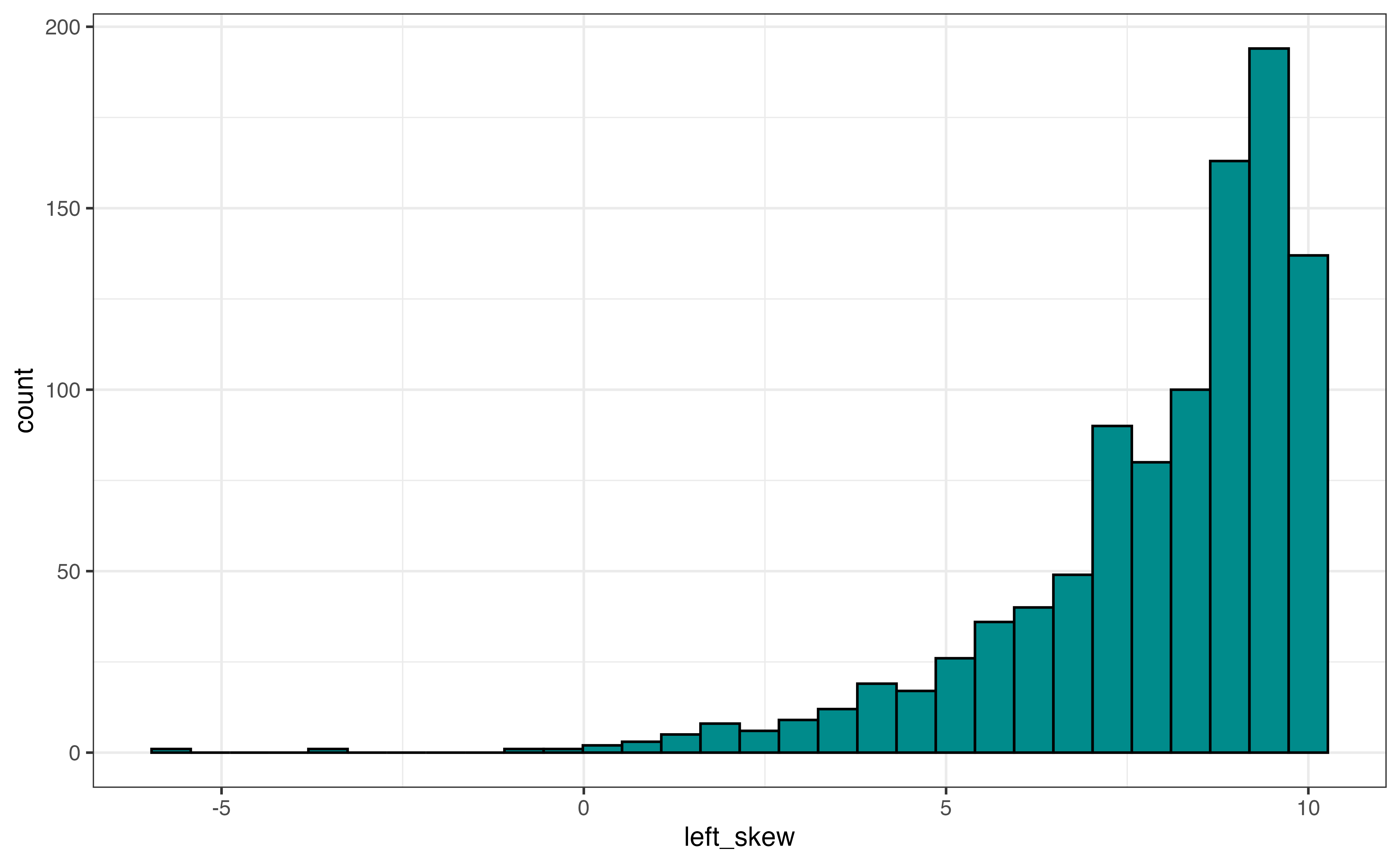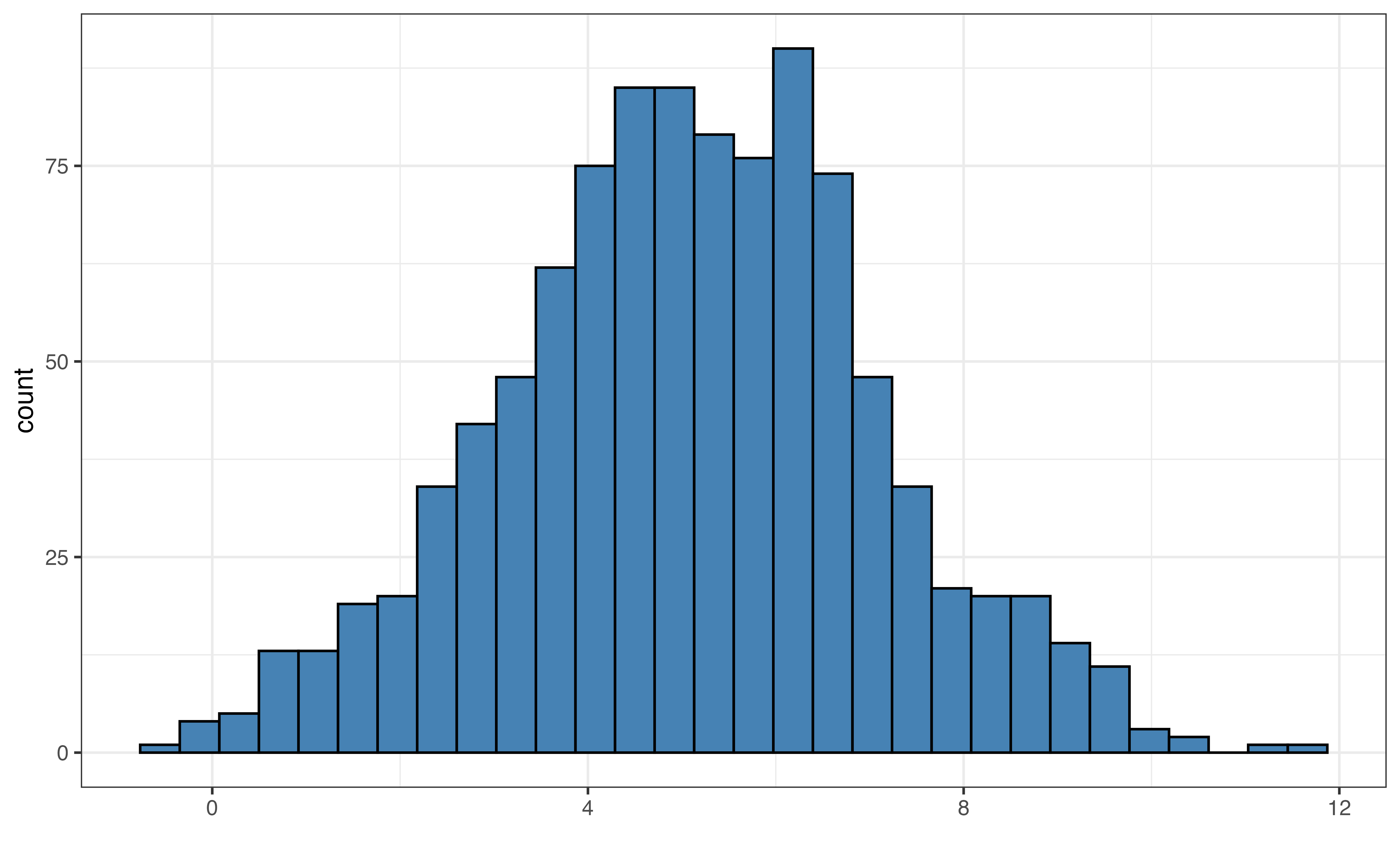 The output from skim() is a tibble, so we can apply the usual dplyr functions to the results. For example, we may not be interested in all the summary output, so we can use select() to choose certain columns. The code below shows the mean and standard deviation for avg_rating. The column names from the skim() output differ slightly from what is displayed, so use glimpse() or names() to see the underlying column names.