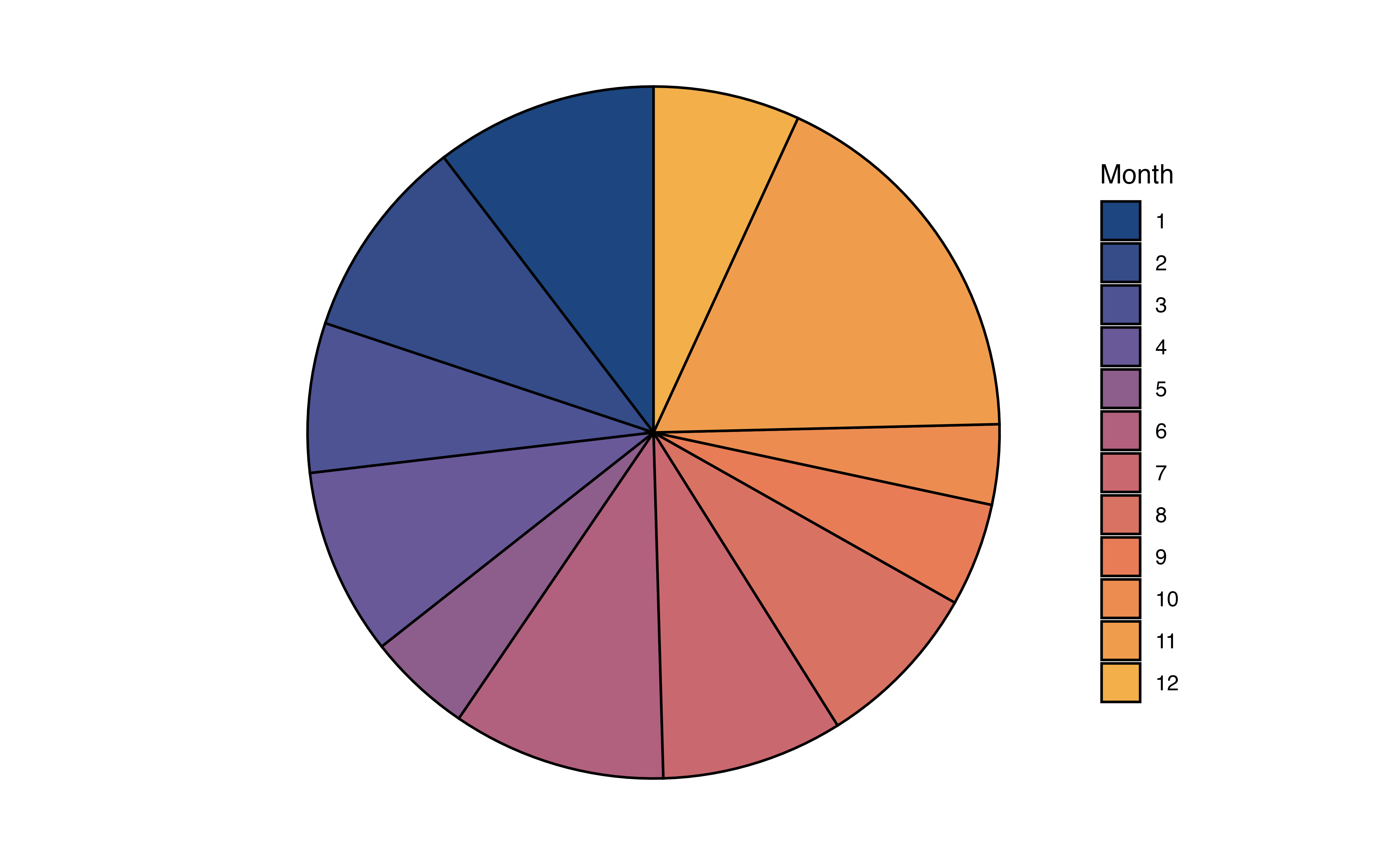 In Figure 3.3 (b), the distribution of month is visualized using a pie chart. In a pie chart, each slice represents the proportion of observations at a given level. As we observed from the bar chart, the slice for Month 11 (November) is the largest, indicating the large proportion of recipes in the data were published that month.