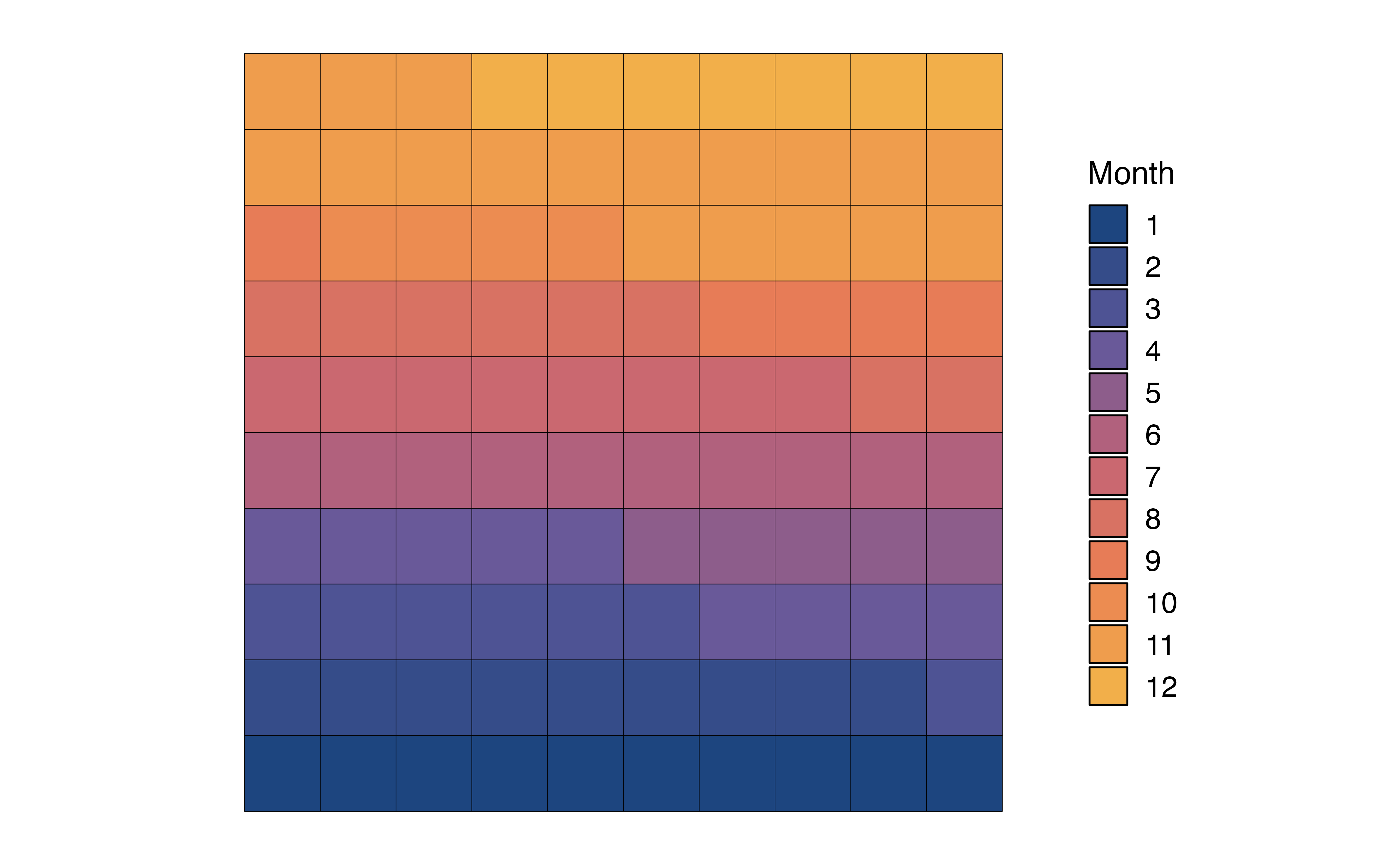 In Figure 3.3 (c), the distribution of month is visualized using a waffle chart. In a waffle chart, the number of squares for each level represents the proportion of observations at that level. It is similar to a pie chart in that is shows how the parts (levels) make up the whole (variable). In fact, it is sometimes referred to as a “square pie chart”. A nice feature of the waffle chart is that we can count the squares to approximate the proportion of observations at each level.