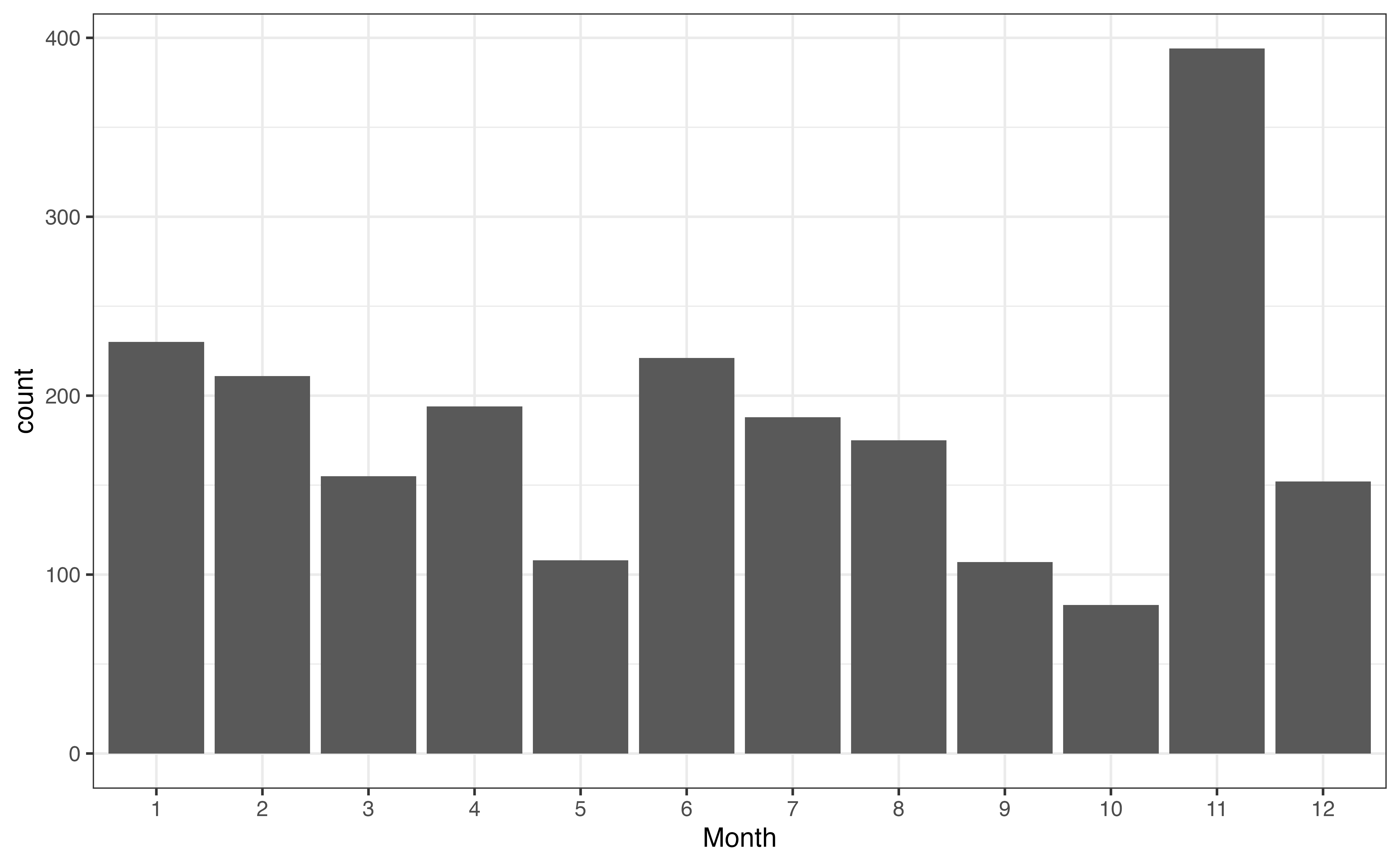 As we look at Figure 3.2, one thing that immediately stands out is the large number of recipes in November. We are unable to determine the reason for this large spike from the plot alone, but we may have some hypotheses about why this is the case based on our understanding the site’s users and our collaborators’ subject-matter expertise. One hypothesis is that there is a large uptick in recipes during the holiday season in the United States, Thanksgiving in particular, because it is a United States holiday in November that traditionally includes a large meal.