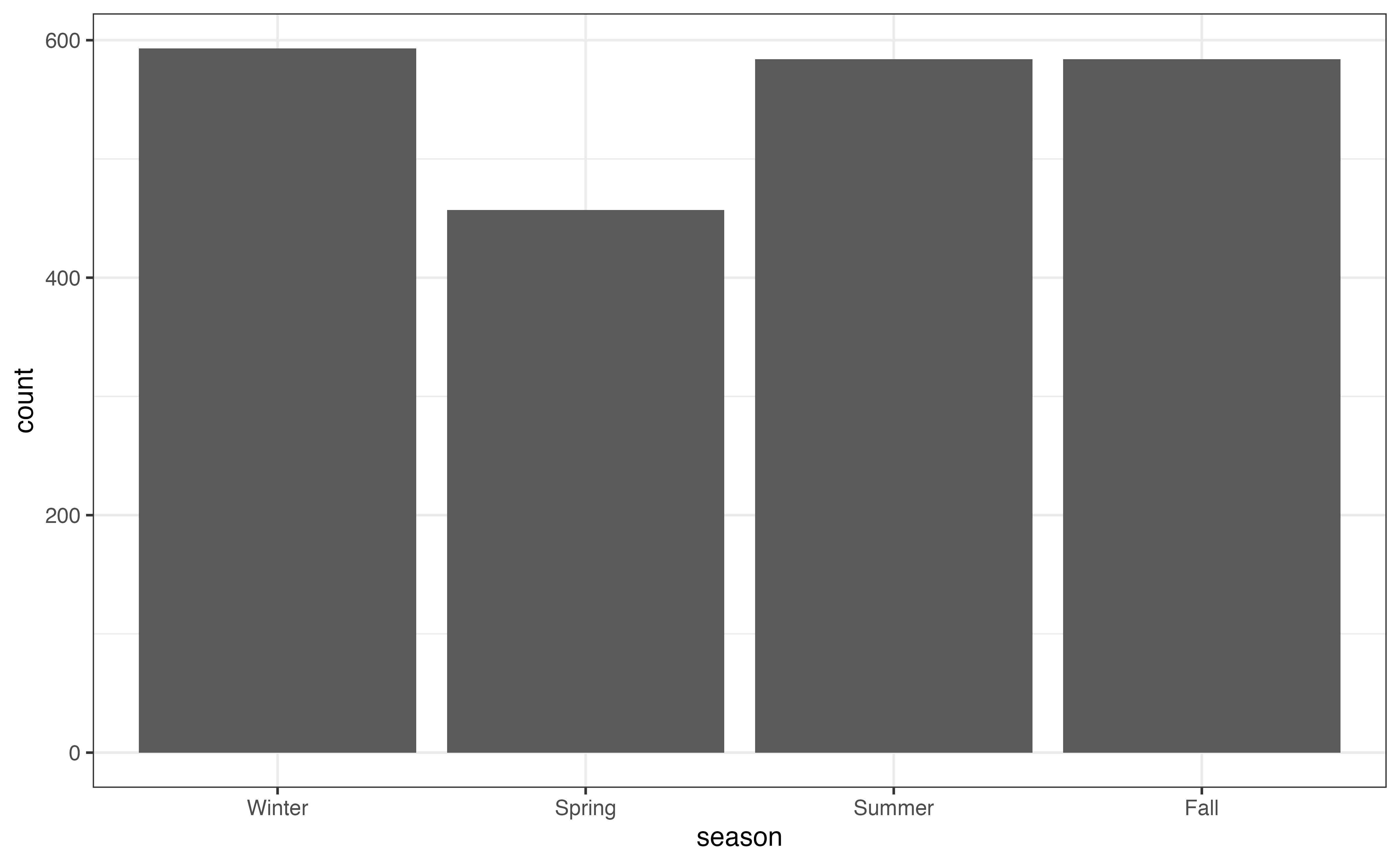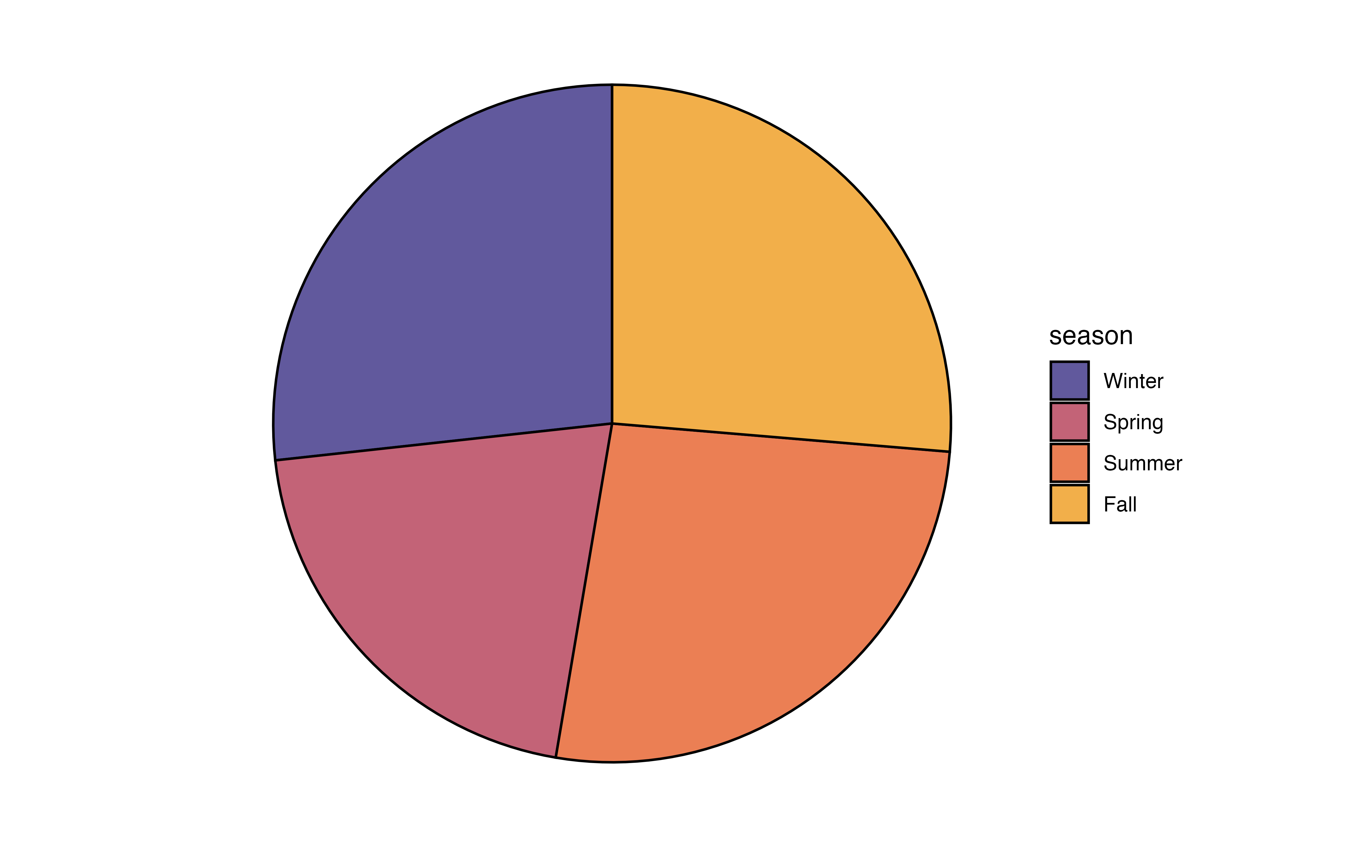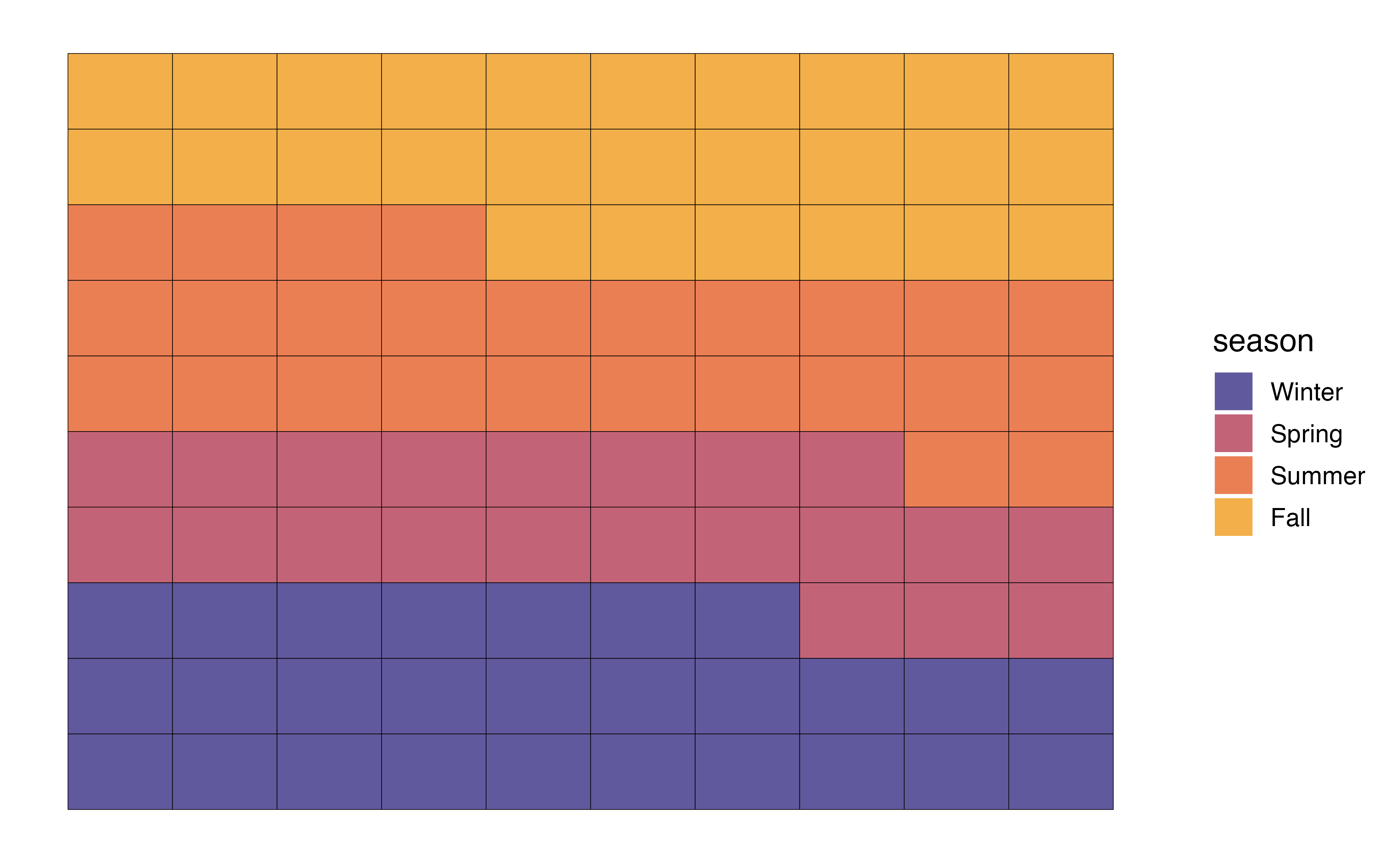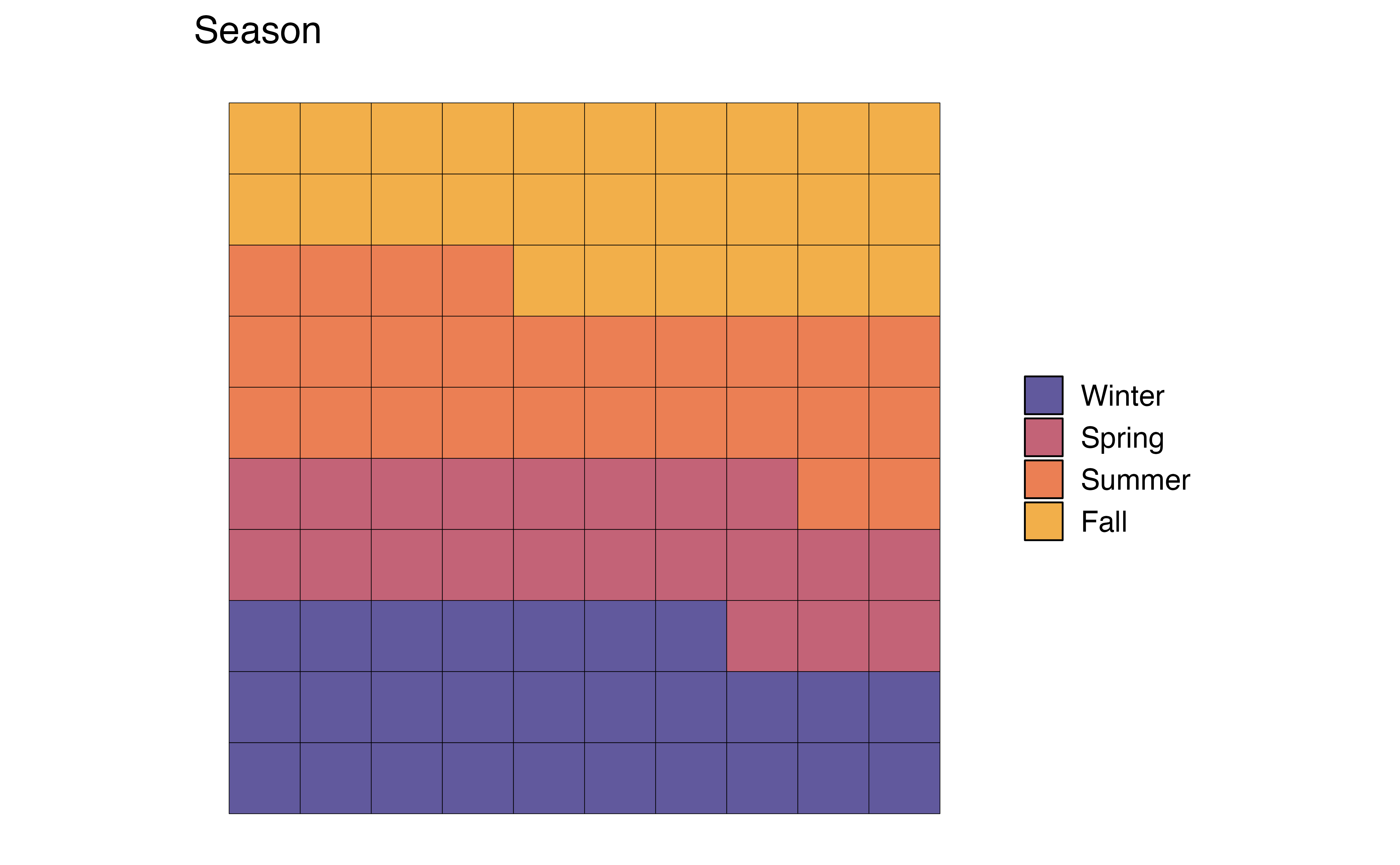 The code to create a waffle chart for the season is below. We begin by using count() to compute the number of observations at each level. Inside geom_waffle(), the argument flip = TRUE arranges the level of season by rows, rather than the default arrangement by columns. The argument make_proportional = TRUE produces a chart such that the number of squares is approximately equal to the proportion of observations at each level, rather than the raw number of observations. Lastly, theme_enhance_waffle() removes unnecessary axis labels.