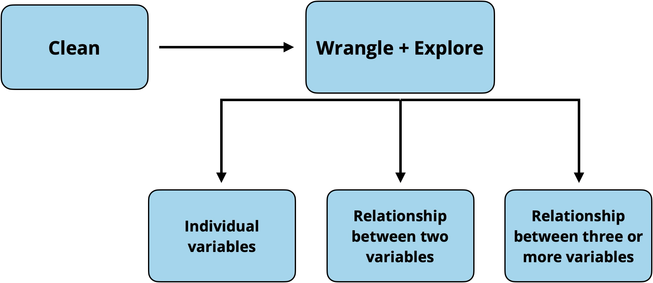 Figure 3.1 shows the workflow for exploratory data analysis. We typically start by getting a general sense of the data, then explore more detailed relationships in the data.