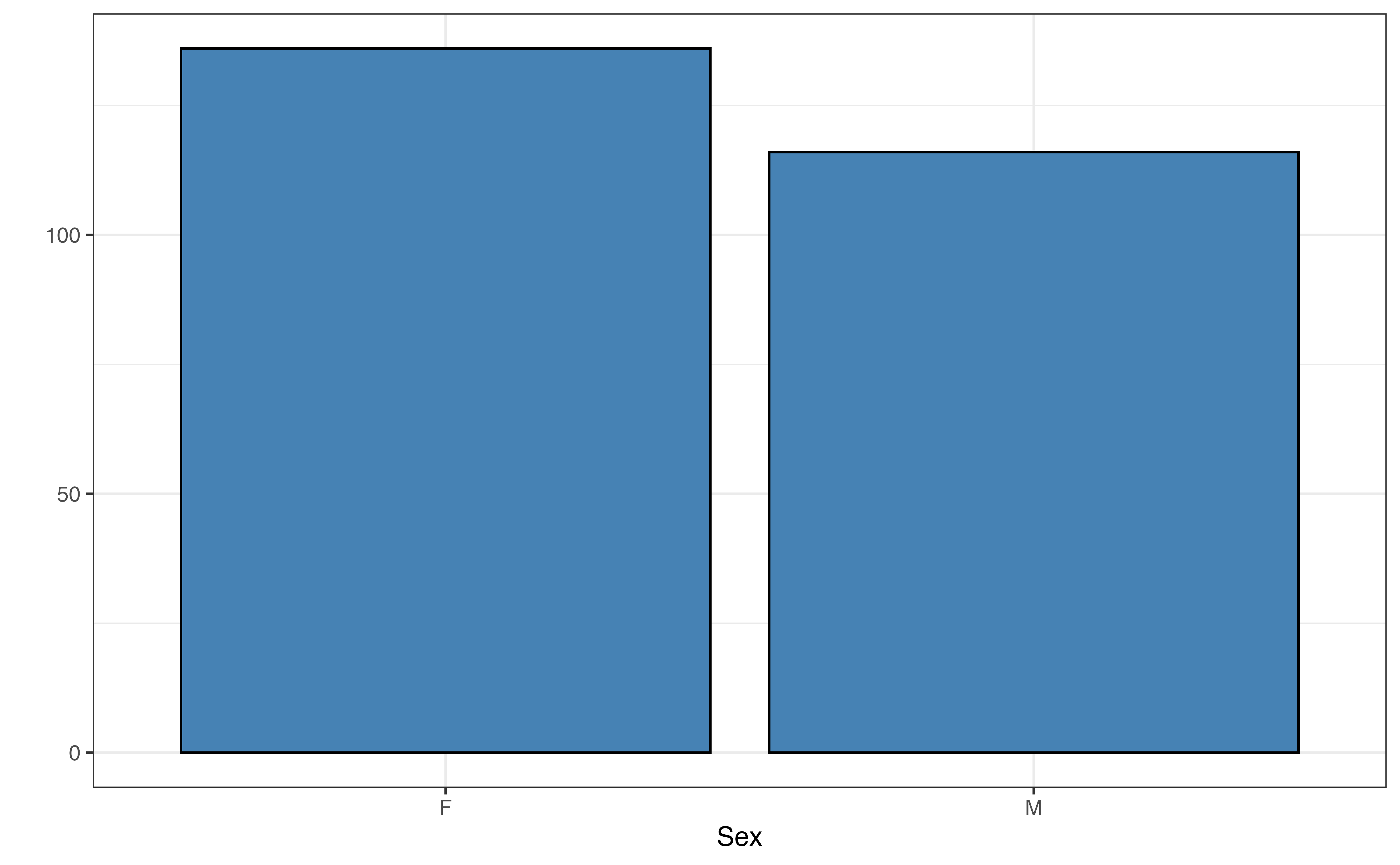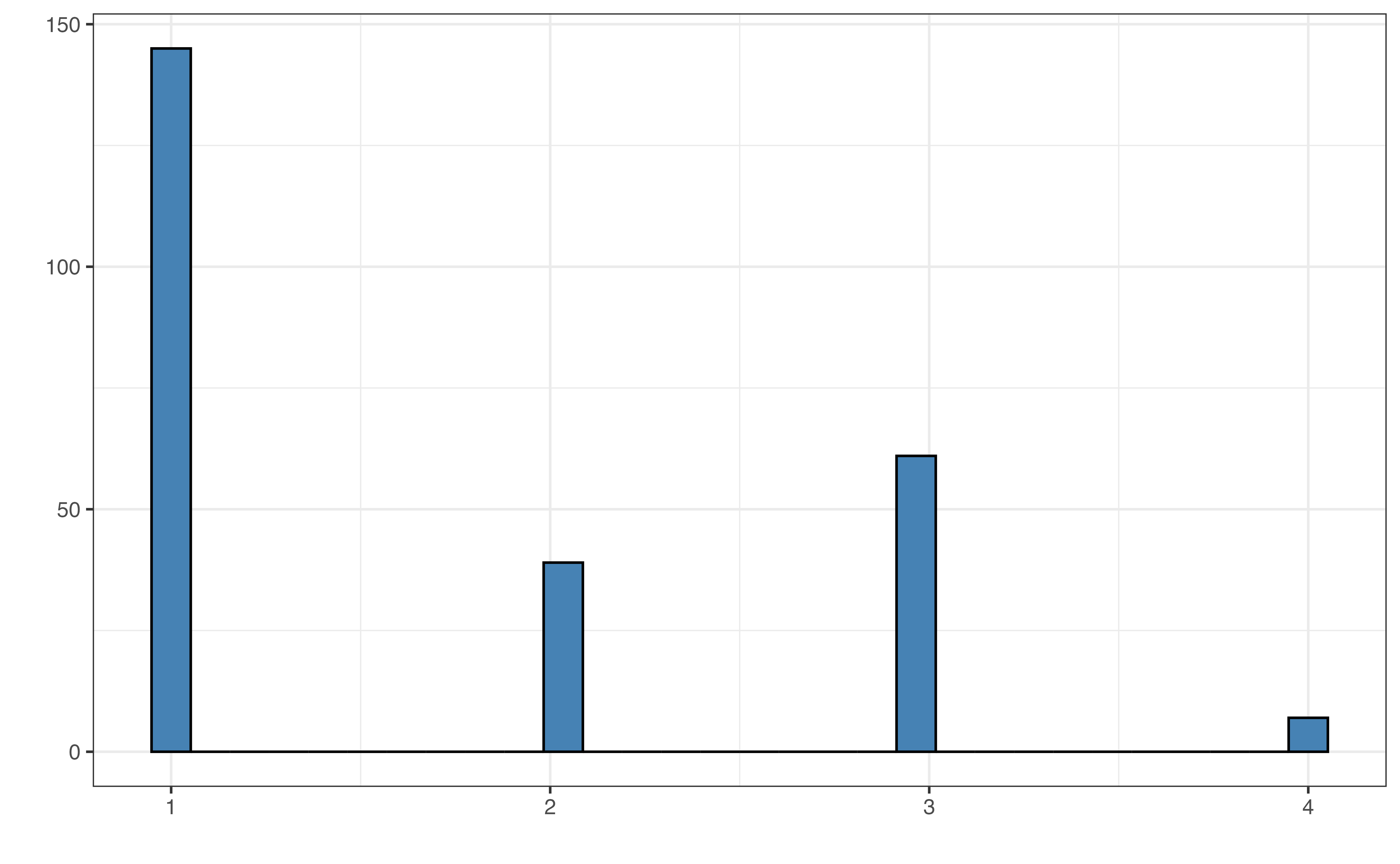 The distribution of taxon in Figure 7.3 (b) shows that most lemurs are from the VRUB taxon and the fewest are from the ERUF taxon. The distribution of sex in Figure 7.3 (c) shows a relatively equal distribution, with a small majority of the lemurs being female. Finally, a vast majority of the lemurs were born as the only lemur in their litter as seen in Figure 7.3 (d).