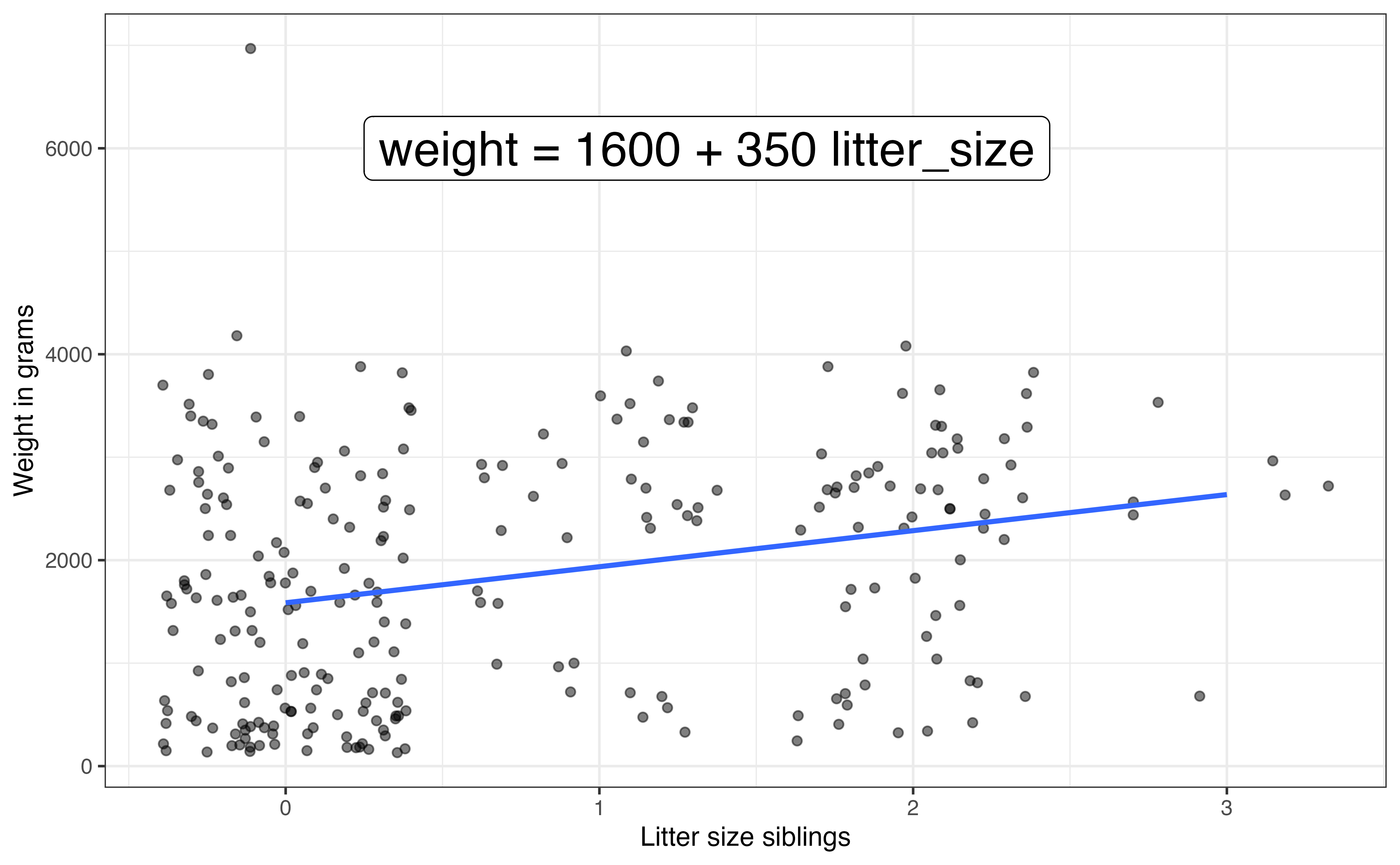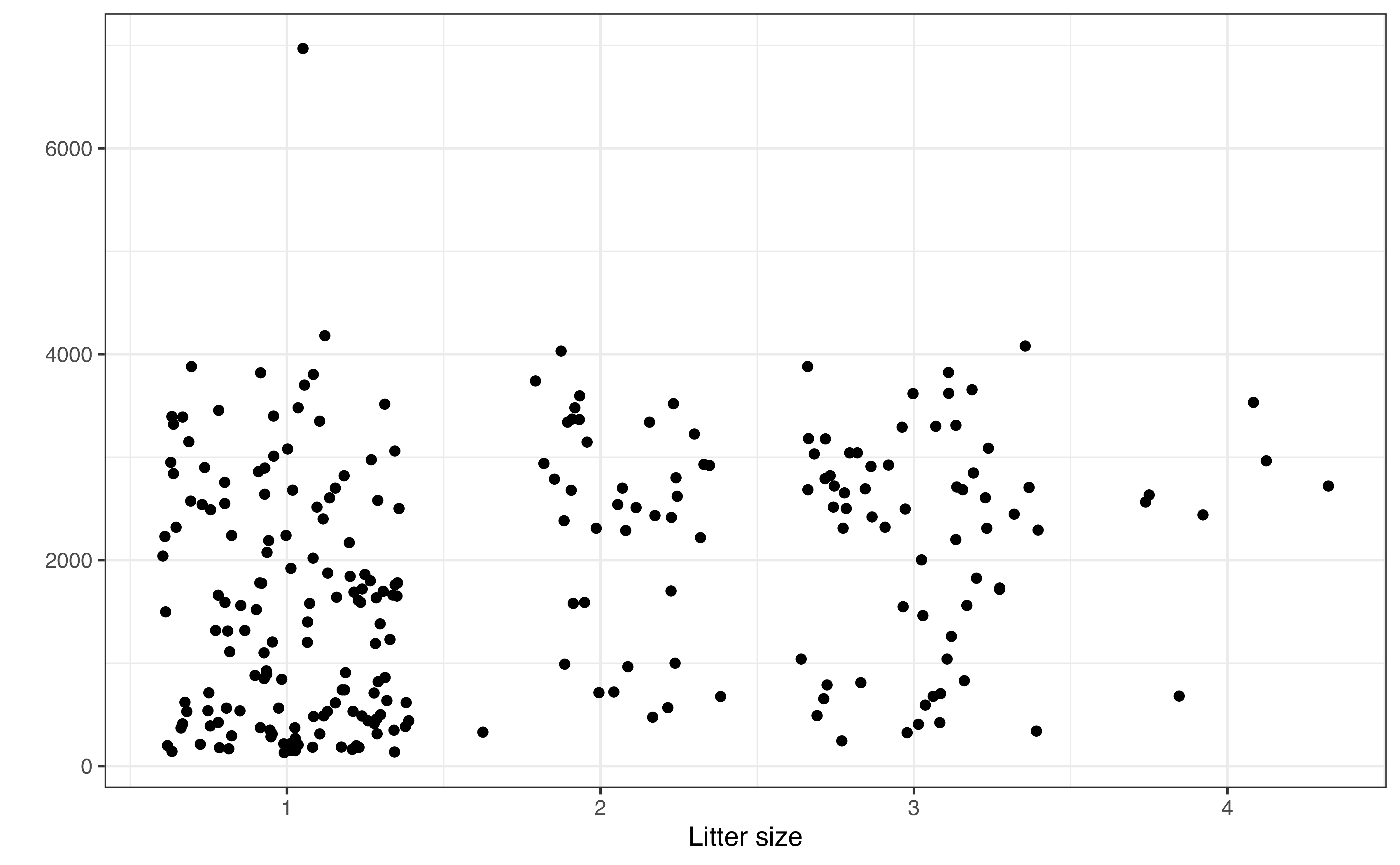 Figure 7.4 (d) shows the relationship between litter_size and weight. Random noise was added to reduce overlap in the points on the graph. This makes it easier to see the relationship between the two variables. Based on this scatterplot, the relationship between litter_size and weight appears to be positive and relatively weak.