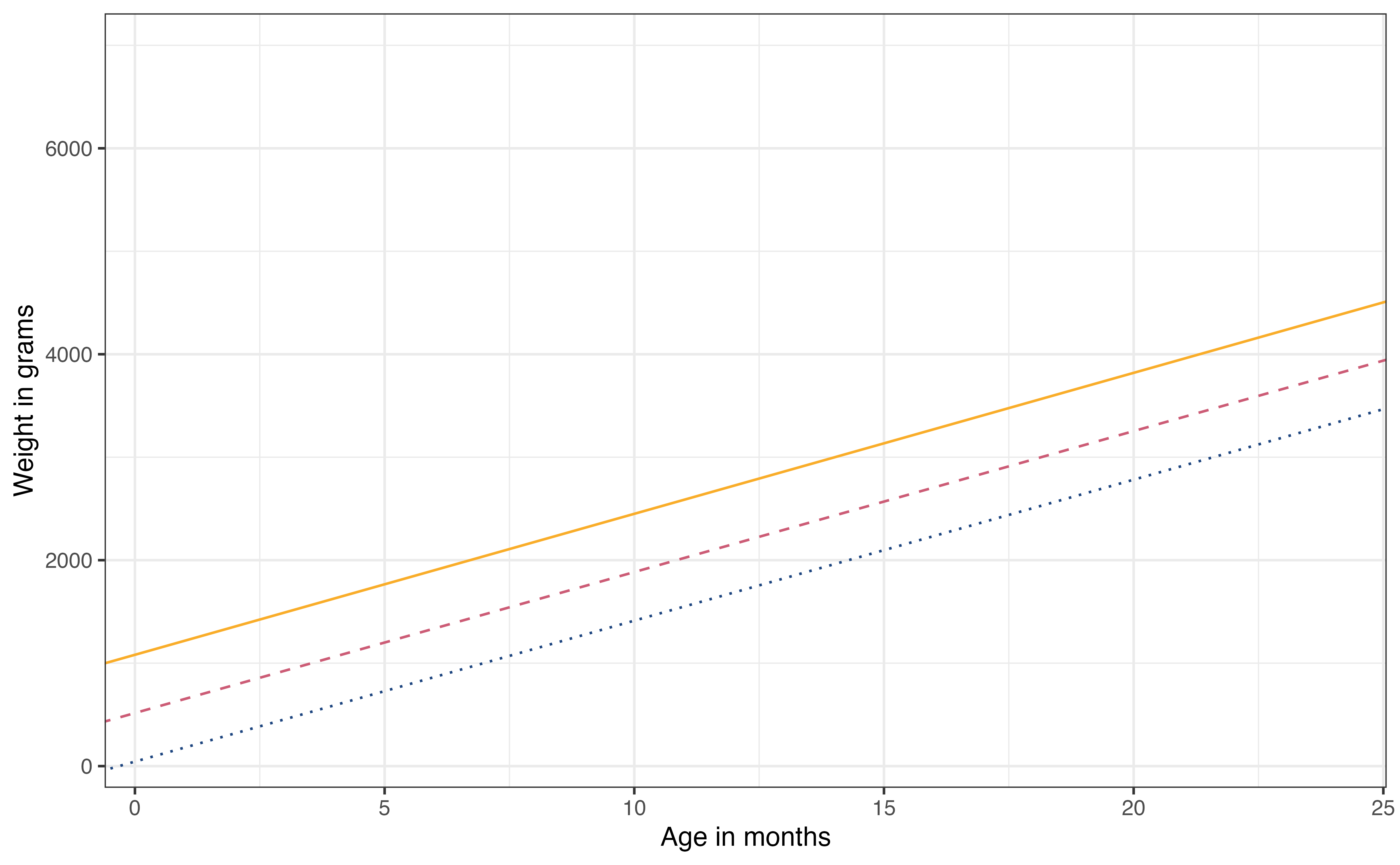 The slope of age for lemurs in the VRUB taxon is 127.931 (78.579 + 49.352). This means that among VRUB lemurs, for each additional month in age, the weight is expected to be greater by 127.931 grams, on average, holding sex and litter size constant.↩︎