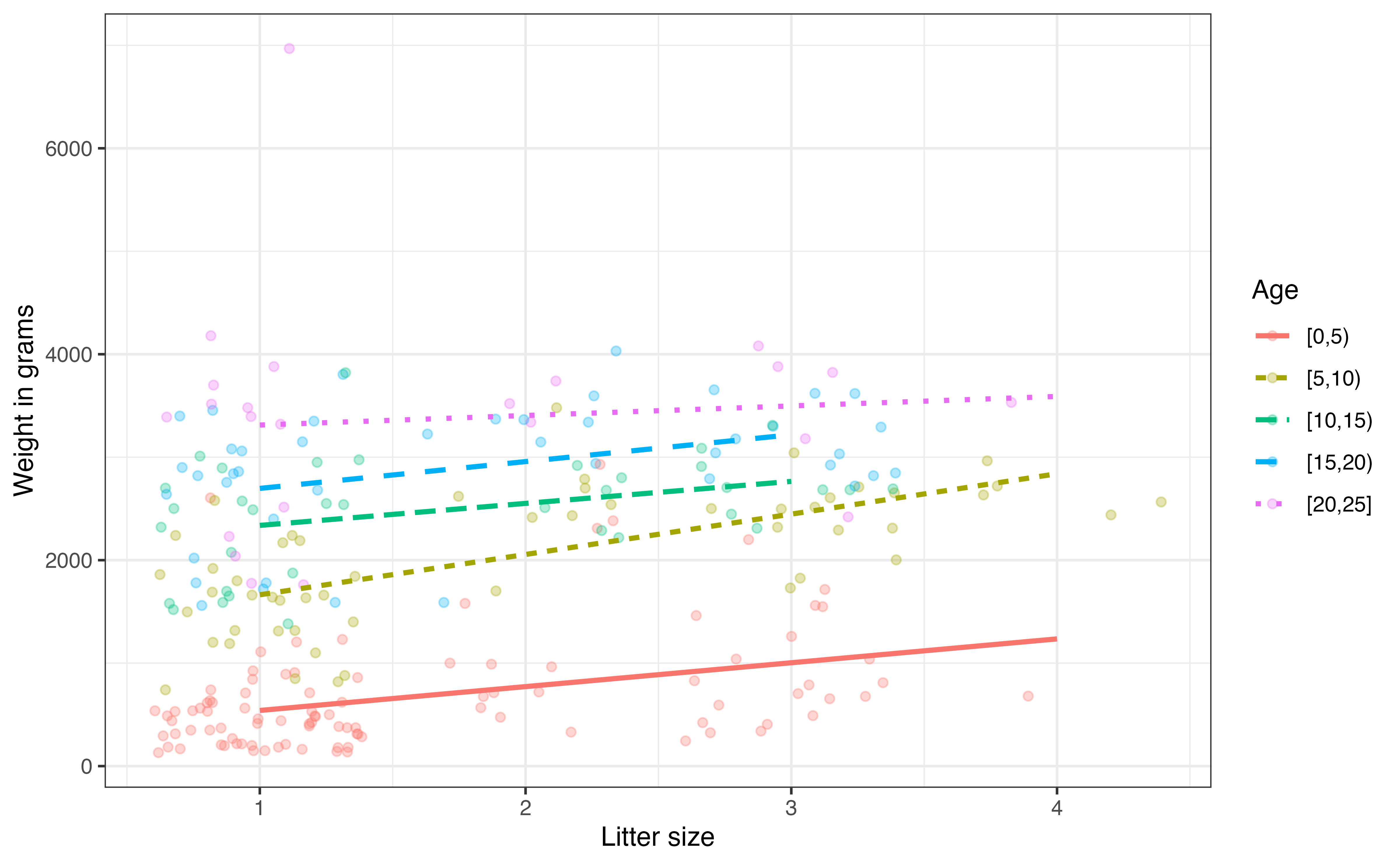 Because we are specifically interested in interpreting how the effect of litter size changes as age changes, we have created bins to mark off age ranges and looked a the scatterplot of litter size and weight for each bin.