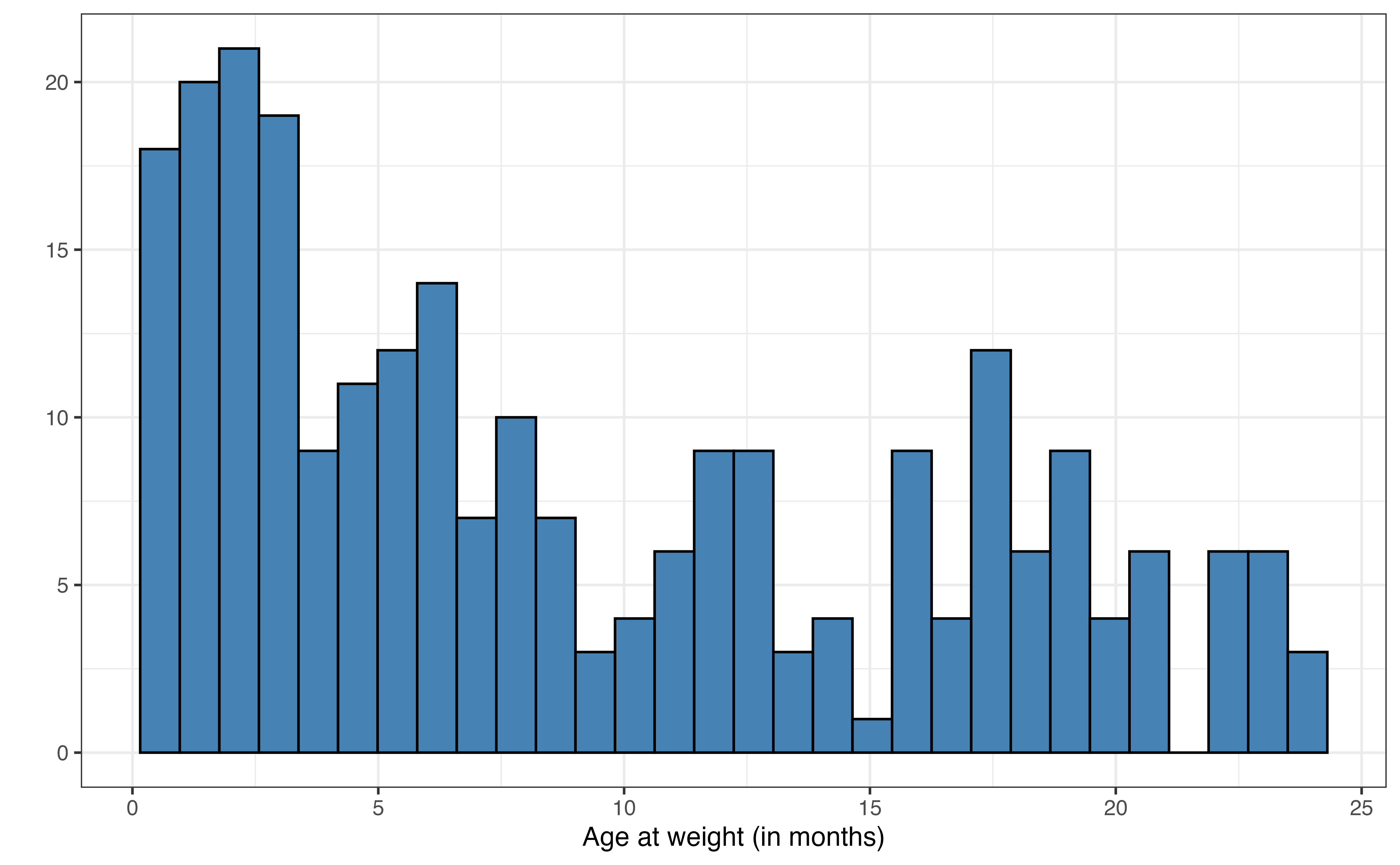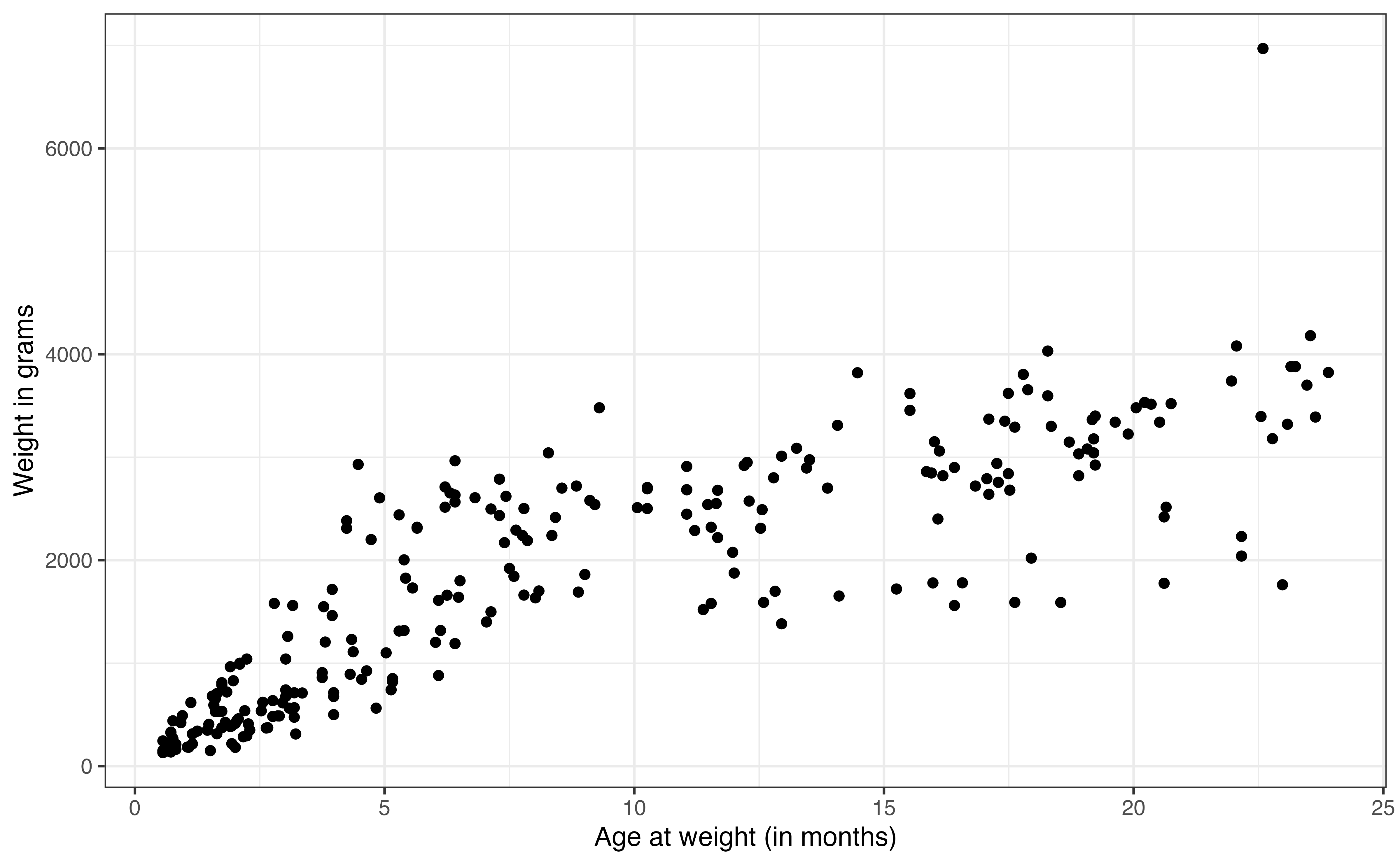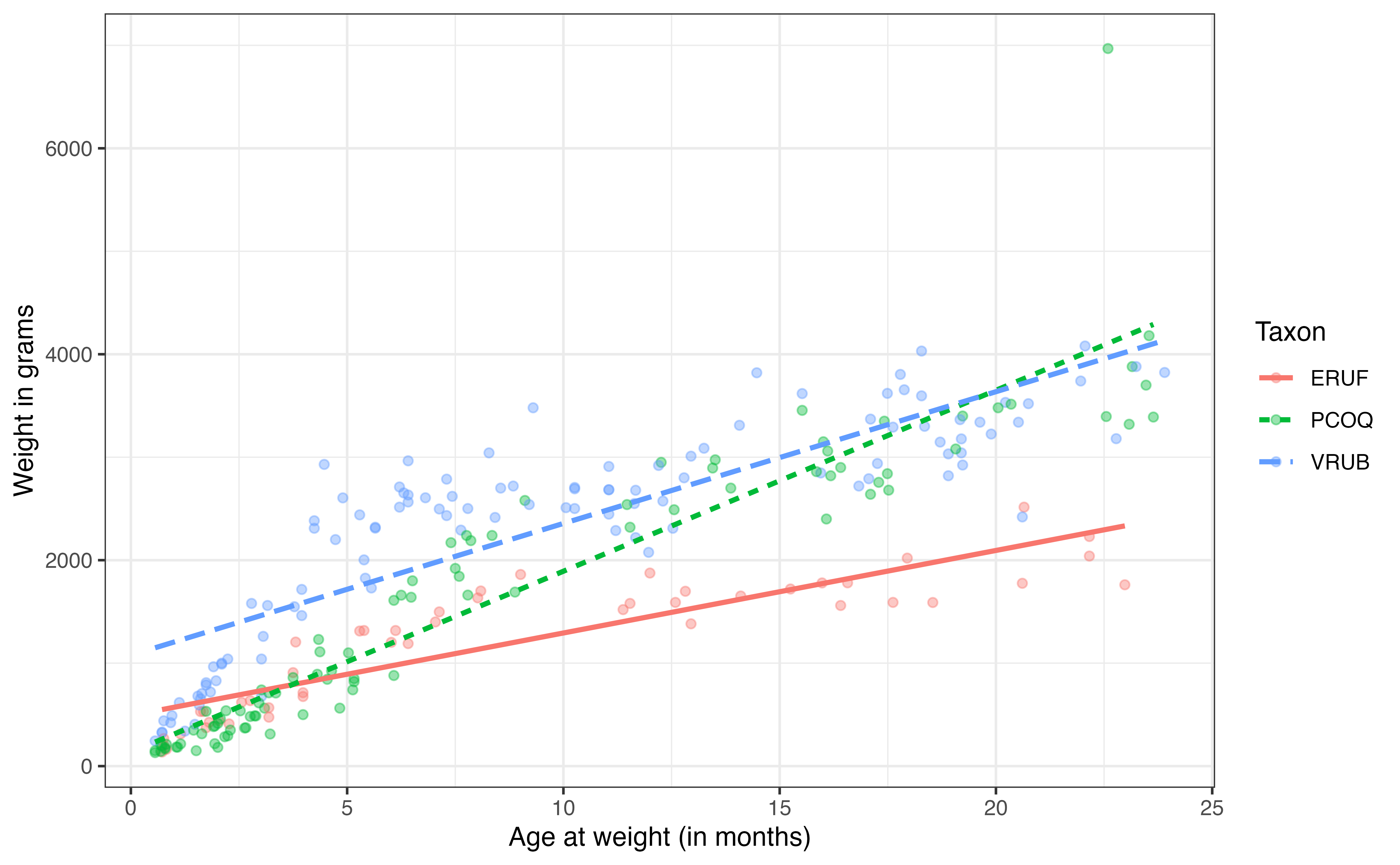 About 95% of lemur species are at risk of extinction, so it is important for researchers to study and better understand lemurs to more effectively save these species (Community 2024). The Duke Lemur Center currently has over 250 lemurs from 12 species. It has the most diverse population of lemurs outside of Madagascar, the native home for lemurs (Duke Lemur Center n.d.). In this chapter, we will use various characteristics to understand the variability in the weight of lemurs who are 24 months old or younger. We refer to this group of lemurs as “young lemurs” throughout the analysis. The data contains the weight and other features of young lemurs from three taxon (ERUF, PCOQ, and VRUB) who lived at the Duke Lemur Center at the time the data were collected. The data were originally from Zehr et al. (n.d.) and were featured as part of the TidyTuesday weekly data visualization challenge in August 2021 (Community 2024).