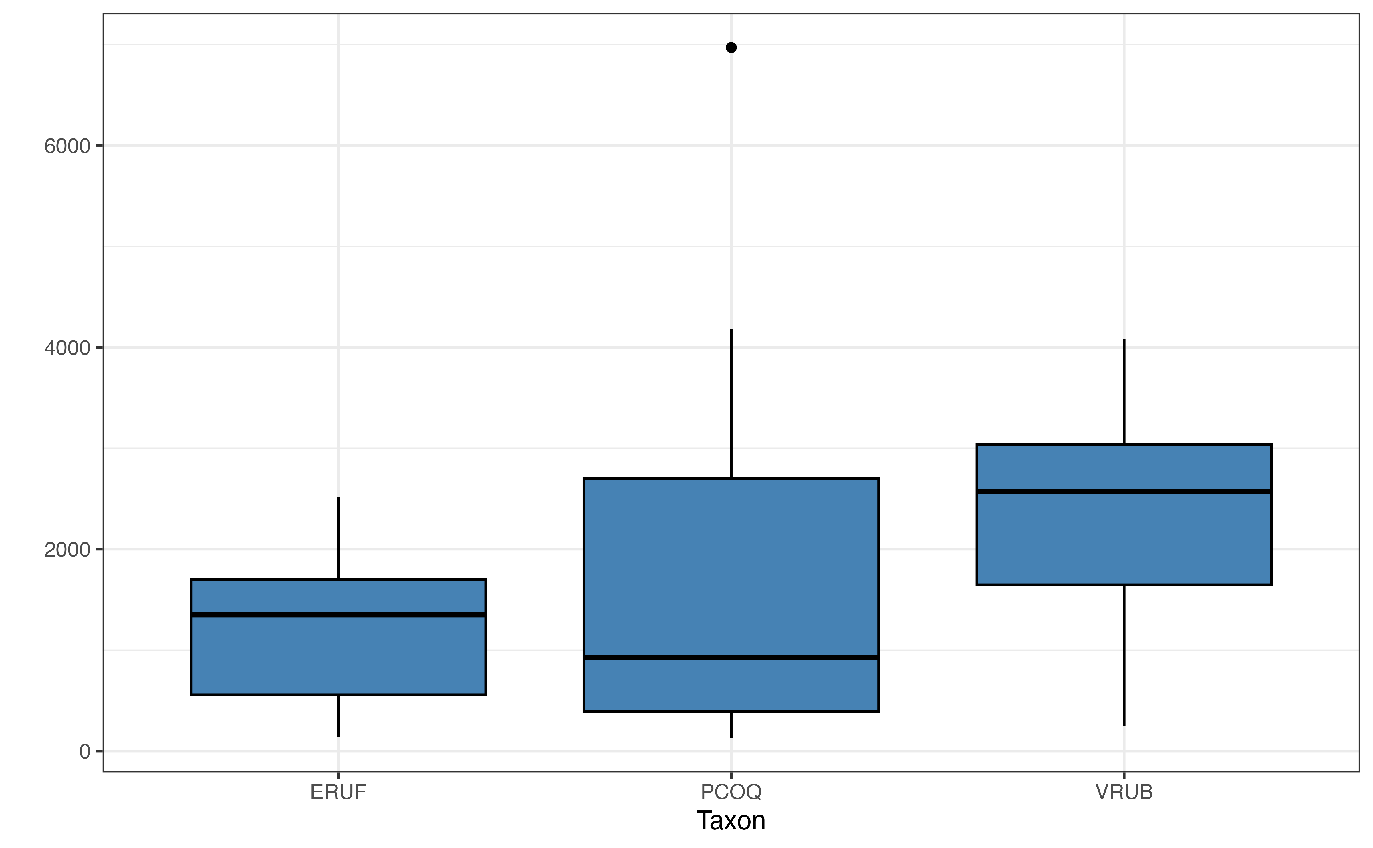 In Figure 7.4 (b), lemurs from the PCOQ taxon have a lower median weight than lemurs from ERUF or VRUB: however, there is a lot of overlap in the distribution of weights of ERUF and PCOQ lemurs. Lemurs in the VRUB taxon have the highest median weight; however, the middle 50% of the distribution overlaps greatly with the distribution for PCOQ lemurs. There is more variability in the weights of PCOQ lemurs compared to ERUF and VRUB, and we see the lemur with the outlier weight is in the PCOQ taxon.