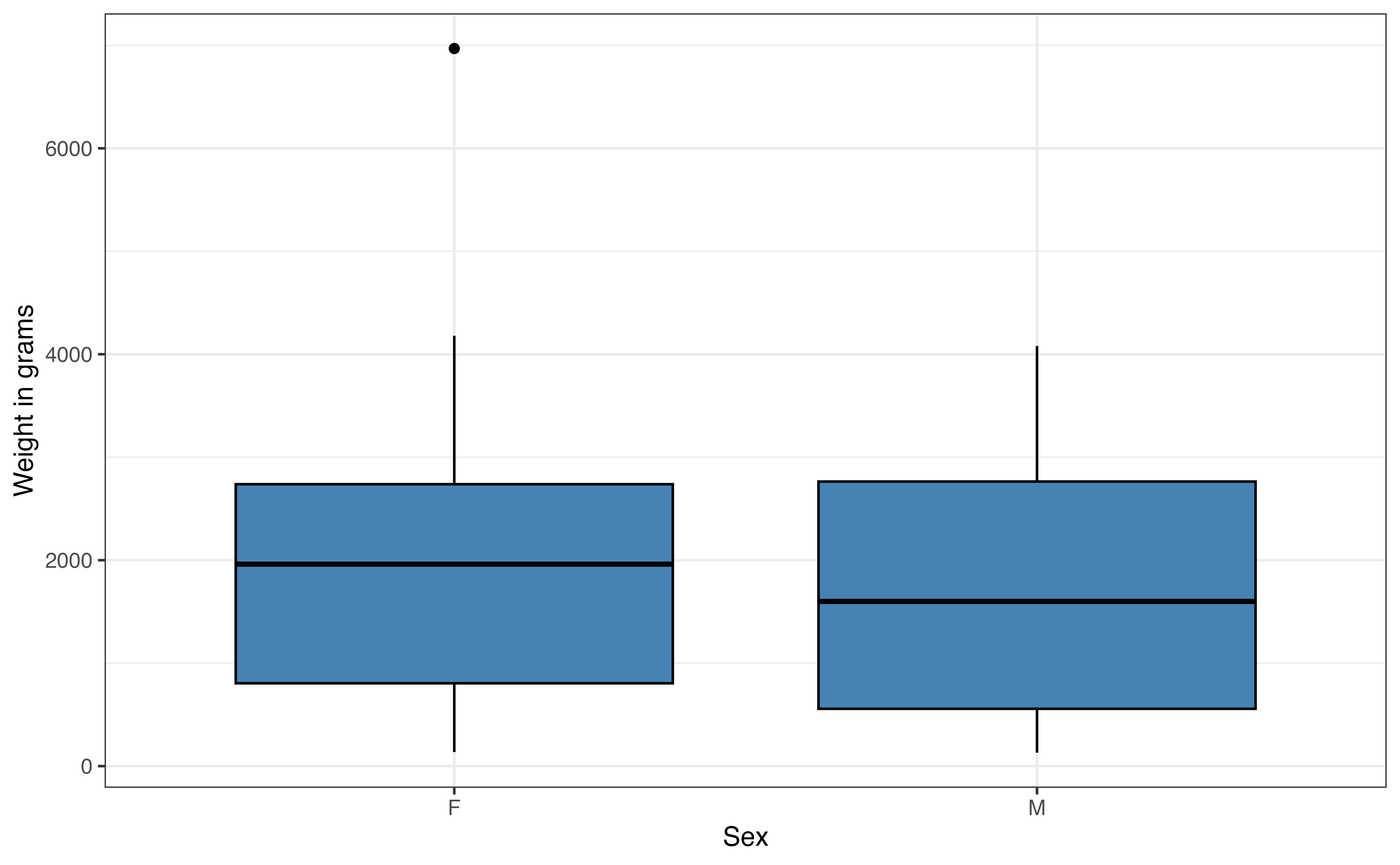 The interaction between sex and taxon would also tell us if the relationship between taxon and weight differs by sex. We have decided to interpret the interaction effect in the other direction given it is more practically meaningful to understand differences between sexes within each taxon versus the other way around.↩︎