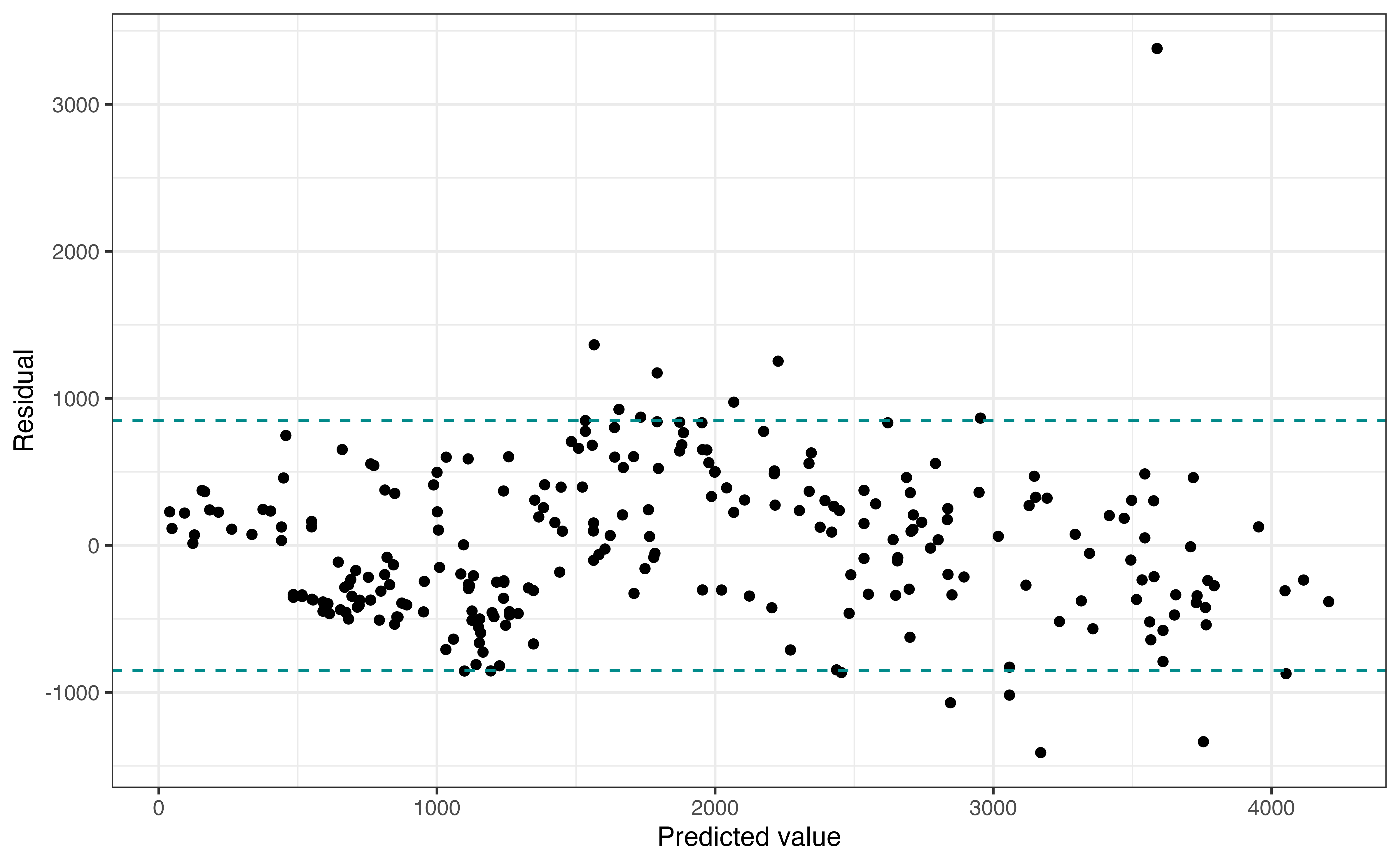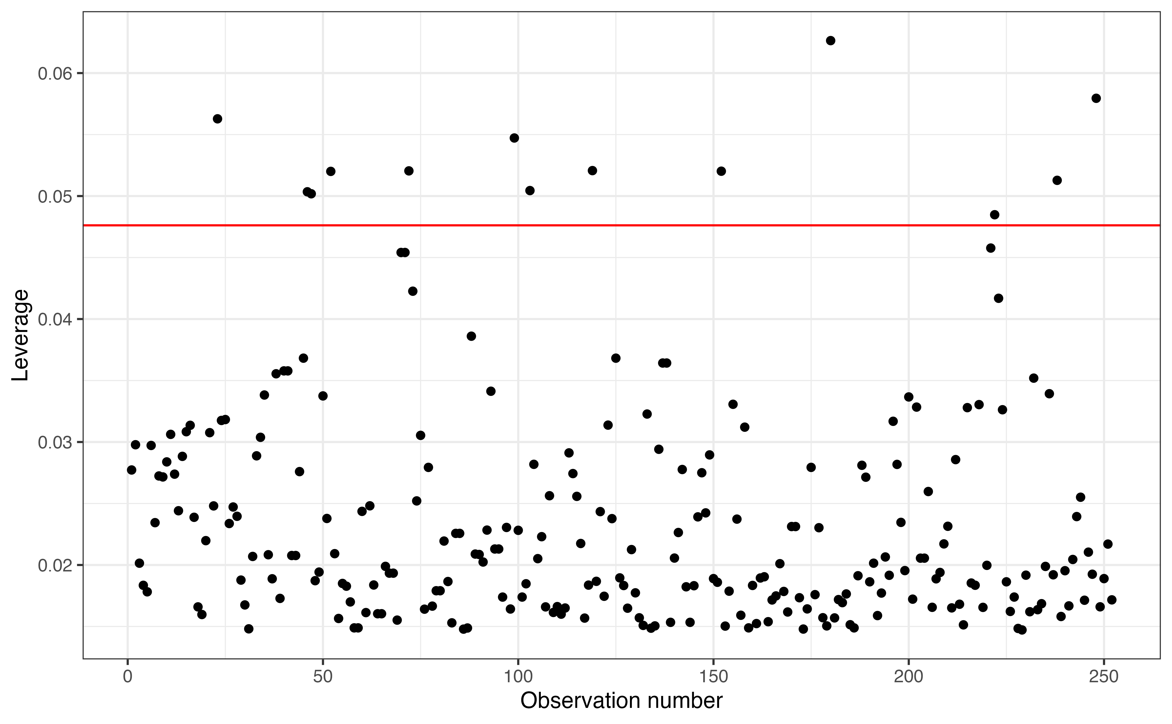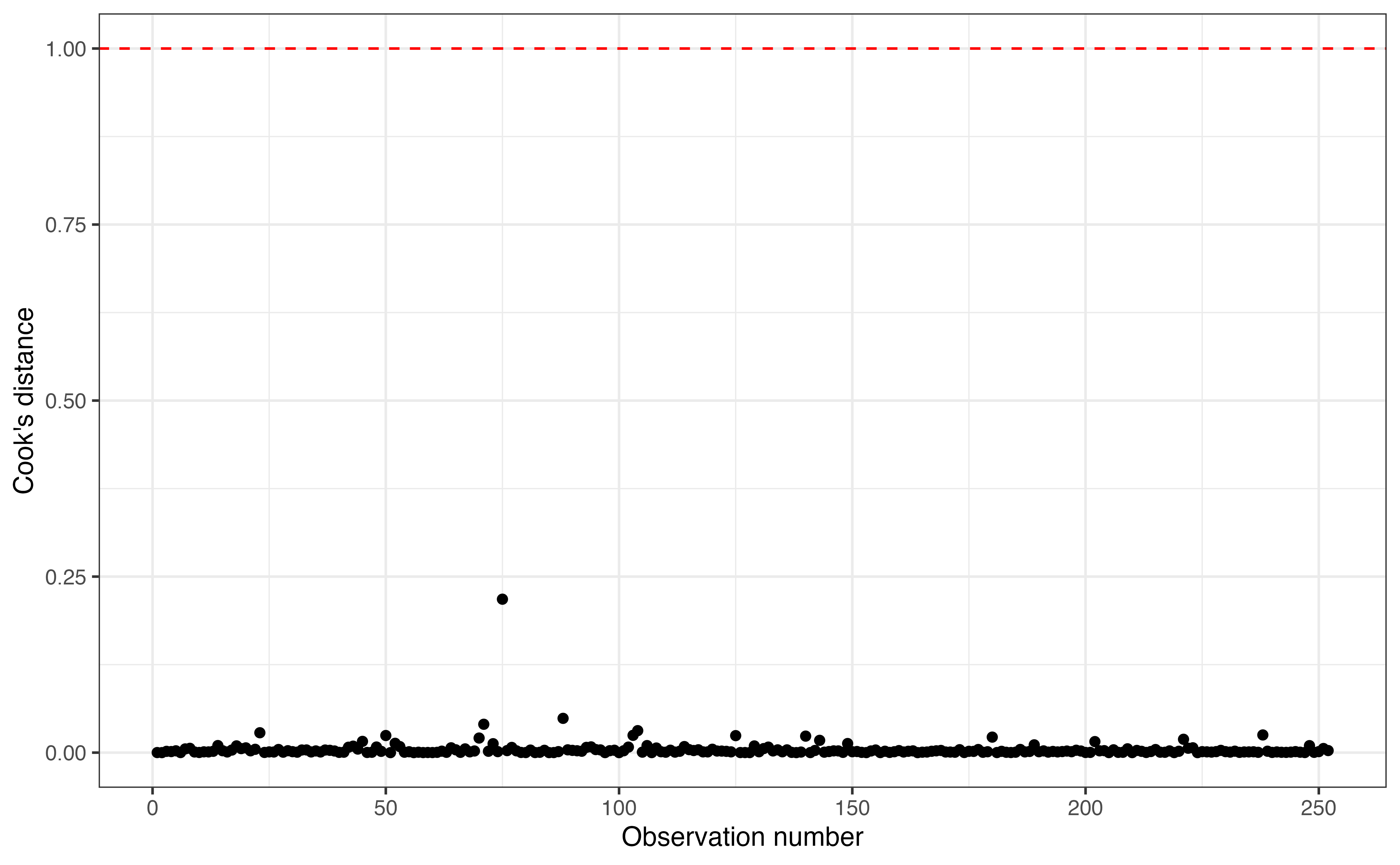 We did not have any influential points in this analysis, but there will be times when do have such points in modeling. Section 6.4.5 discuses strategies for handling influential points in modeling.