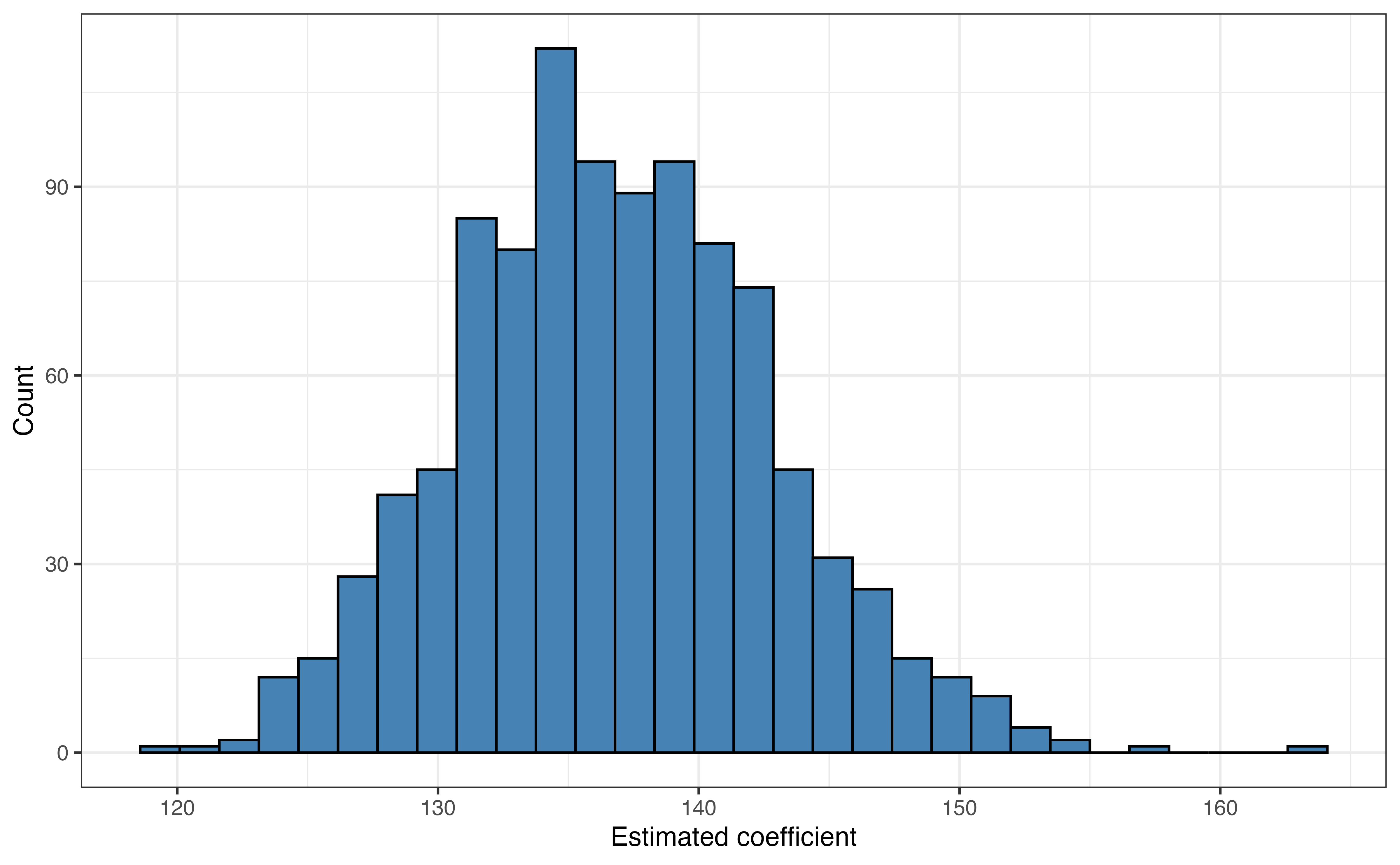 Figure 8.1 is the bootstrap sampling distribution for \(\hat{\beta}_{age}\). The mean of the distribution is 136.809 and the standard deviation is 5.97. The mean of the bootstrap distribution is very close to the estimated coefficient of age in the original model in Table 8.1. These values will not be exactly equal, because the bootstrap distribution is constructed from a simulation-based process that itself involves sampling. Given a confidence level \(C\), the \(C\%\) confidence interval is the middle \(C\%\) of the bootstrap distribution. \(C\) is generally set between 90 and 99, to balance accuracy and precision (see Section 5.4), with 95 being a commonly used default value.