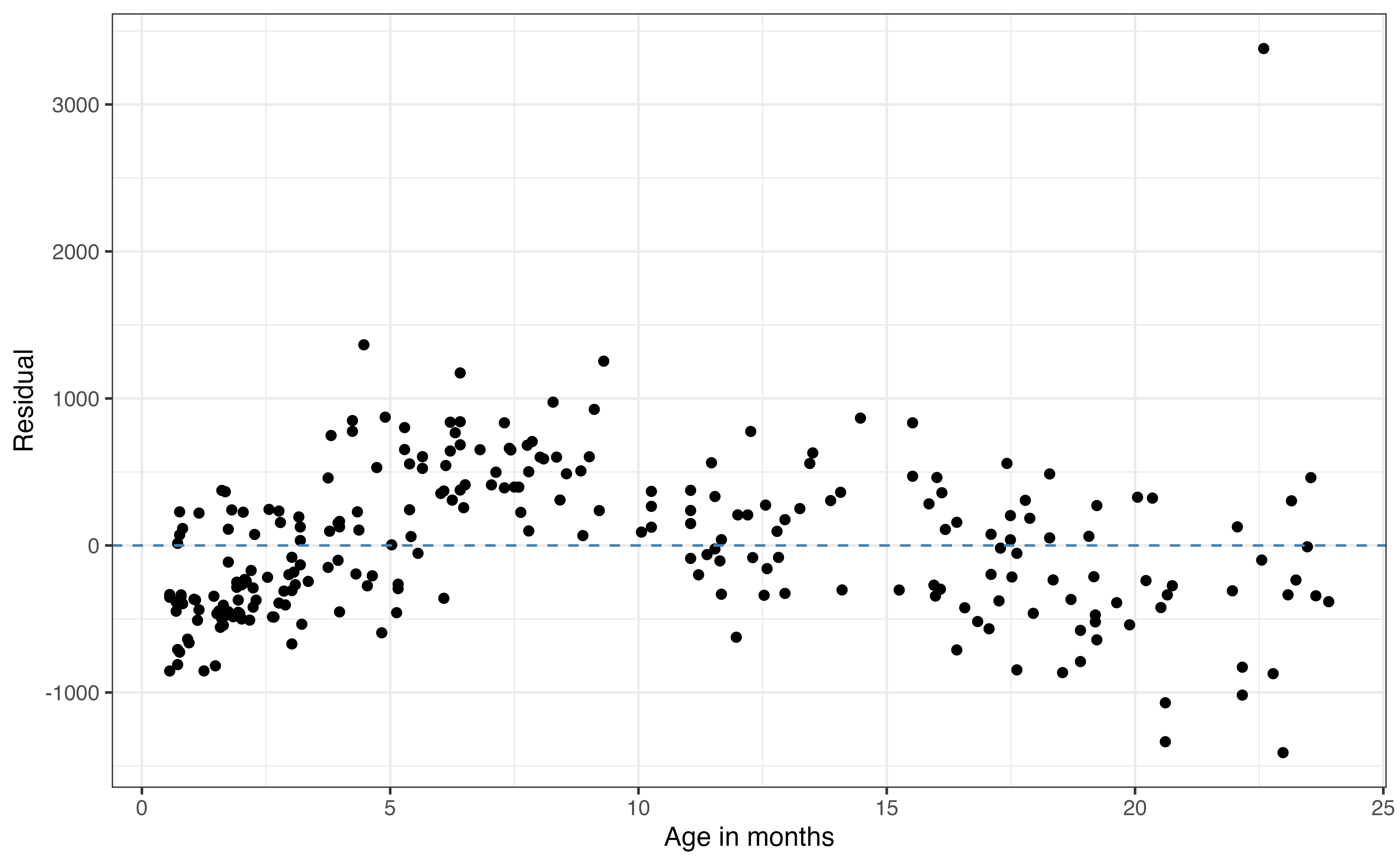 The residual means that the observed weight for this lemur is 3380.42 grams greater than the weight predicted by the model. The standardized residual means that the residual for this observation is 6.442standard errors above the mean of the distribution of residuals.↩︎