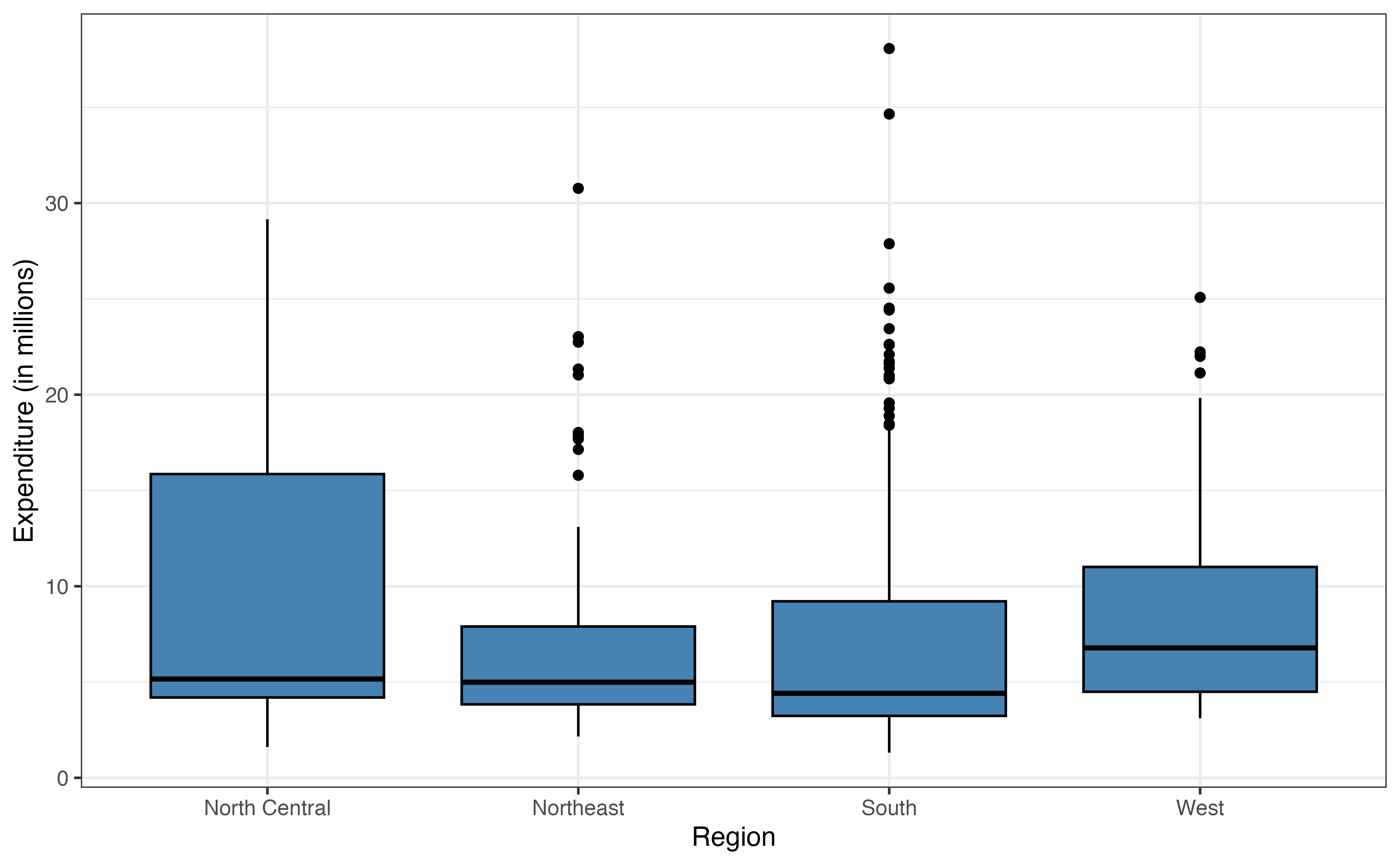 Though these interpretations are technically correct, it is difficult to fully comprehend what a change in log(millions of dollars) to the log(expenditure) really means. Therefore, we need to get back to the original variable (expenditure_m) and back to the original units (millions of dollars) to write an interpretation that is more intuitive.