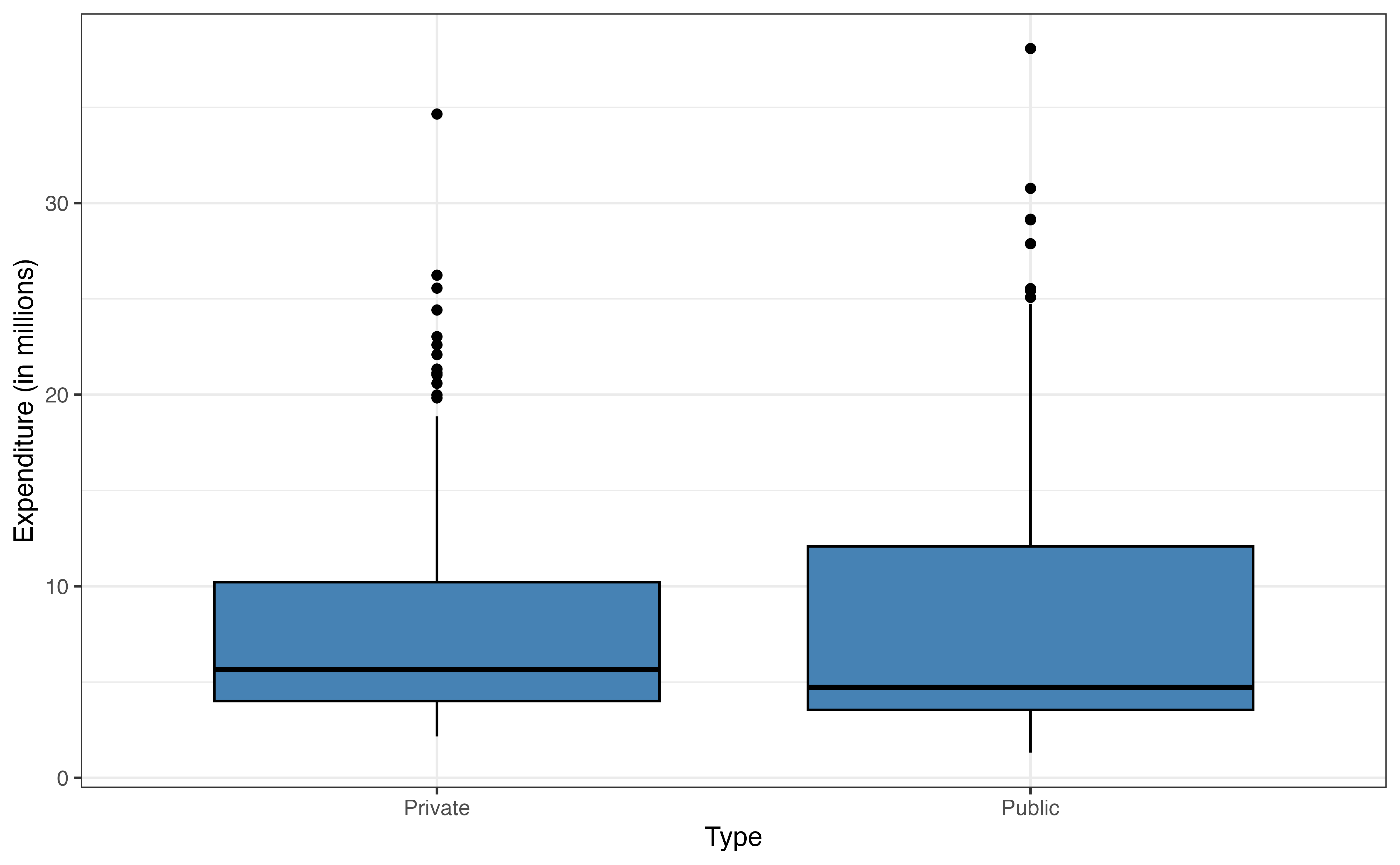 We interpreted the relationship between enrollment and expenditure and how it differs for public and private colleges. But what if we wish to just describe how expenditure differs between public and private colleges, on average?