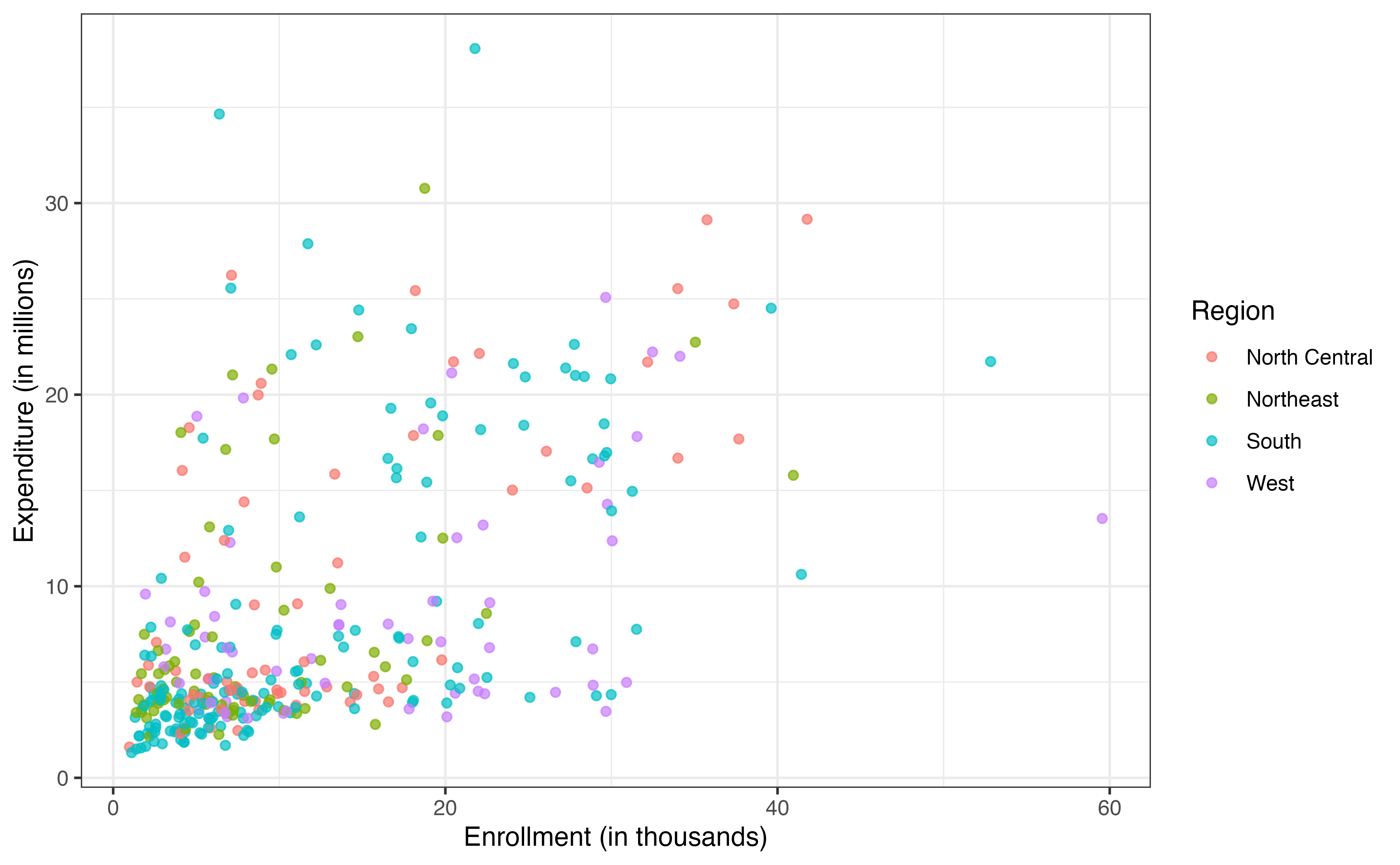 The plot also shows two other interesting features of the relationship. The first is that the variability in the expenditure increases as enrollment increases. Thus, there is more variability in how much colleges with larger enrollments spend on basketball programs compared to colleges with small enrollments. We will keep this issue of the changing variability in mind as we fit a model and evaluate the model conditions. The second observation is the appearance of a “V” shape in the trend, indicating two different trajectories. This could be an indication of a potential interaction, so let’s look at multivariate plots to explore a potential interaction between enrollment and type and one between enrollment and region.