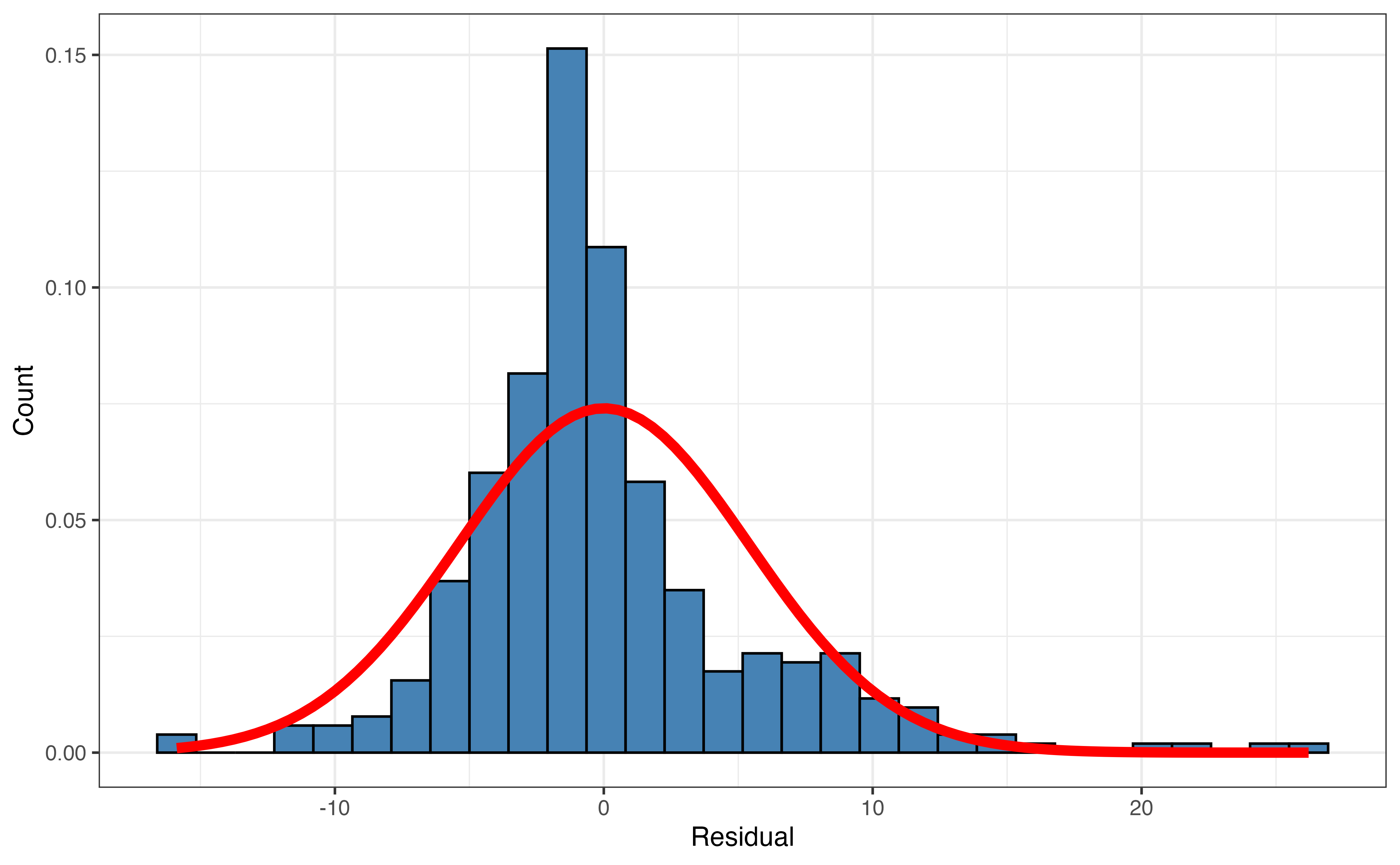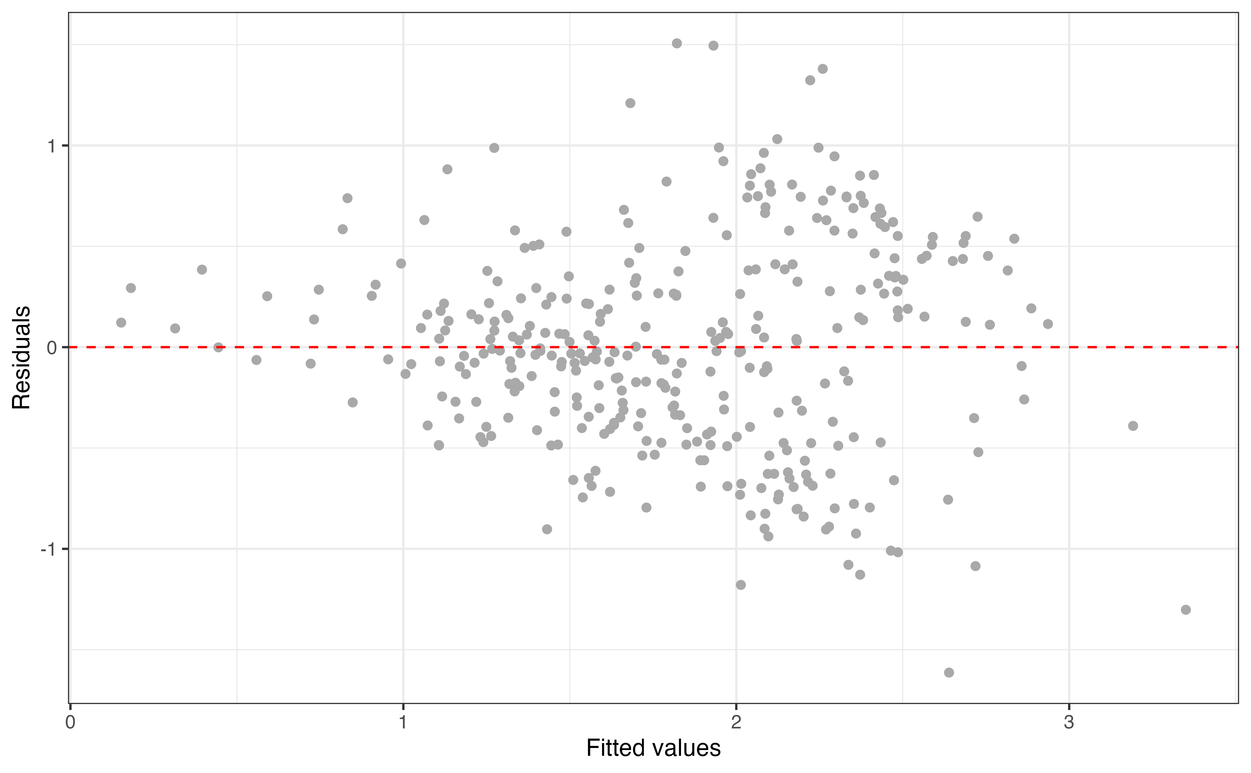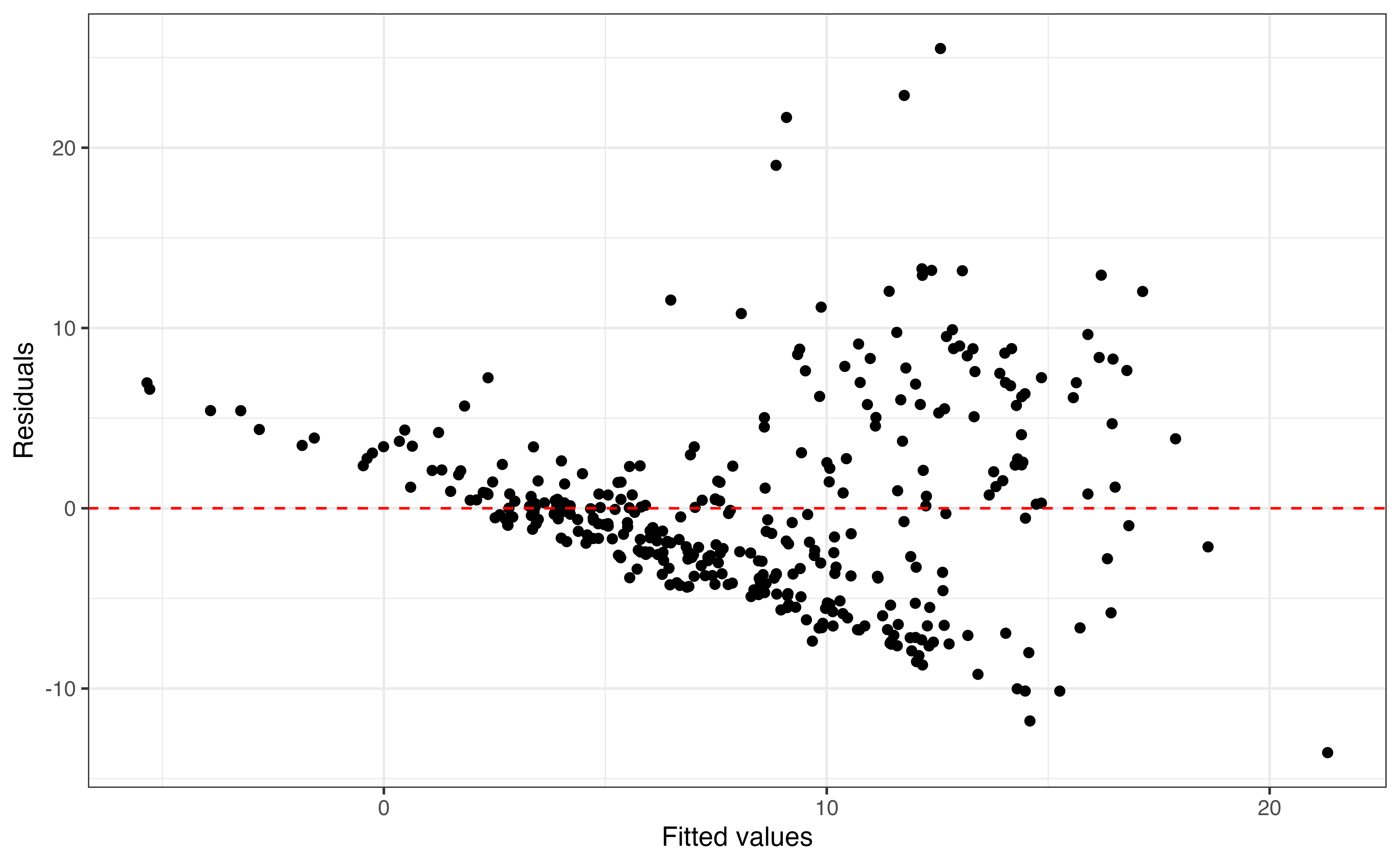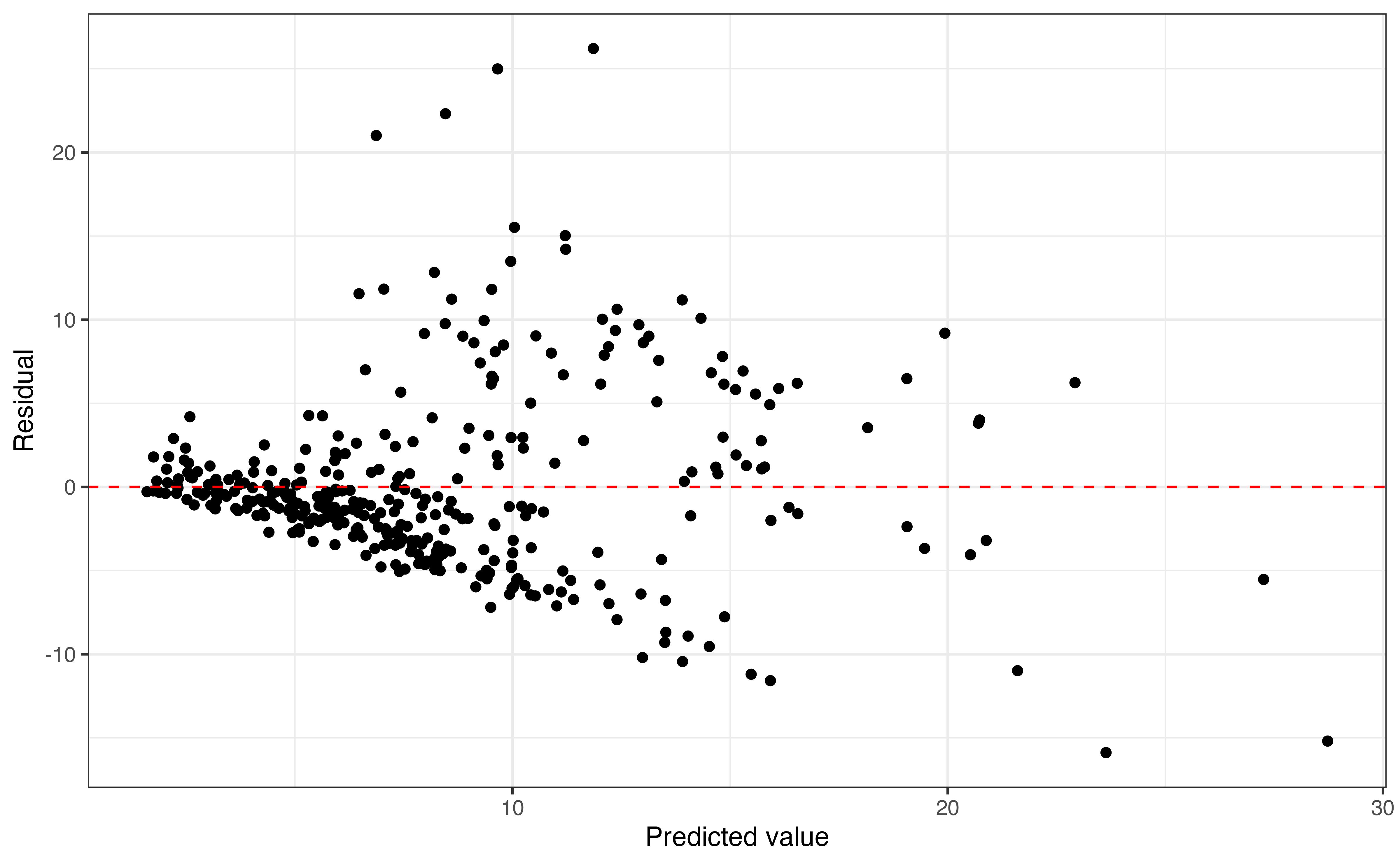 The plot of residuals versus predicted variables in Figure 9.5 shows a clear violation in the equal variance condition based on the fan-shaped pattern of the residuals when moving from left to right. Recall from Section 6.3 that it is necessary to satisfy the equal variance condition when doing theory-based inference (the inference results produced by output), because it relies on a single estimate of \(\hat{\sigma}_{\epsilon}\), the regression standard error (variability about the regression line). We can easily see in Figure 9.5 that a single value would not be representative of the vertical spread of the residuals for all predicted values. Thus, the inferential results in Table 9.2 should be interpreted with caution.