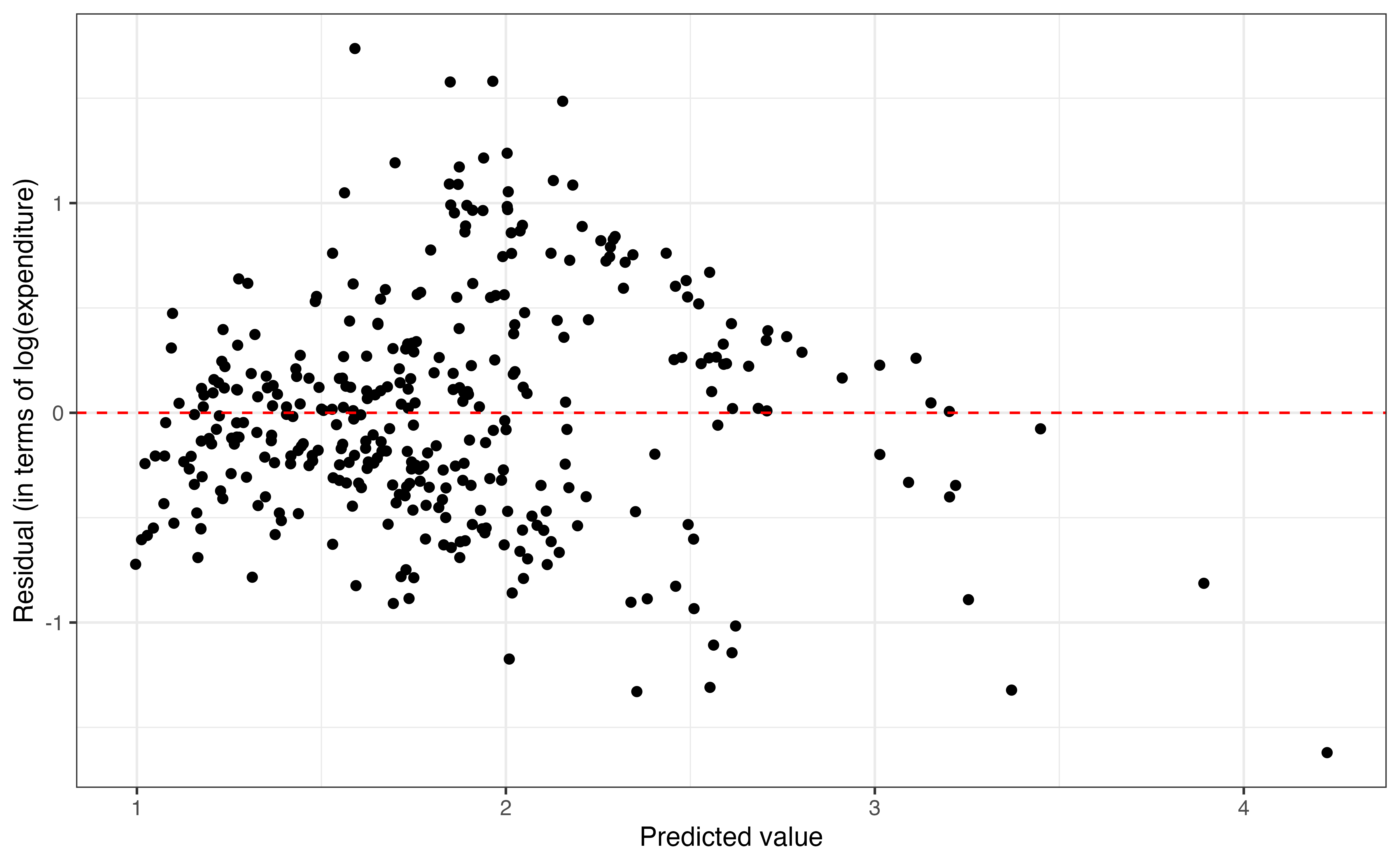 For readability, we won’t present results in terms of log-transformed expenditure, so we get back to the original response variable expenditure_m.