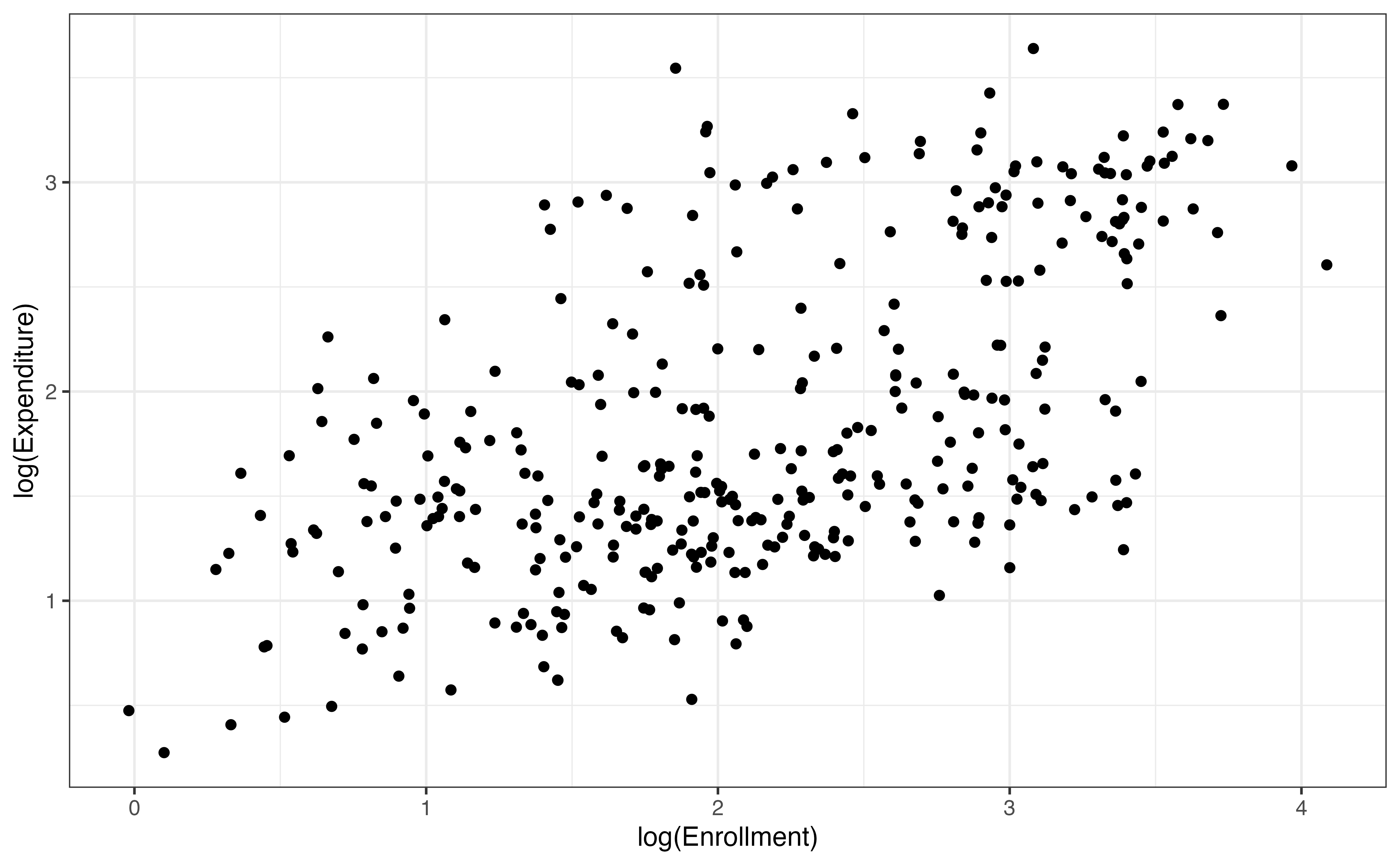 \[ \begin{aligned} \log(\text{expenditure\_m}_i) = \beta_0 &+ \beta_1 \log(\text{enrollment\_th}_i) + \beta_2\text{Northeast}_i + \beta_3\text{South}_i \\ &+ \beta_4\text{West}_i + \beta_5\text{Public}_i + \epsilon_i \hspace{5mm} \epsilon_i \sim N(0, \sigma^2_{\epsilon}) \end{aligned} \tag{9.7}\]