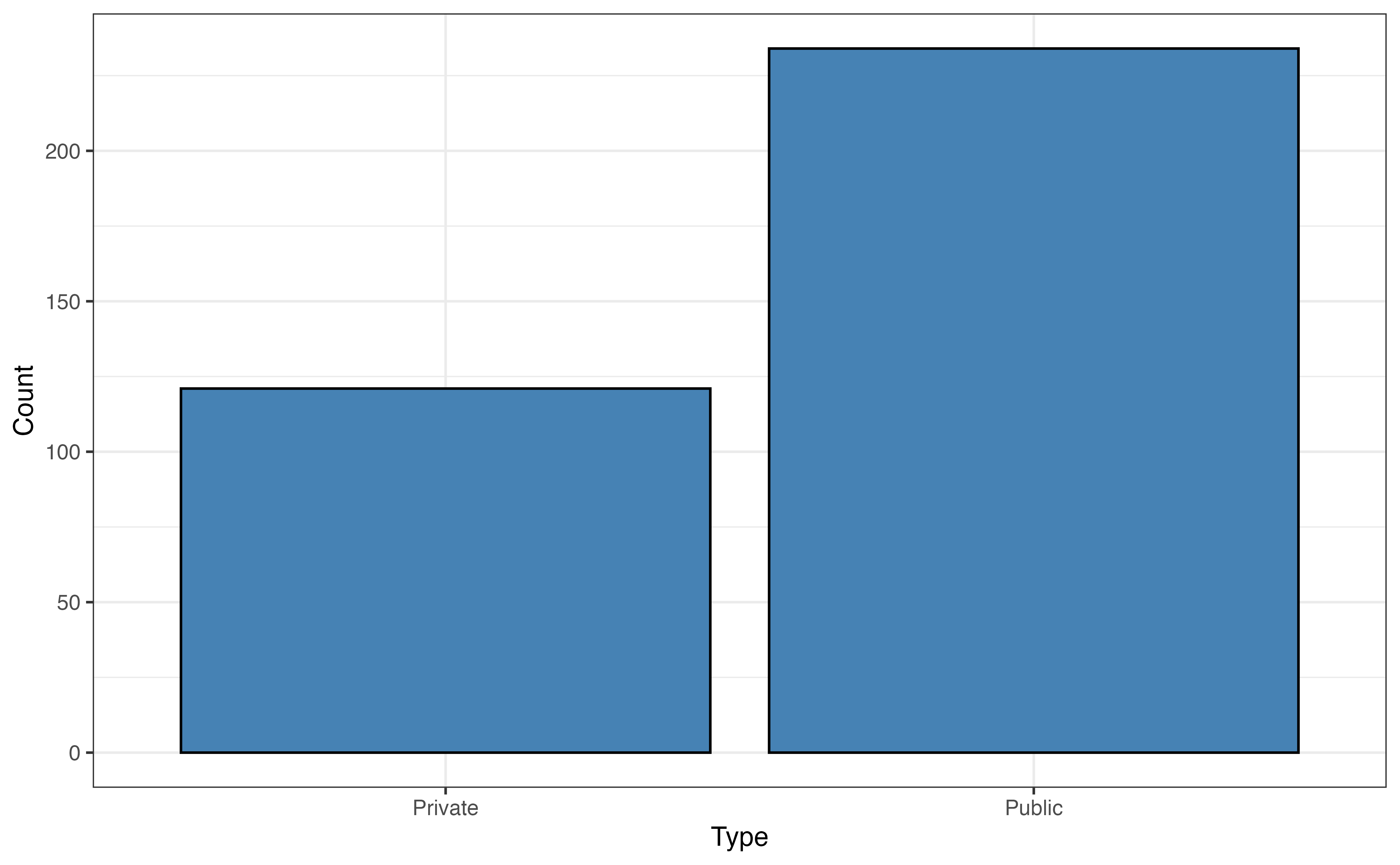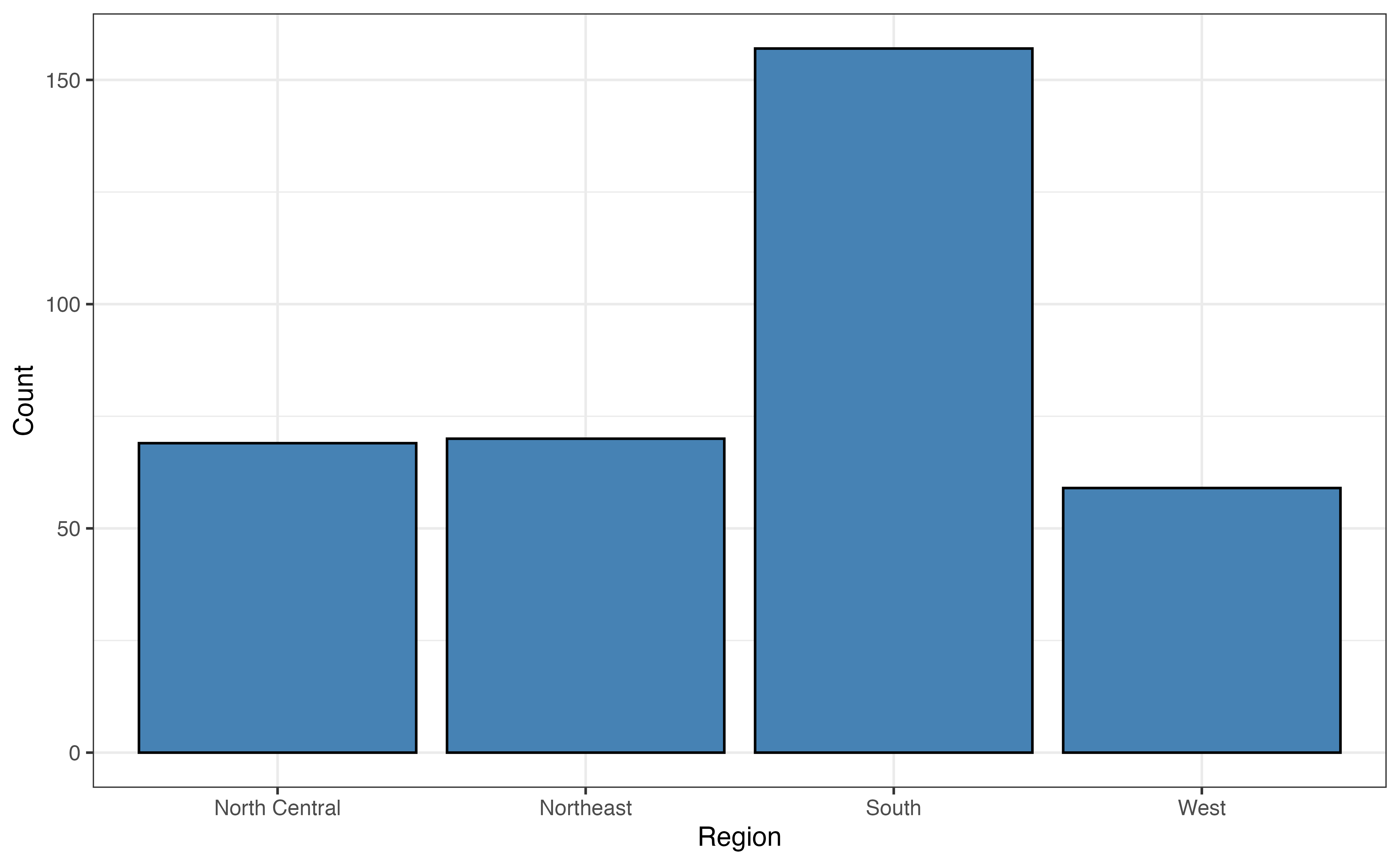 Almost half of the 355 colleges in the data are located in the South region (Figure 9.2 (b)), and about two-thirds of the colleges in the data set are public institutions (Figure 9.2 (c)).