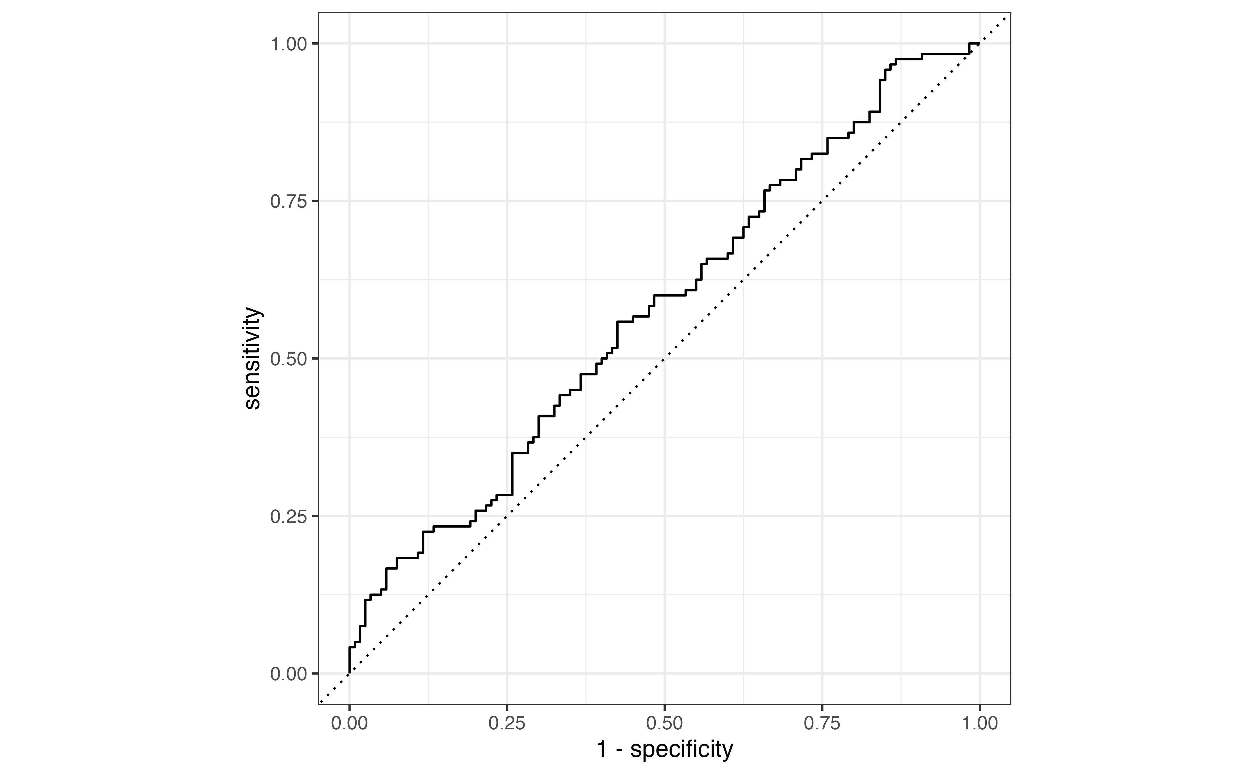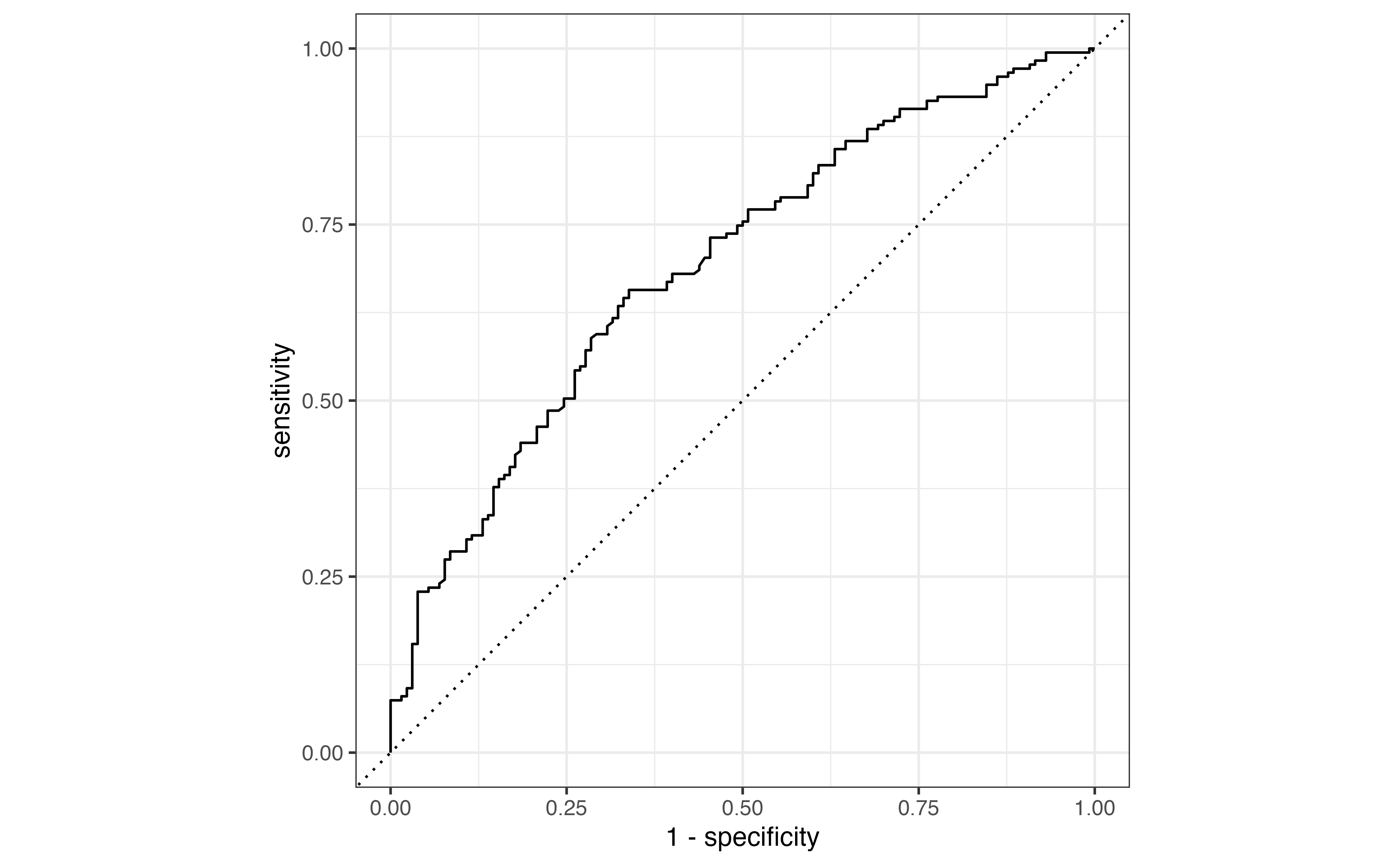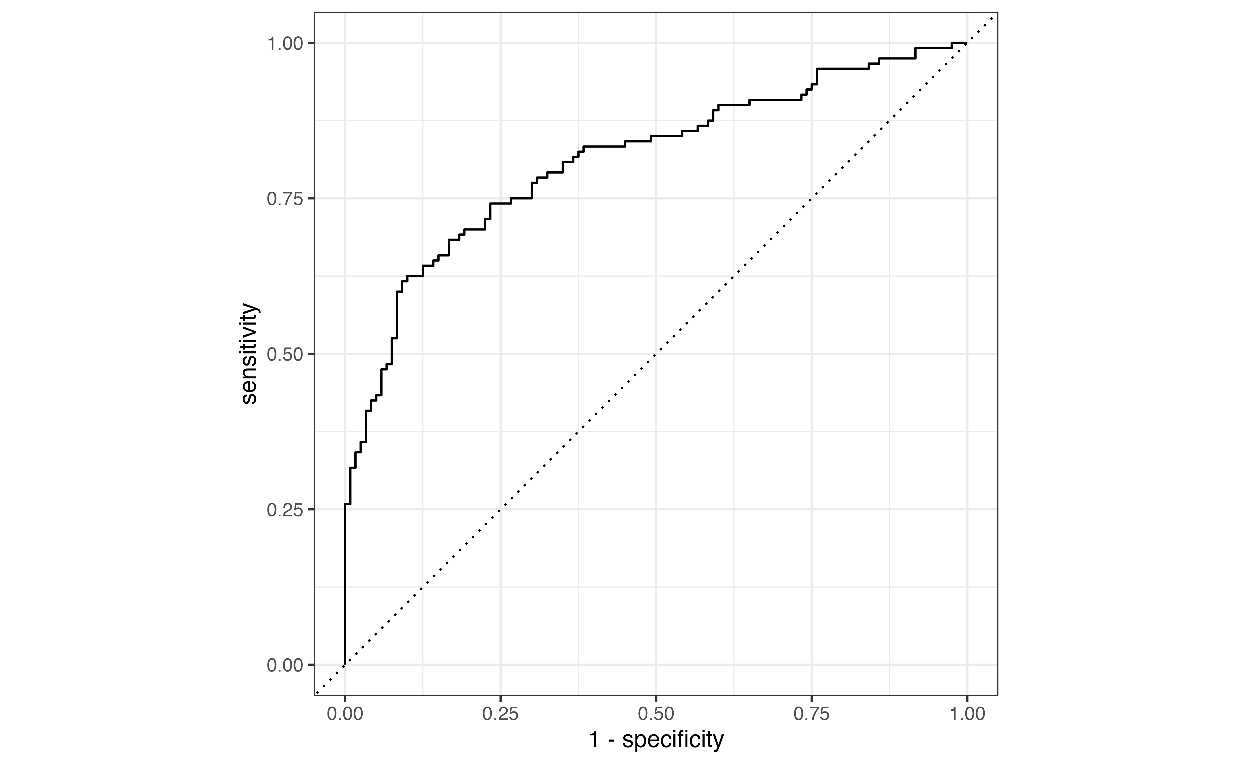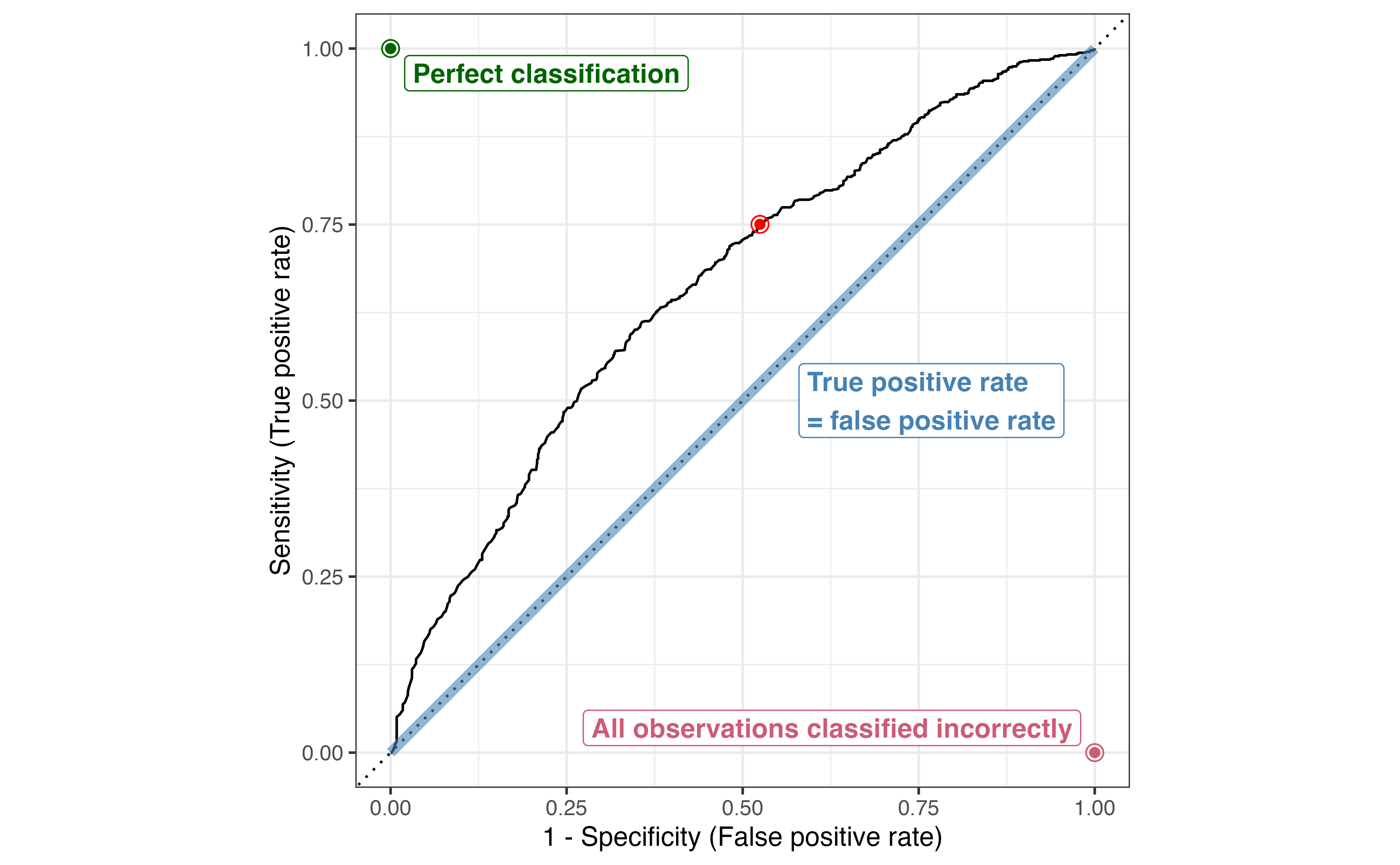 The specificity (true negative rate) is the proportion of those with observed \(y_i = 0\) who were correctly classified as \(\hat{y}_i = 0\).