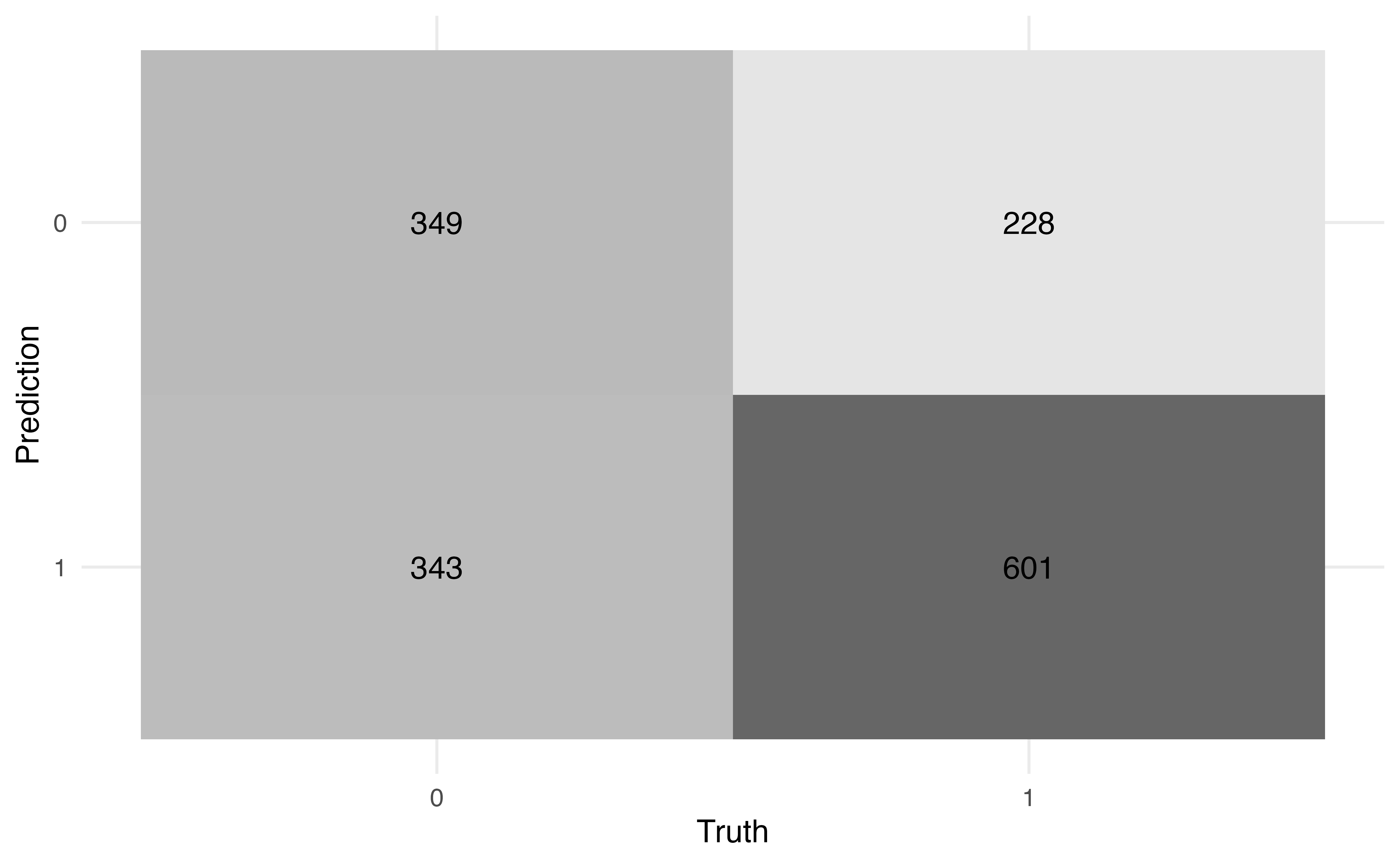 \text{accuracy} = \frac{349 + 601}{349 + 228 + 343 + 601} = 0.625