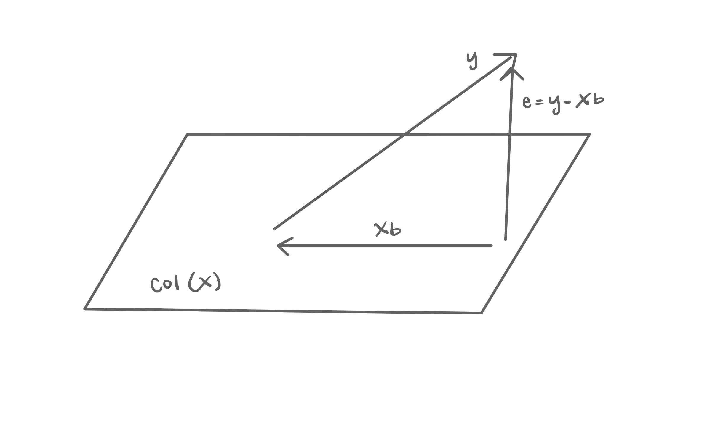 Because \(\mathbf{e}\) is orthogonal to \(\text{Col}(\mathbf{X})\), then \(\mathbf{X}^\mathsf{T}\mathbf{e} = \mathbf{0}\). We plug in \(\mathbf{e} = \mathbf{y} - \mathbf{Xb}\) and solve for \(\mathbf{b}\).